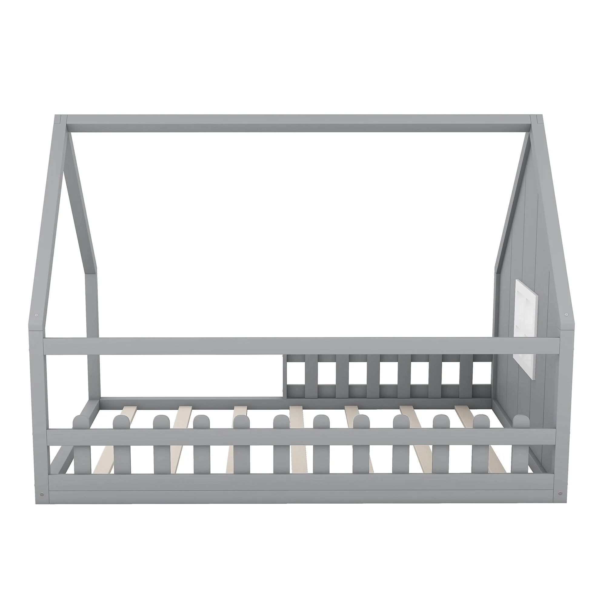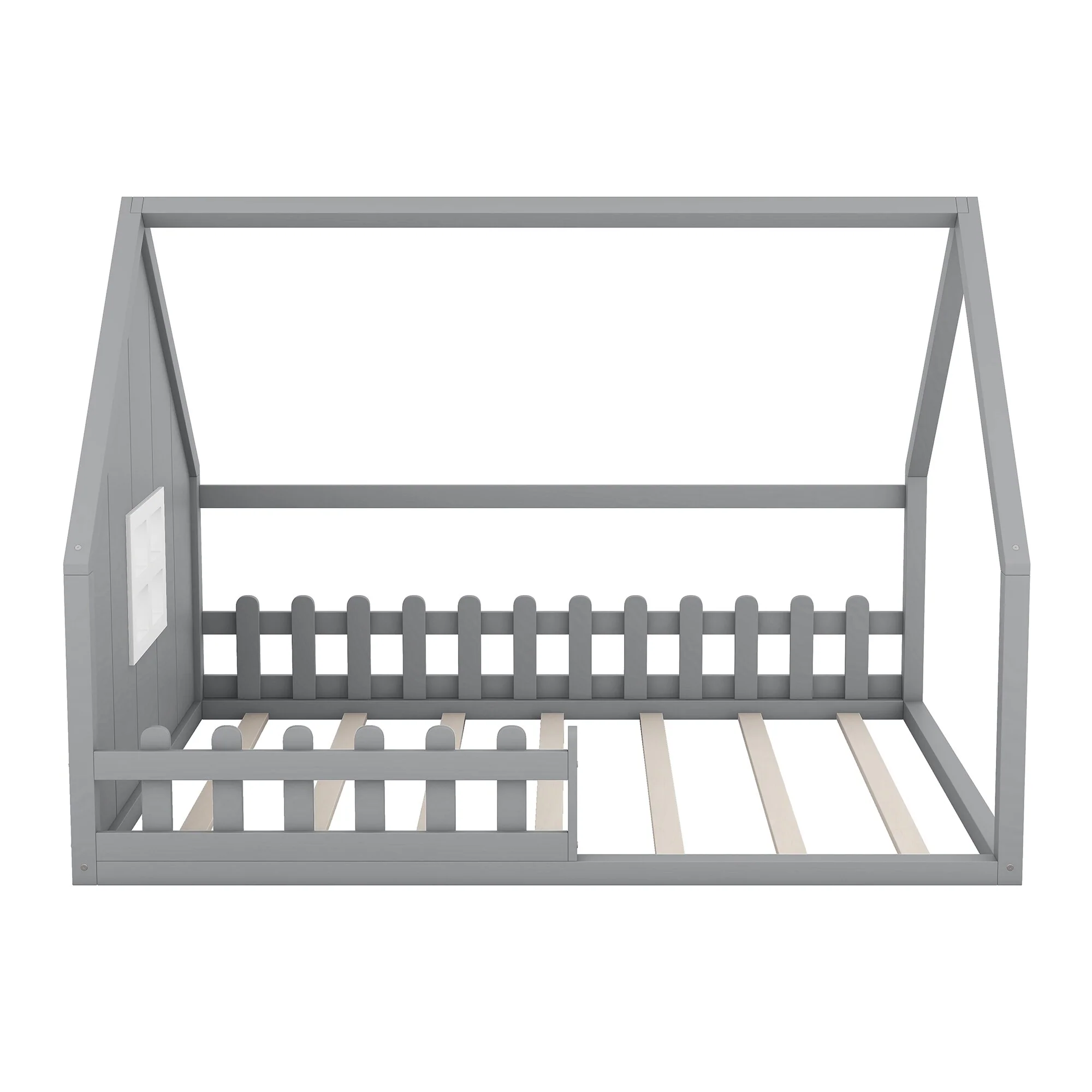 Transform your child's bedroom into an imaginative retreat with this Full Size Wood House Bed. Featuring a playful house-shaped frame complete with a window and fence, this bed invites creativity while offering a cozy and secure place to sleep. Crafted from durable pine wood and MDF, it's designed to withstand everyday use, ensuring that it remains a staple in your home for years to come. The platform bed design eliminates the need for a box spring, making it both a stylish and functional addition to any room.