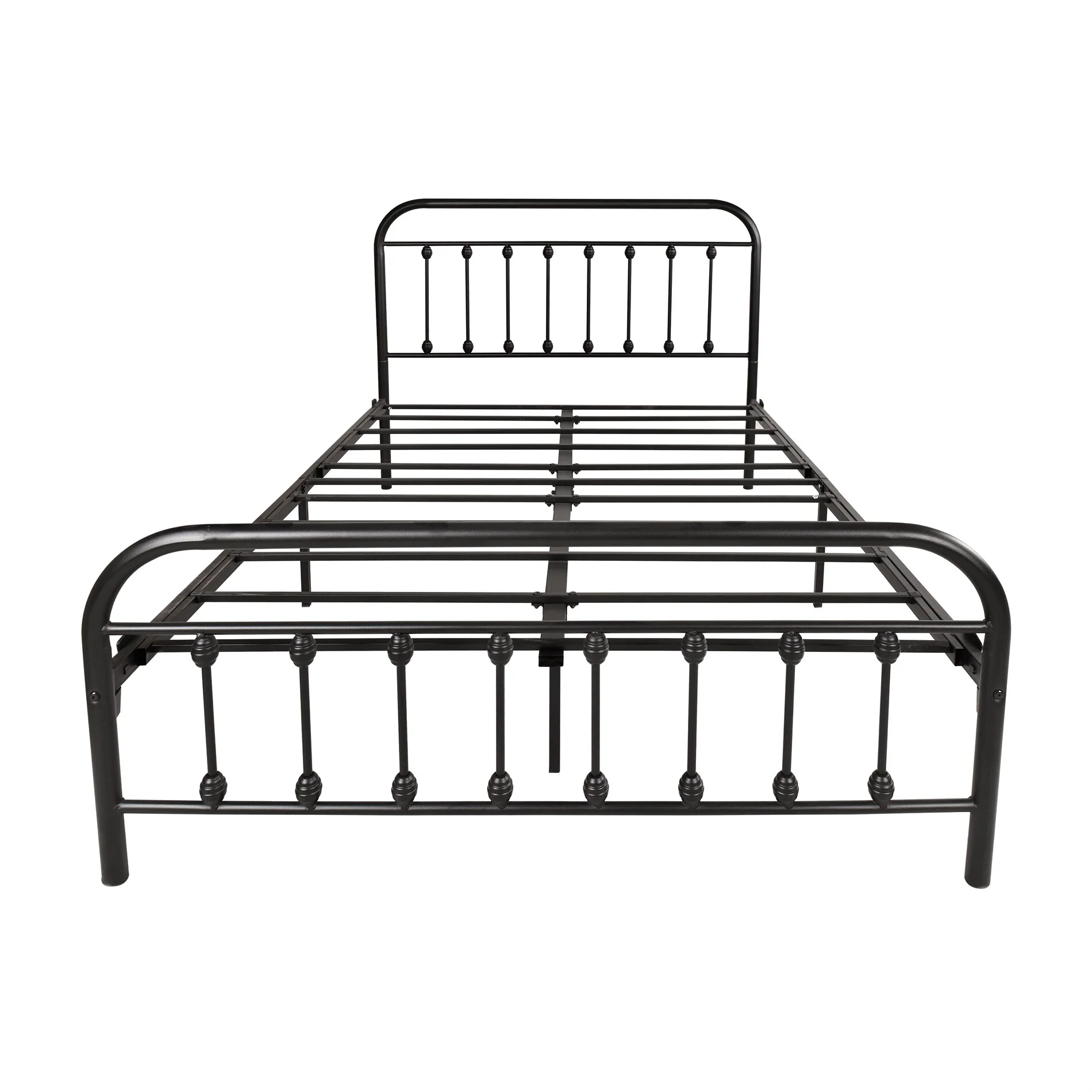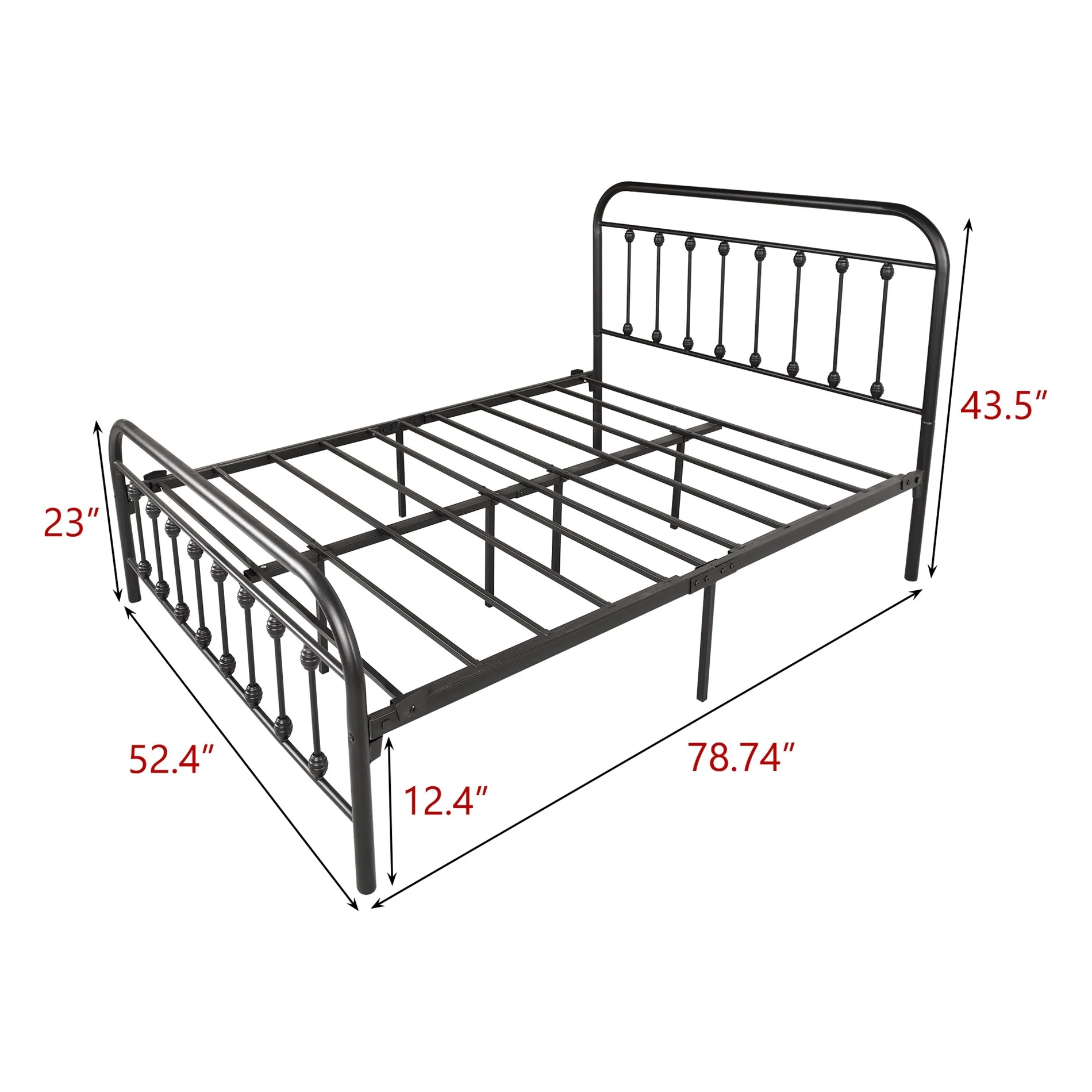 - Platform metal bed with no need for box spring provides valuable under-bed storage. Stylish appearance with vintage headboard and footboard