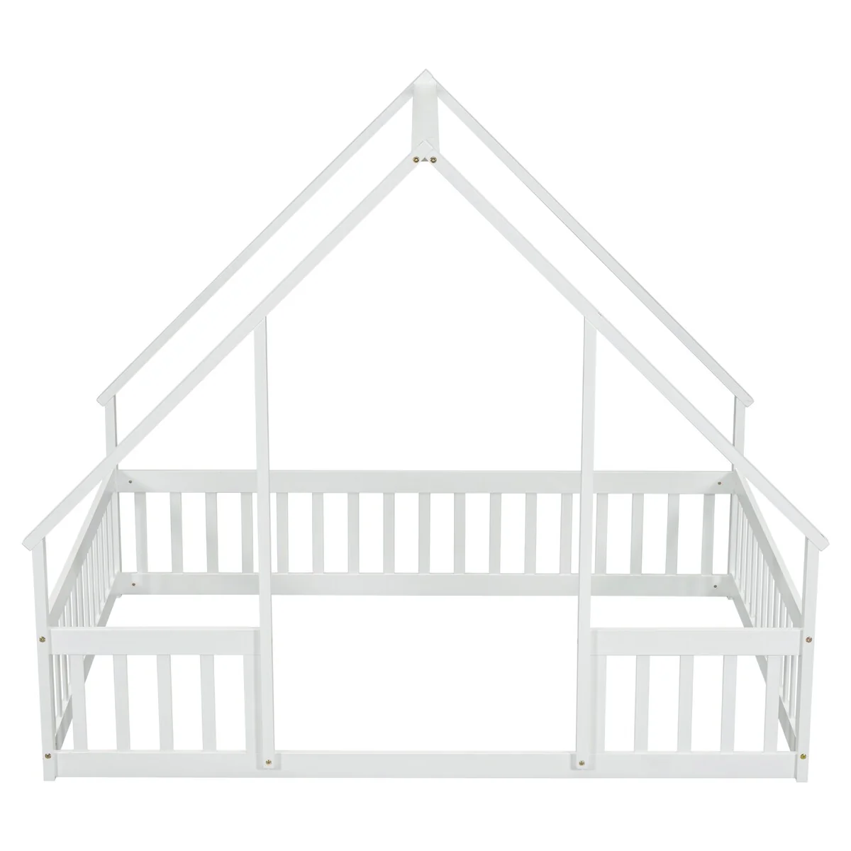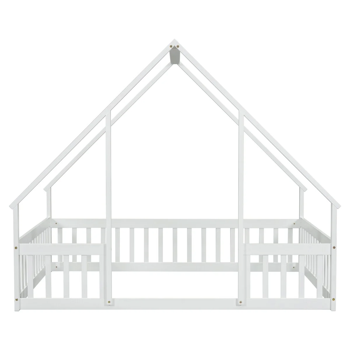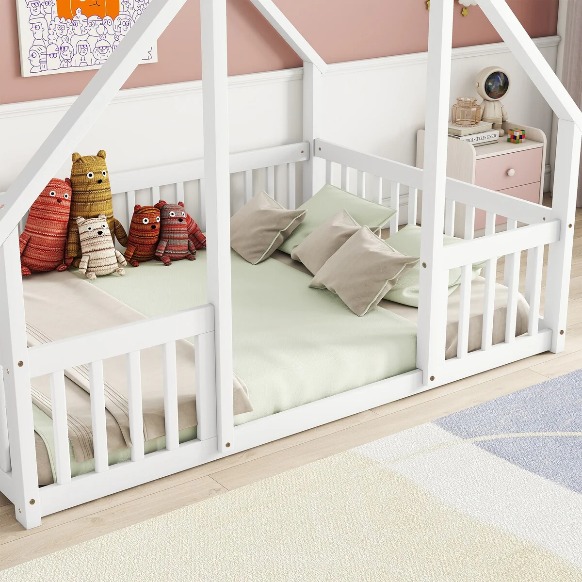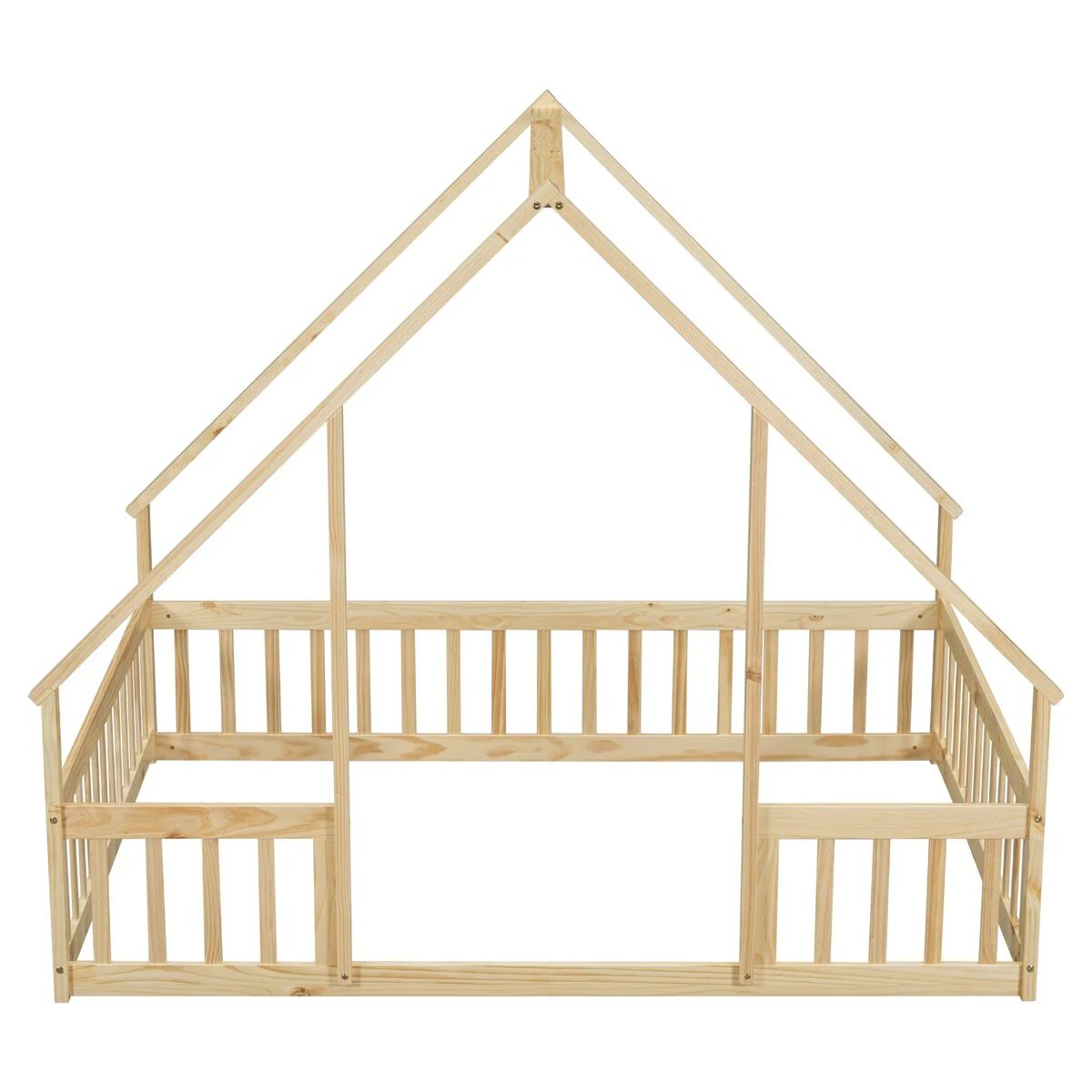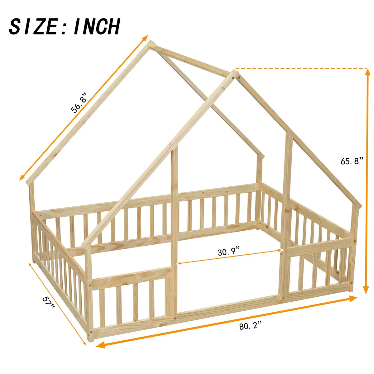 Full Wood House-Shaped Floor Bed with Fence, Guardrails Its elegant yet playful aesthetics provide restful retreat, fostering shared experiences and imaginative play for young visionary. It's an interesting floor bed featuring a wooden house-shaped roof frame to satisfy the desire of exploring the world, create a beautiful and wild playground.