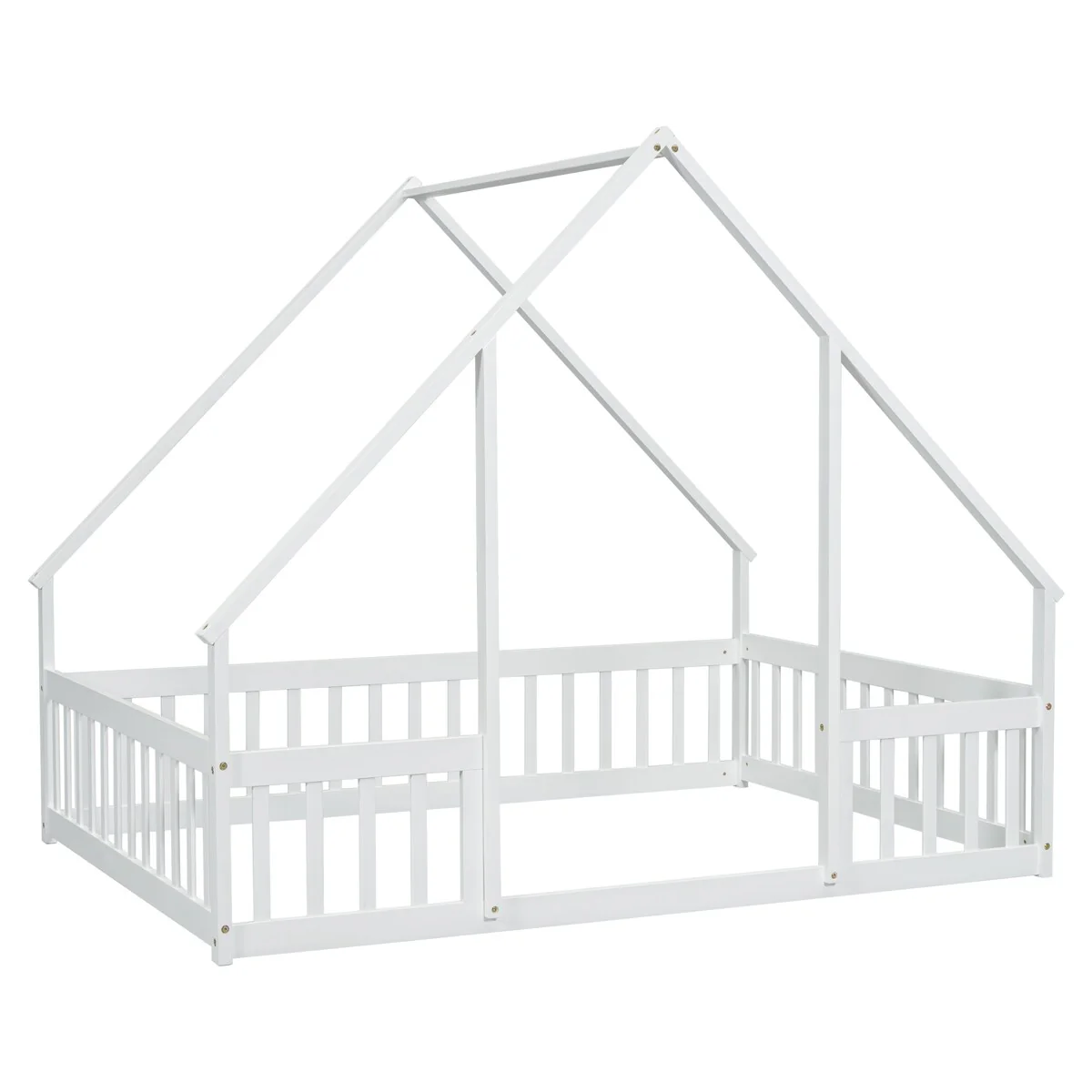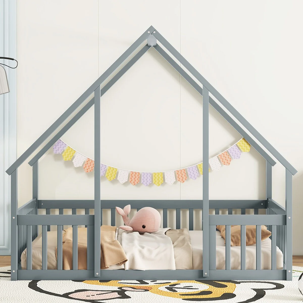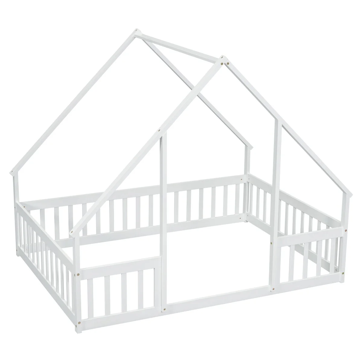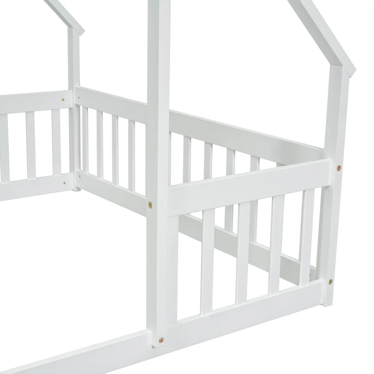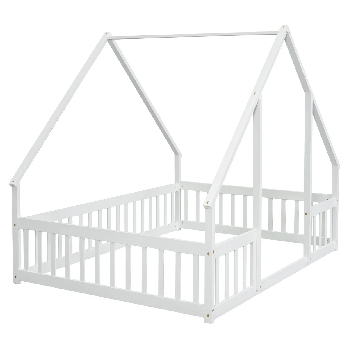 Full Wood House-Shaped Floor Bed with Fence, Guardrails Its elegant yet playful aesthetics provide restful retreat, fostering shared experiences and imaginative play for young visionary. It's an interesting floor bed featuring a wooden house-shaped roof frame to satisfy the desire of exploring the world, create a beautiful and wild playground.