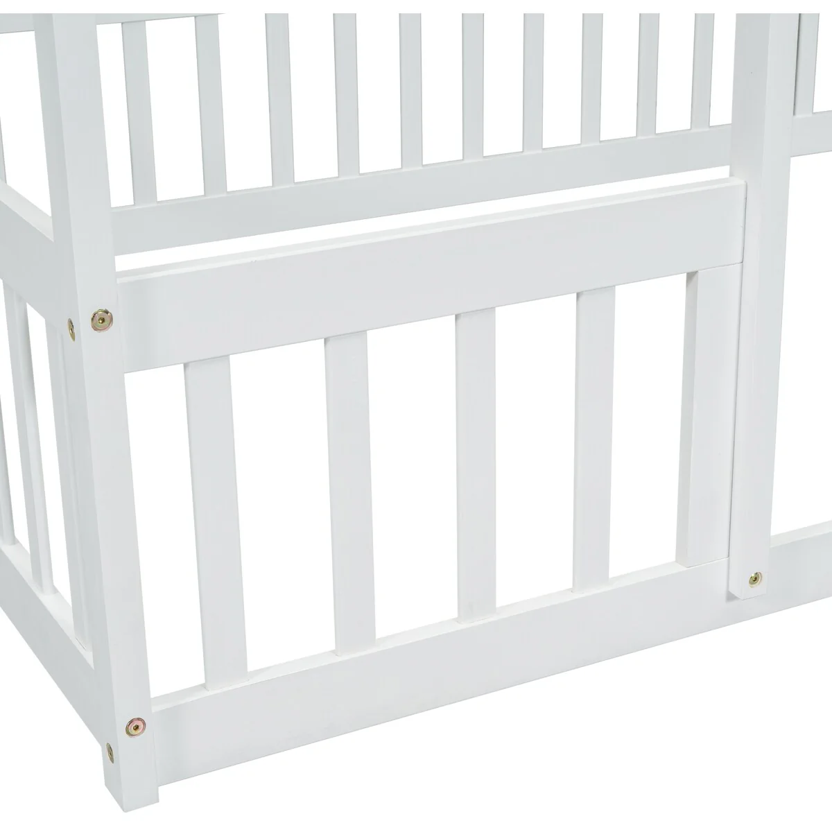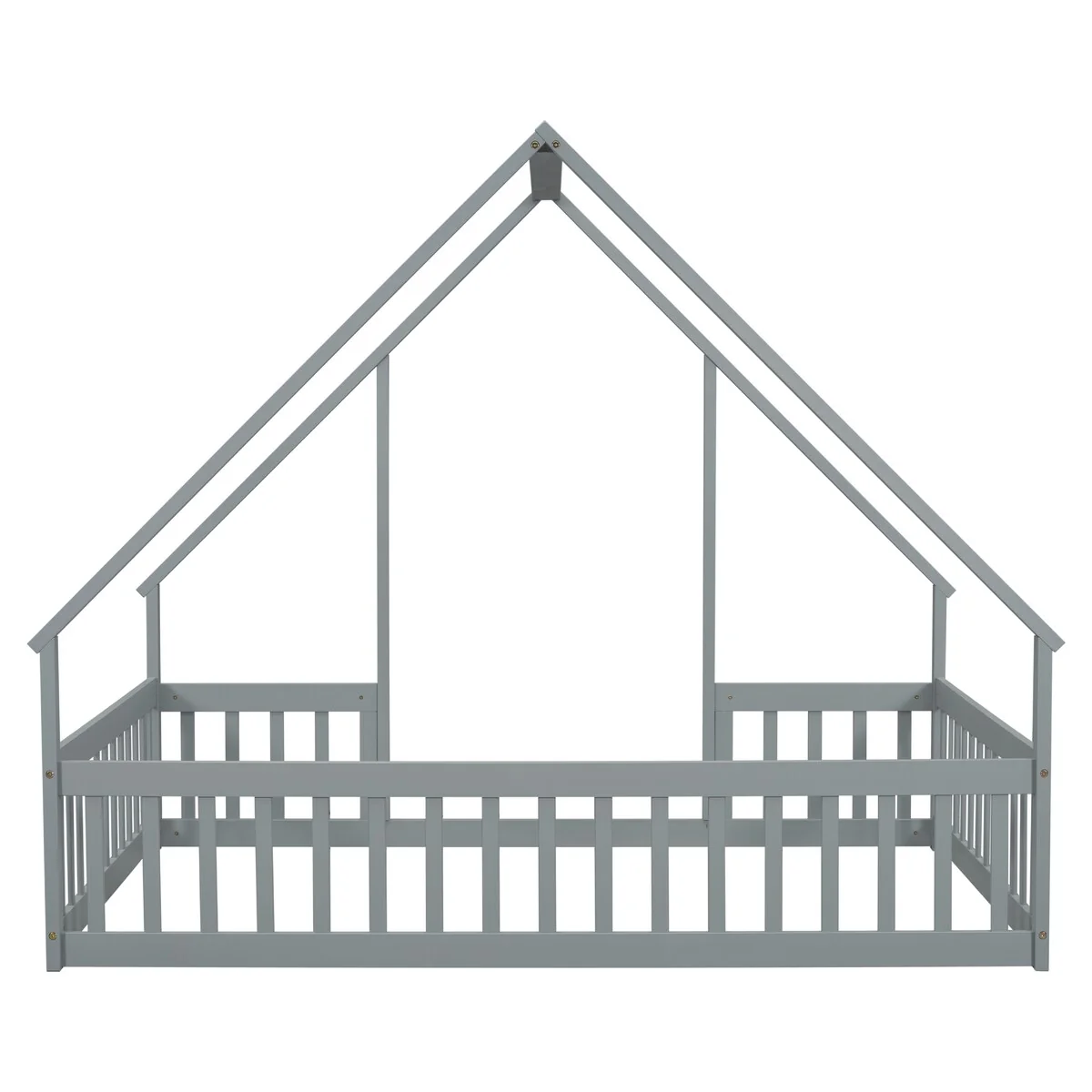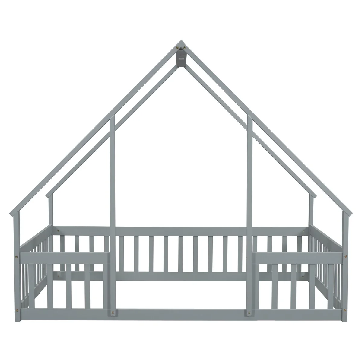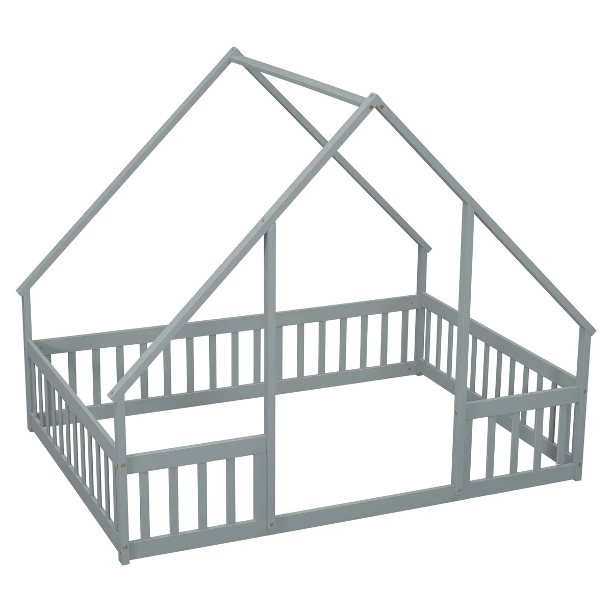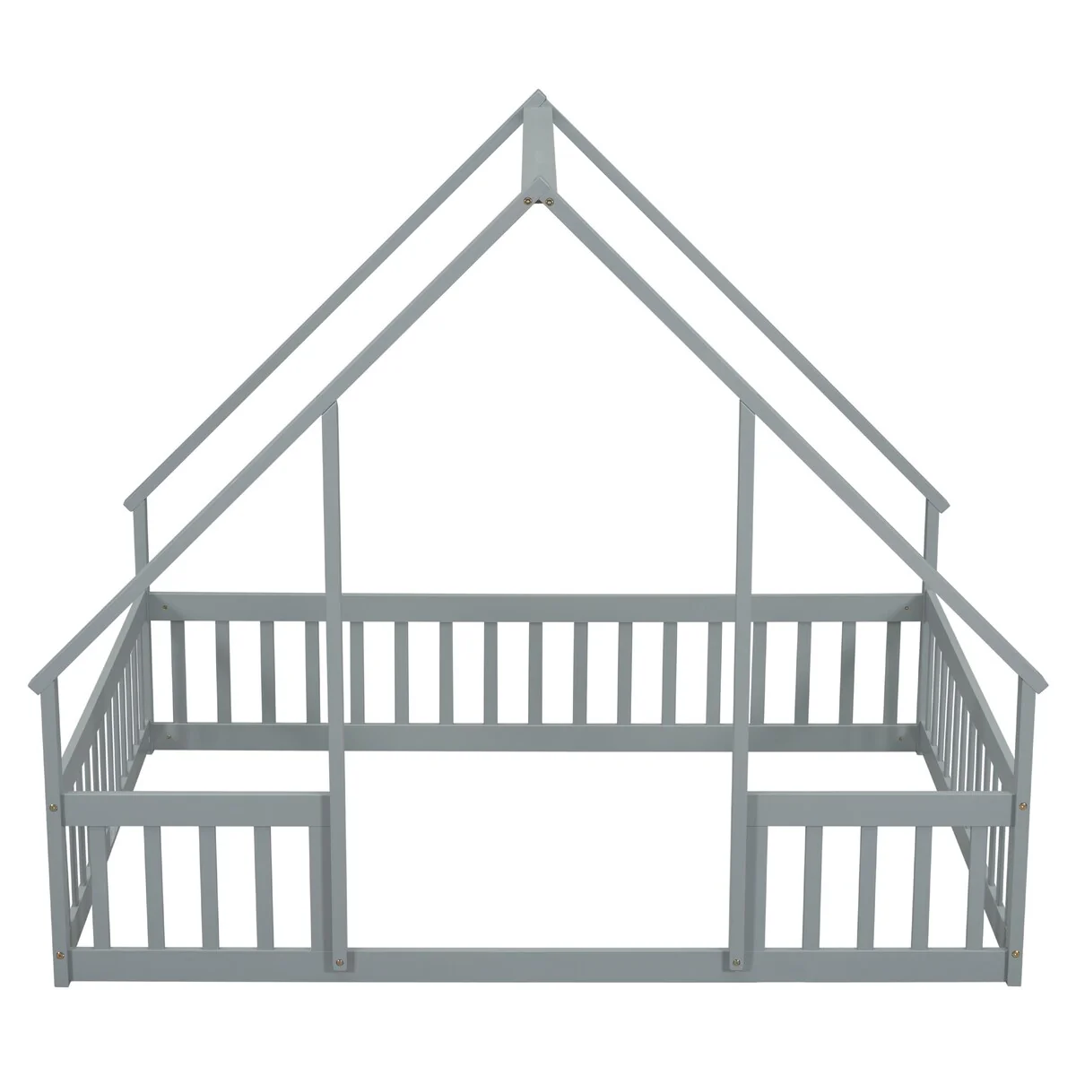 Full Wood House-Shaped Floor Bed with Fence, Guardrails Its elegant yet playful aesthetics provide restful retreat, fostering shared experiences and imaginative play for young visionary. It's an interesting floor bed featuring a wooden house-shaped roof frame to satisfy the desire of exploring the world, create a beautiful and wild playground.