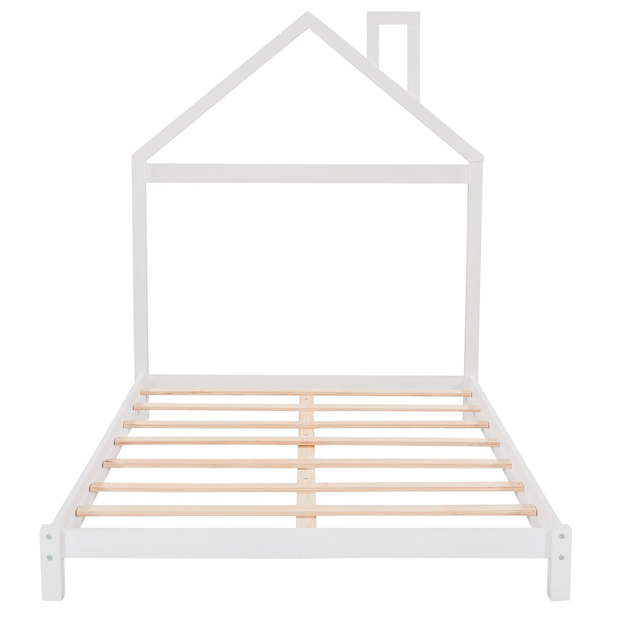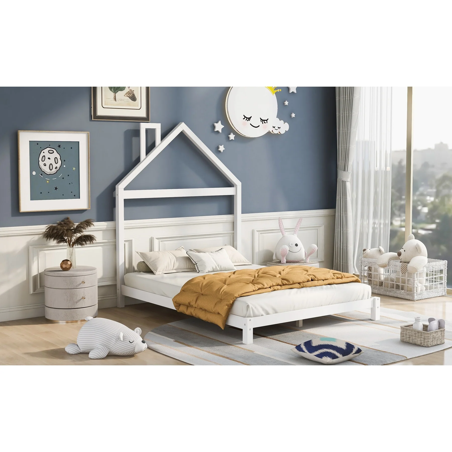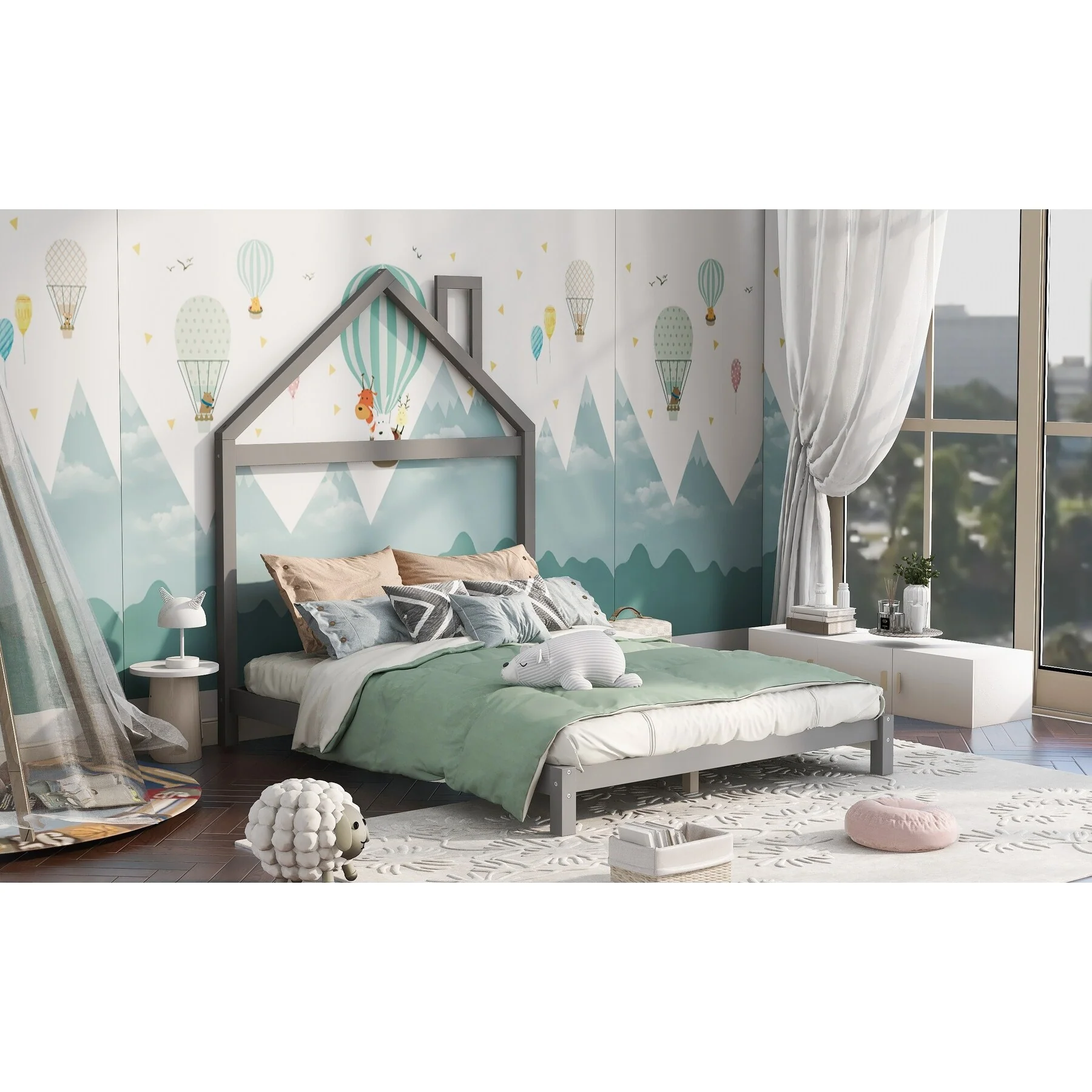 Featuring a house-shaped headboard with a charming chimney detail, this Full-Size Wood Platform Bed adds a playful aesthetic to any room. Constructed from solid pine wood and supported by sturdy slats, this bed offers a reliable and durable foundation for restful sleep. The fun design and neutral color allow this bed to blend effortlessly with any home decor style, making it a delightful centerpiece for bedrooms of all ages. Assembly is easy, and the bed comes with all necessary tools.
