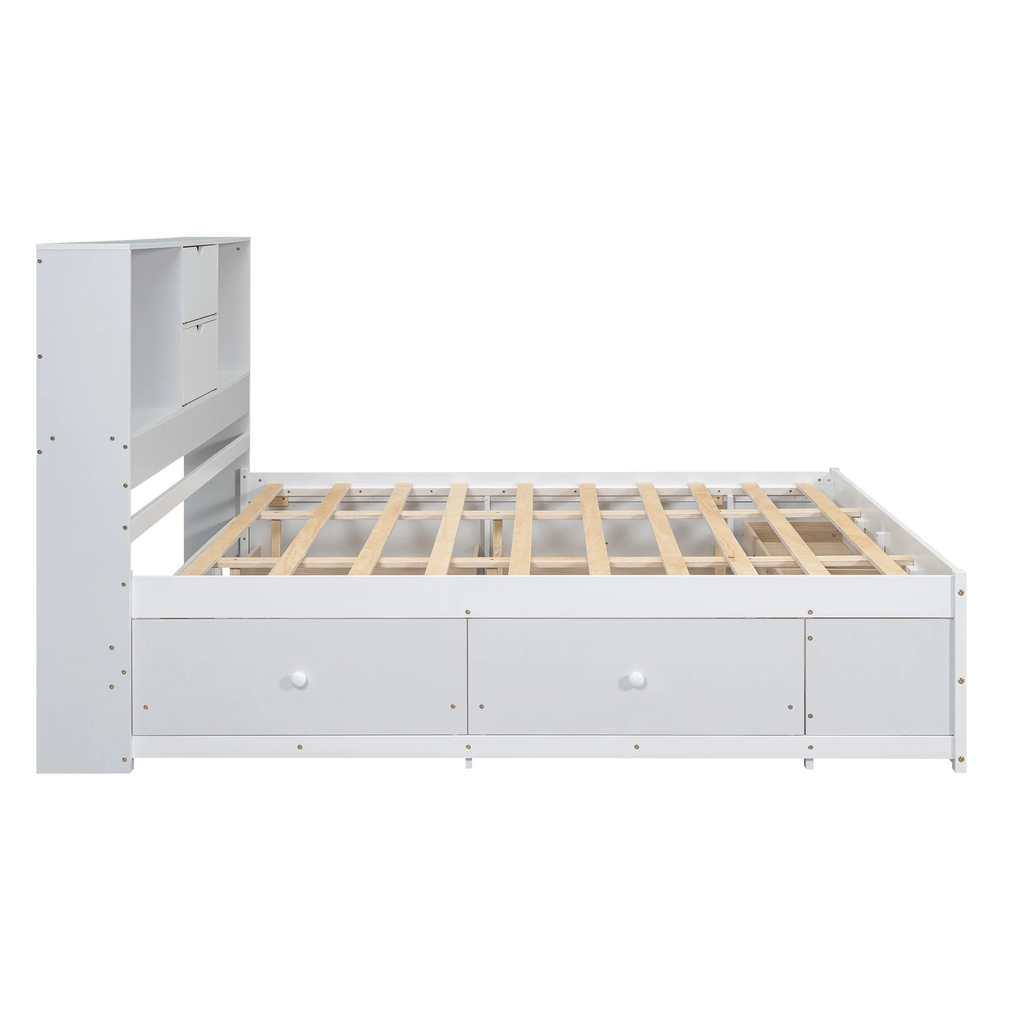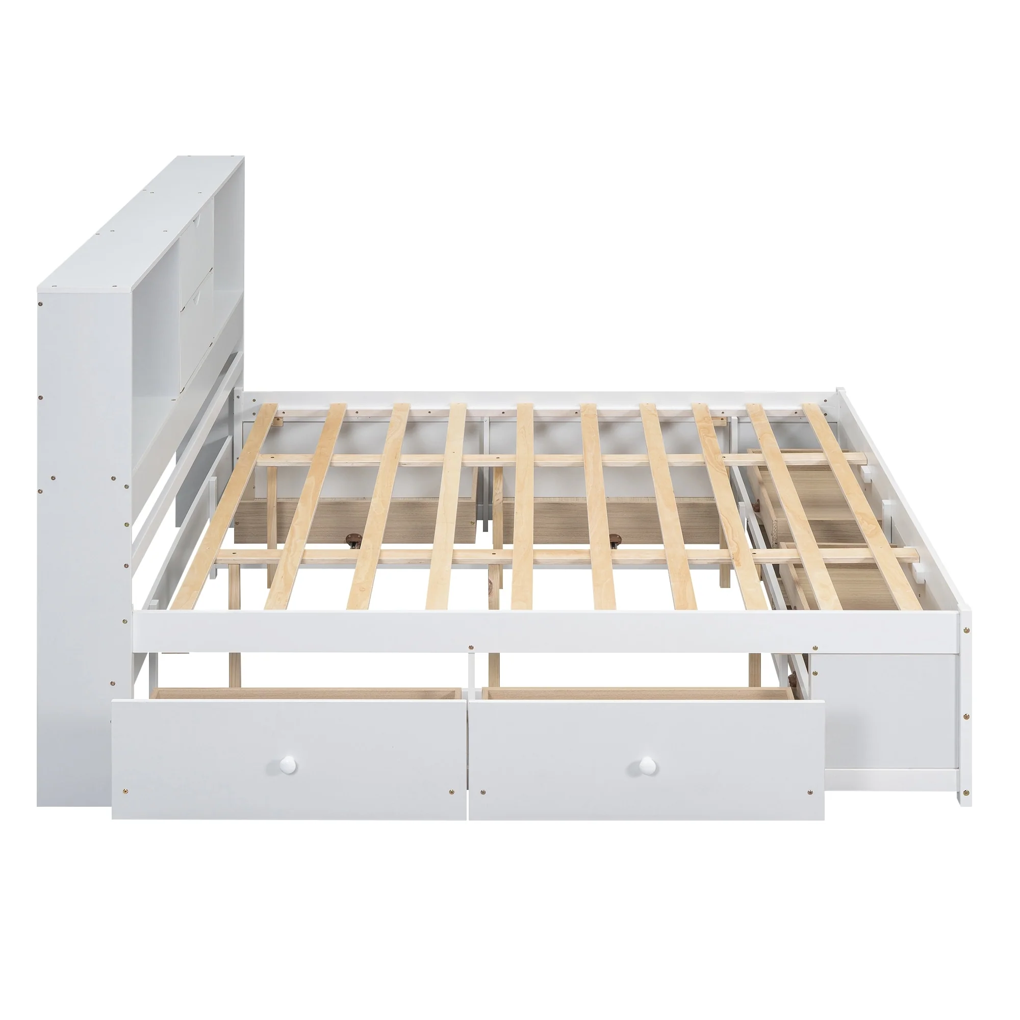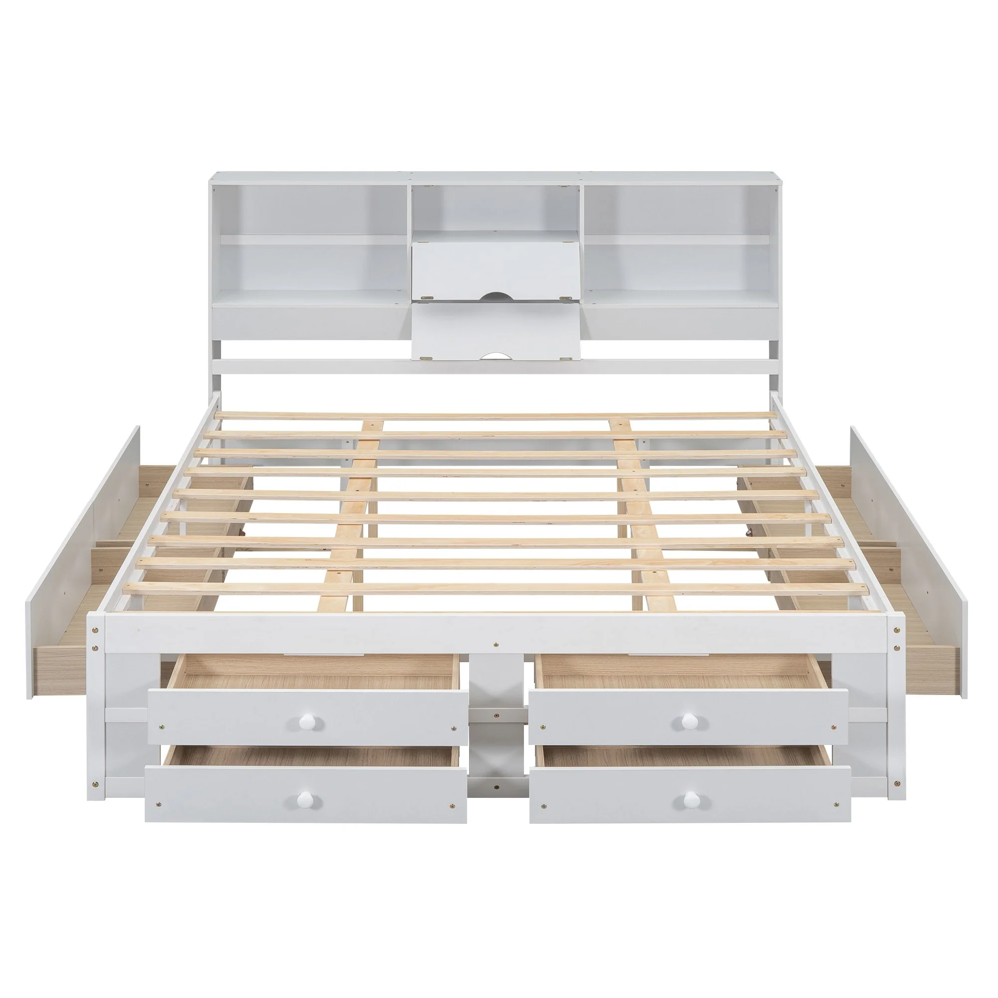 King Size Platform Bed with Storage Headboard and 8 Drawers, White