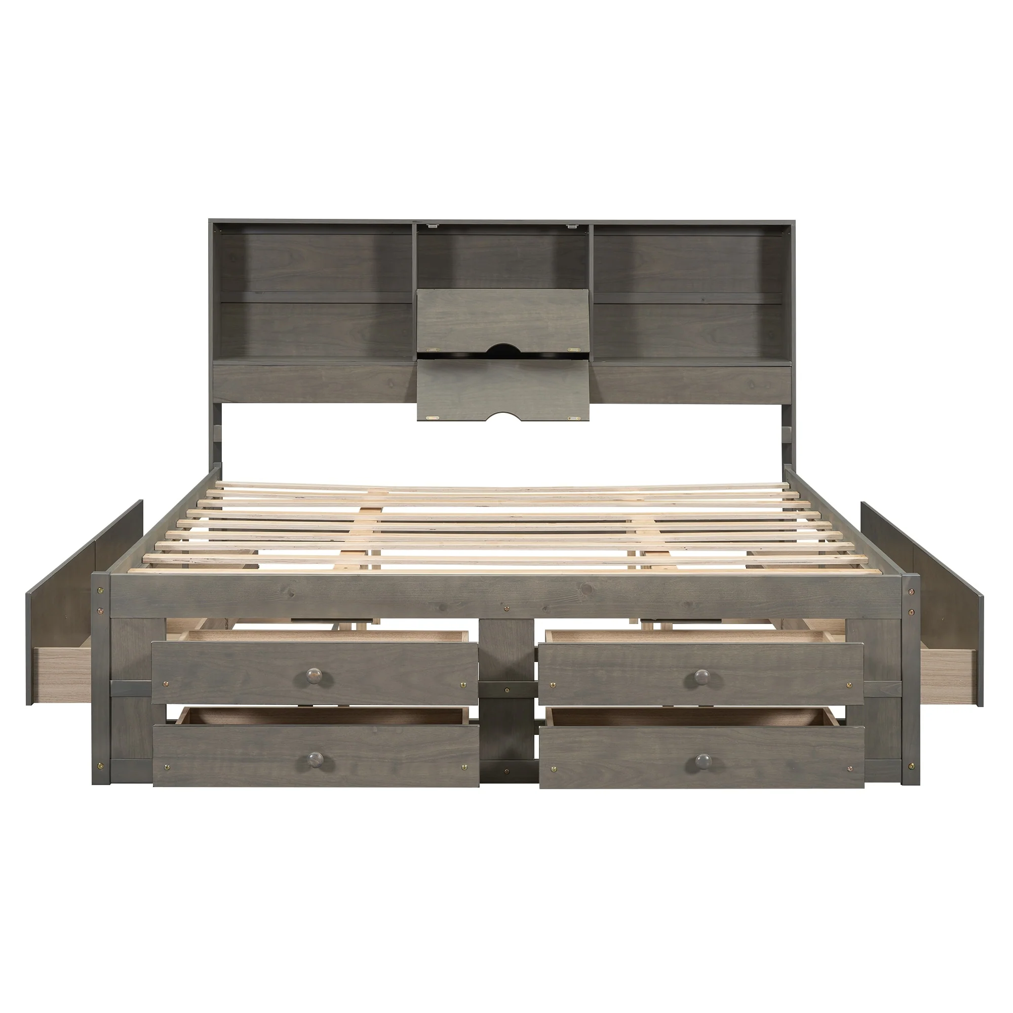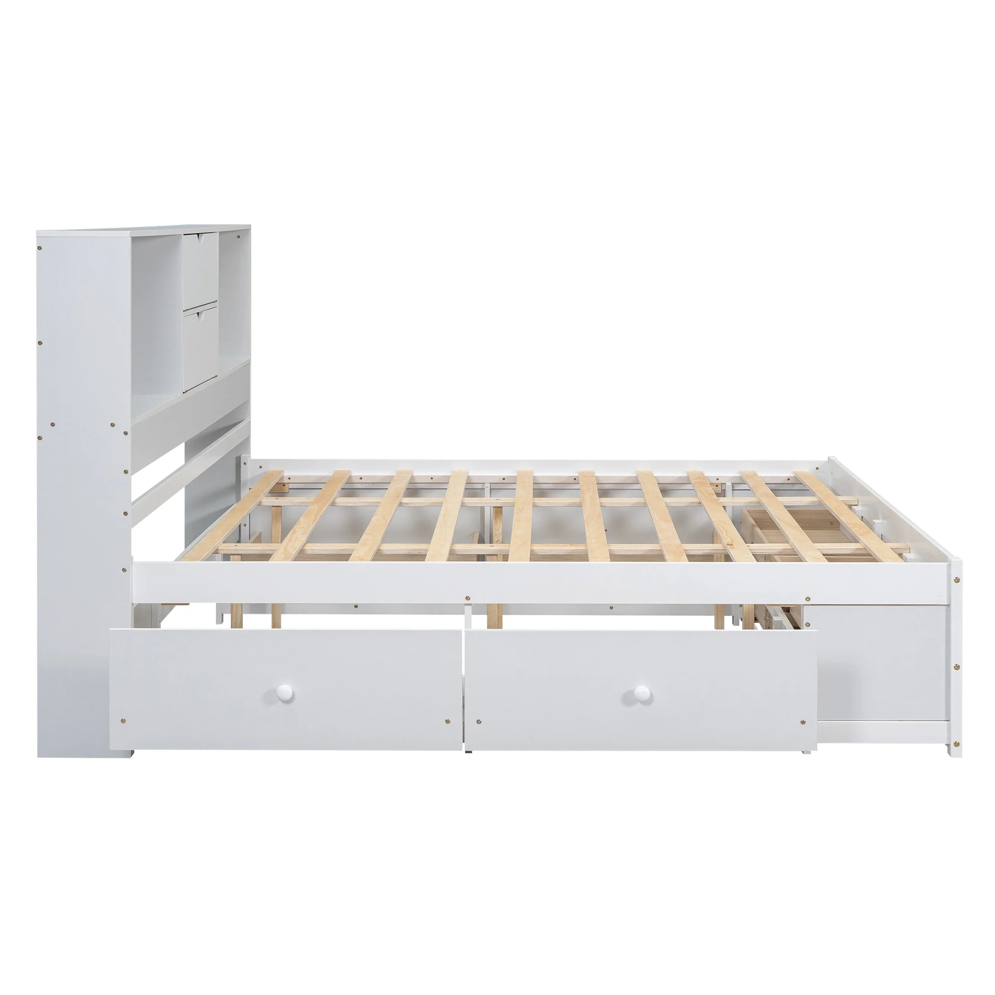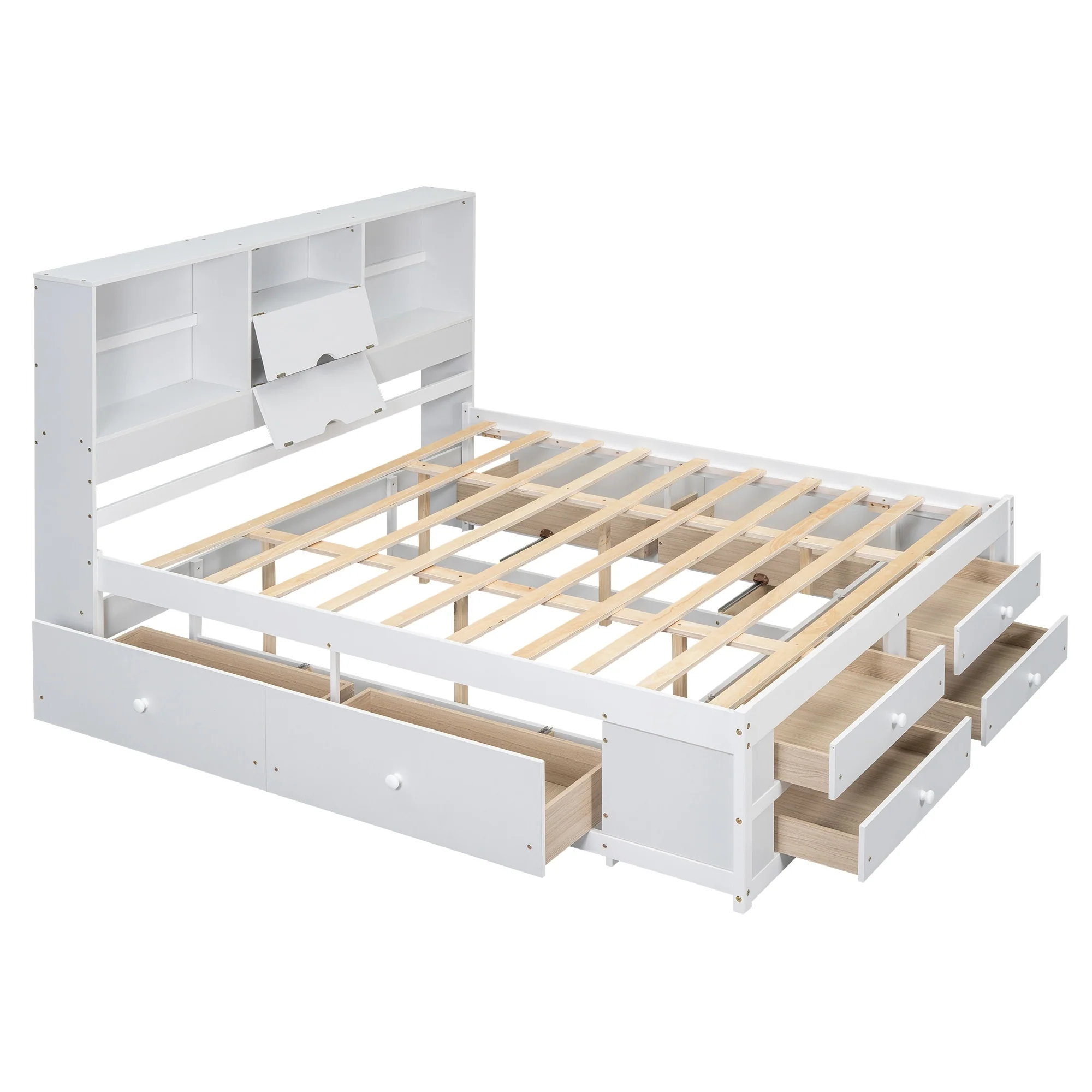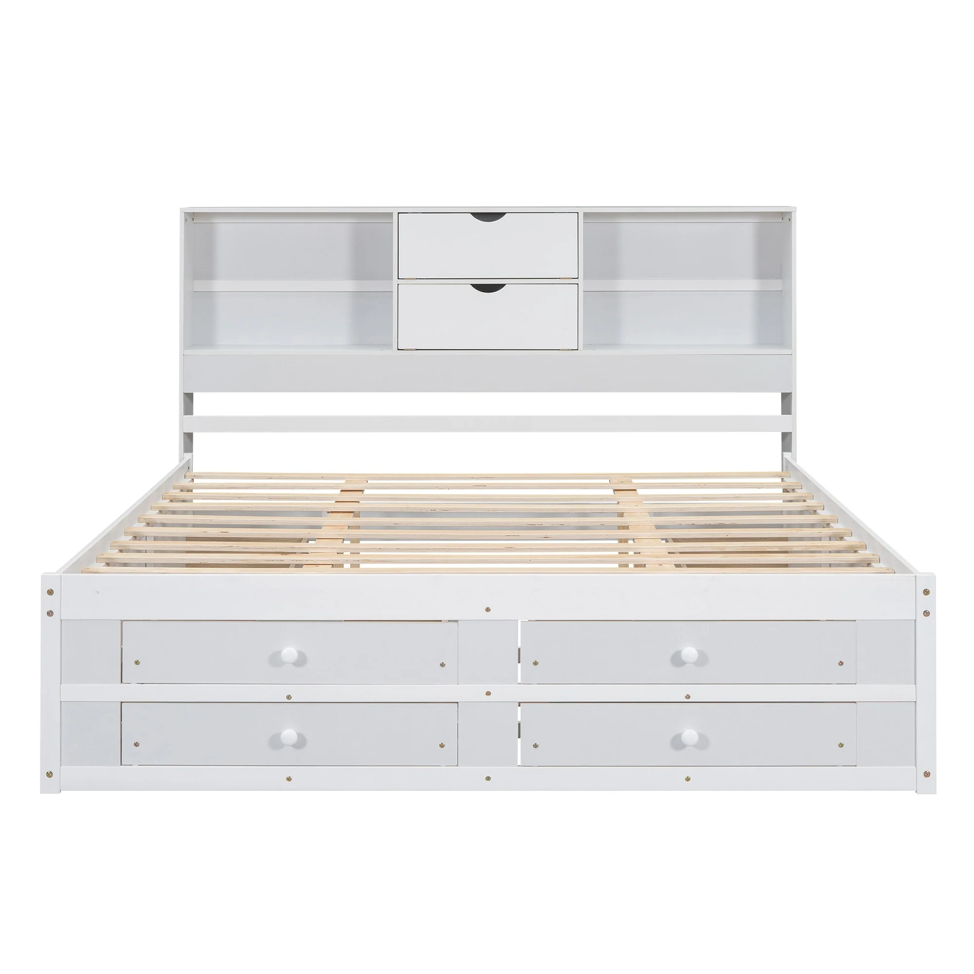 King Size Platform Bed with Storage Headboard and 8 Drawers, White