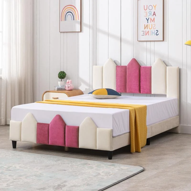 The Mixoy Kids Bed Frames with Upholstered Platform and Headboard is a charming addition to any child's bedroom. The unique house shape of the bed adds character and appeal that kids will love. Made with premium materials, including a velvet upholstered sponge headboard and sturdy wood slats, this bed offers both comfort and durability. The central cross wood support eliminates sagging and extends the bed's service life. Measuring at 76.77'D x 38.19'W x 41.35'H for the twin size and 76.77'D x 53.55'W x 41.35'H for the full size, this bed is easy to assemble with clear instructions and labeled parts. If you have any issues with your purchase, our customer service team is available to provide a solution within 24 hours.