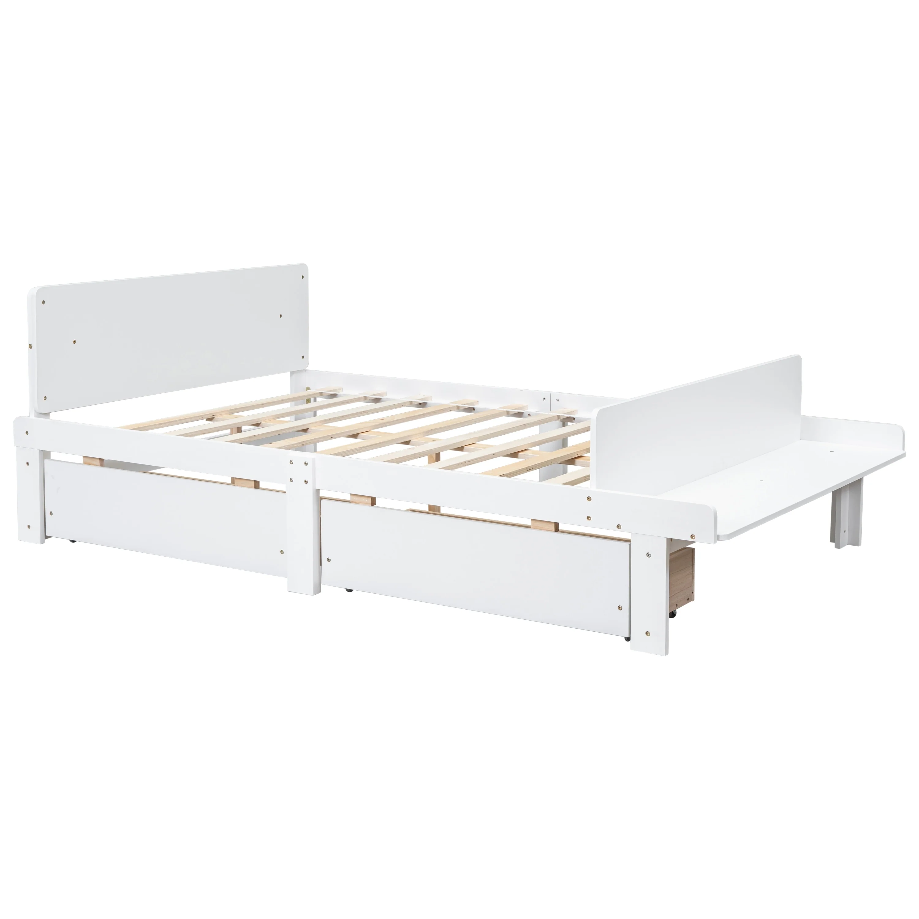 Maximize space and functionality in your bedroom with this Full Size Bed featuring a built-in footboard bench and two spacious storage drawers. Crafted from durable pine wood, plywood, and PB, this bed showcases a sleek, minimalistic design perfect for modern bedrooms. The footboard bench offers additional seating or relaxation space, while the two under-bed drawers provide ample storage for clothes, bedding, or other essentials. With its sturdy construction and 10 wooden slats, this bed ensures stability and eliminates the need for a box spring, making it a practical and stylish addition to any home.