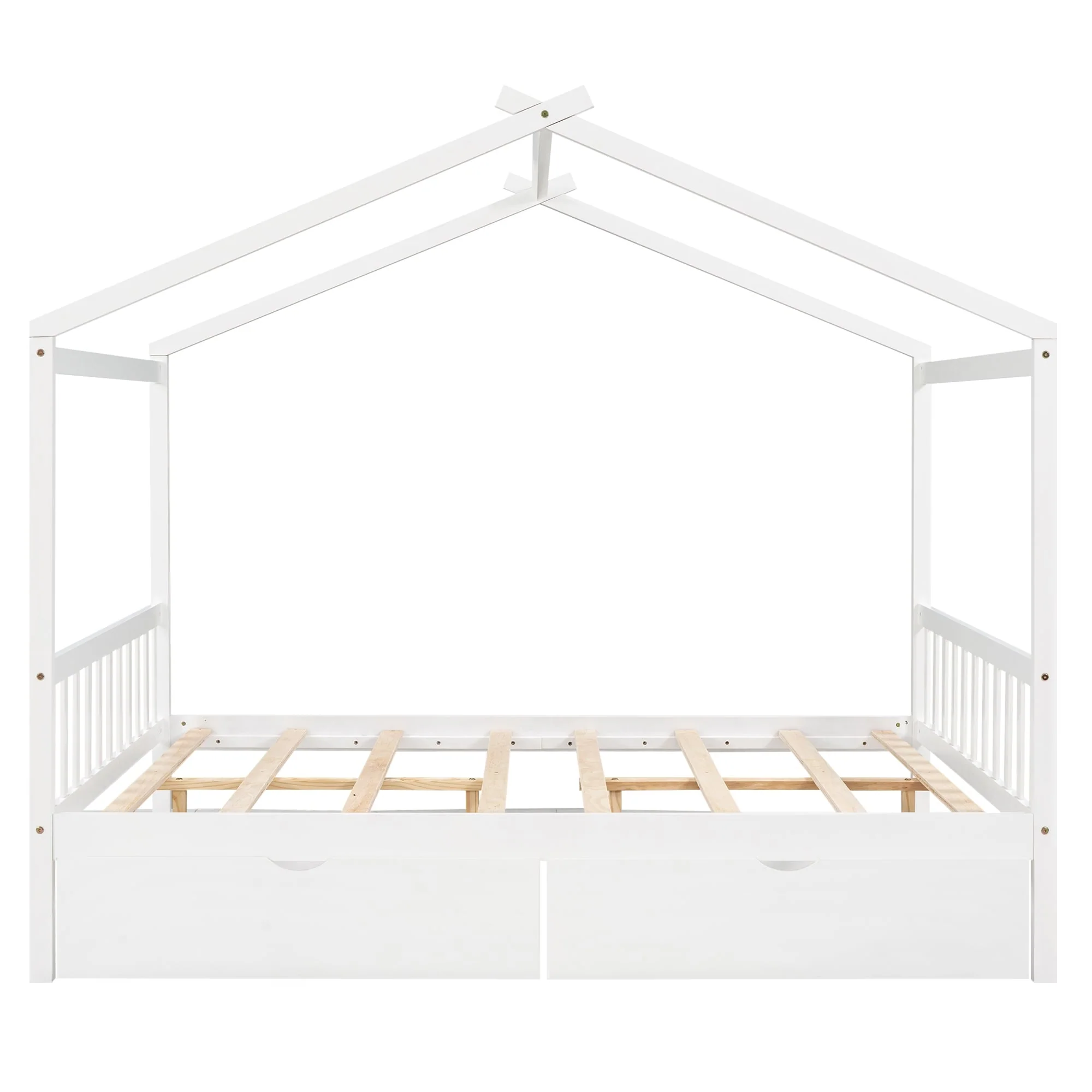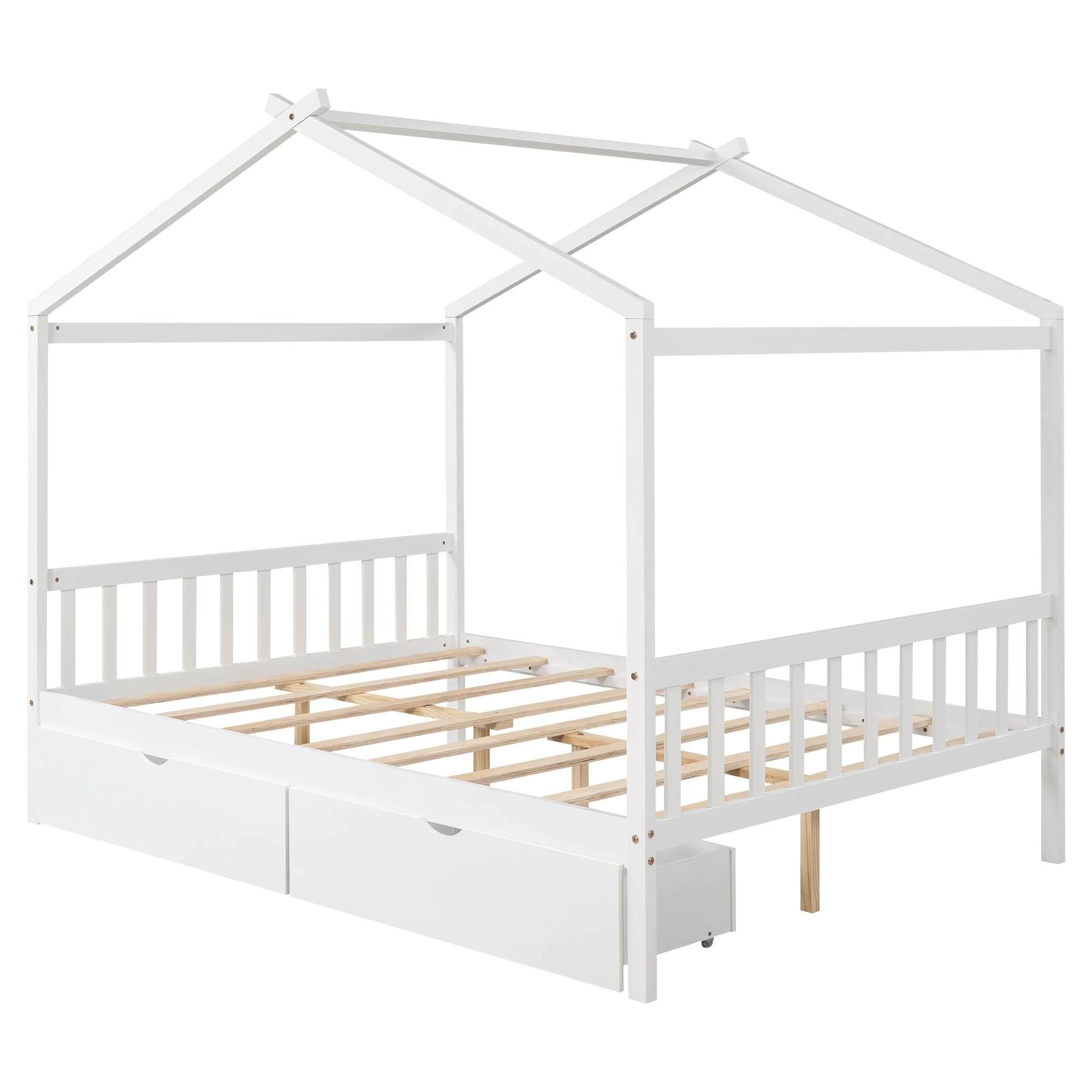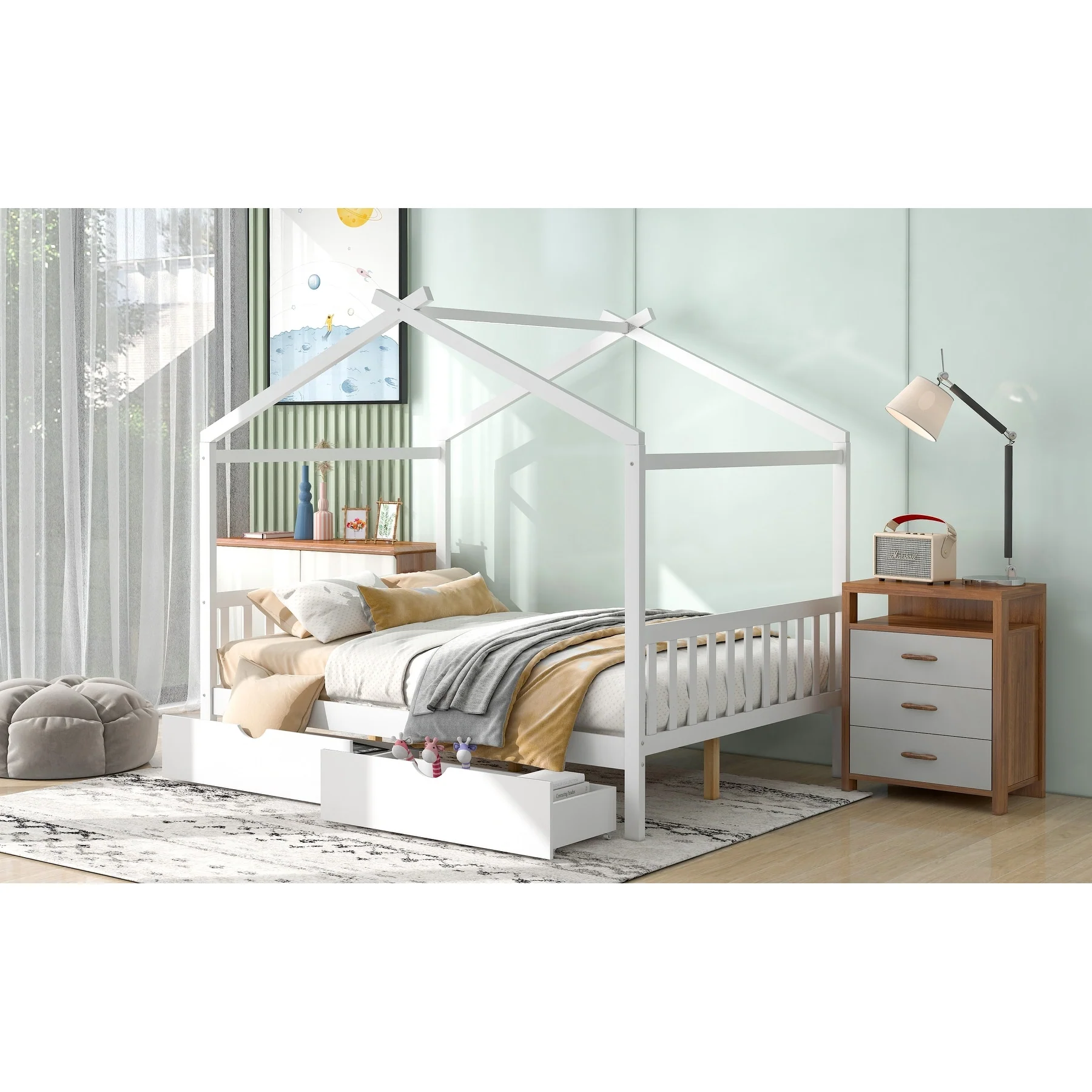 Turn your child's bedroom into a playful retreat with this Full Size House Platform Bed, featuring a charming roof design and a sleek, modern aesthetic. Crafted from sturdy pine wood and MDF, this bed is both durable and stylish, designed to grow with your child. The two large drawers beneath the bed offer convenient storage for clothing, toys, or bedding, making it a practical solution for small spaces. Its low profile ensures easy access, perfect for young kids to get in and out of bed safely on their own.