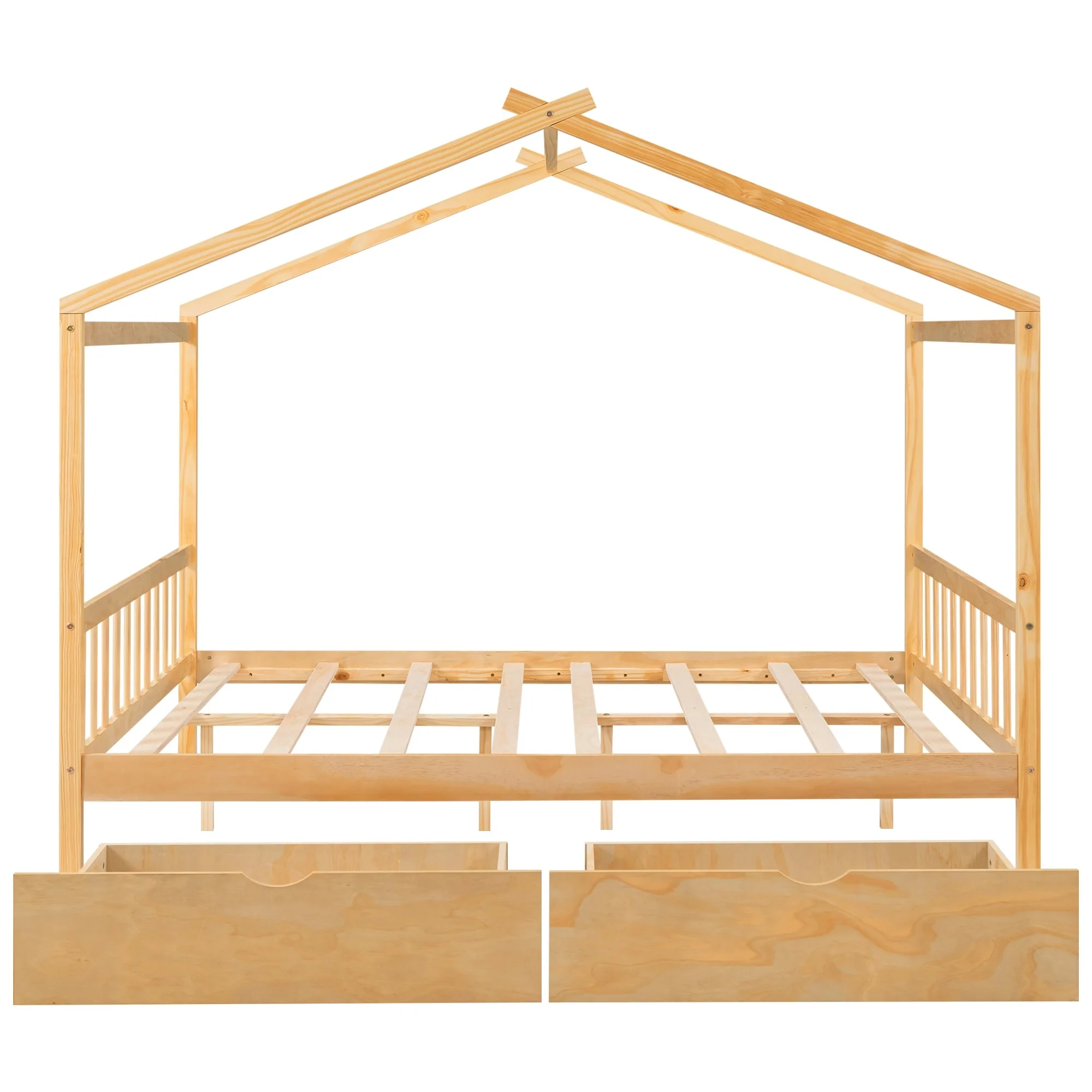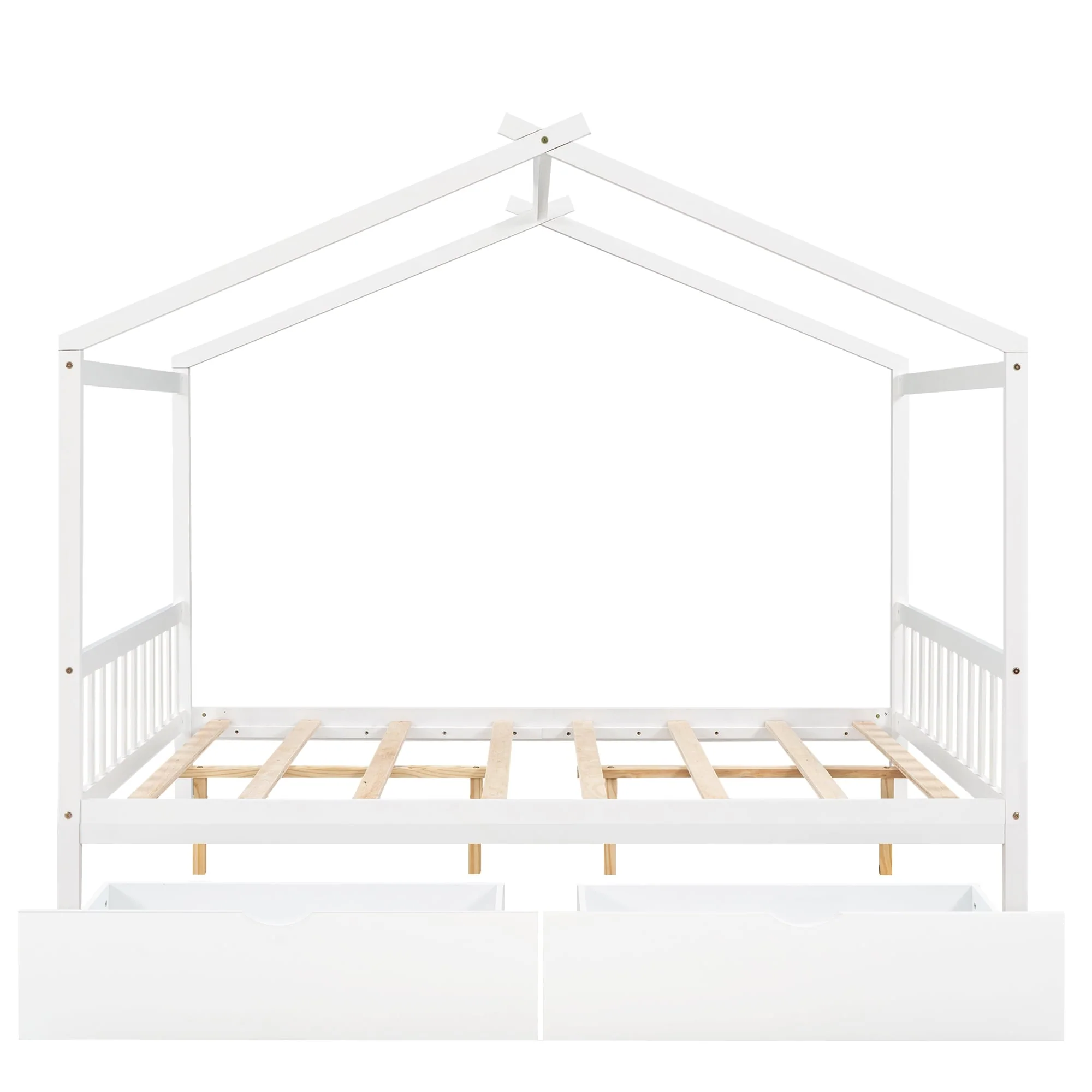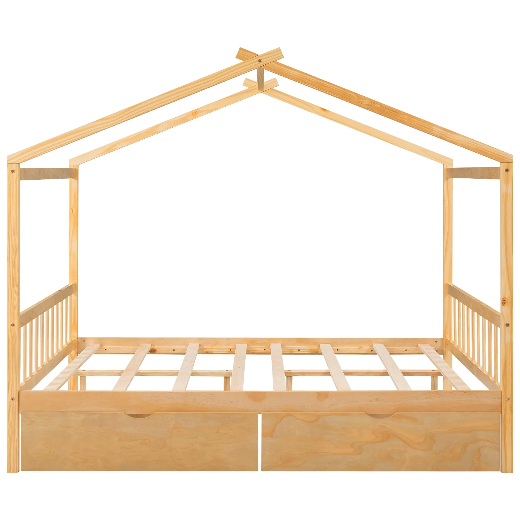 Turn your child's bedroom into a playful retreat with this Full Size House Platform Bed, featuring a charming roof design and a sleek, modern aesthetic. Crafted from sturdy pine wood and MDF, this bed is both durable and stylish, designed to grow with your child. The two large drawers beneath the bed offer convenient storage for clothing, toys, or bedding, making it a practical solution for small spaces. Its low profile ensures easy access, perfect for young kids to get in and out of bed safely on their own.