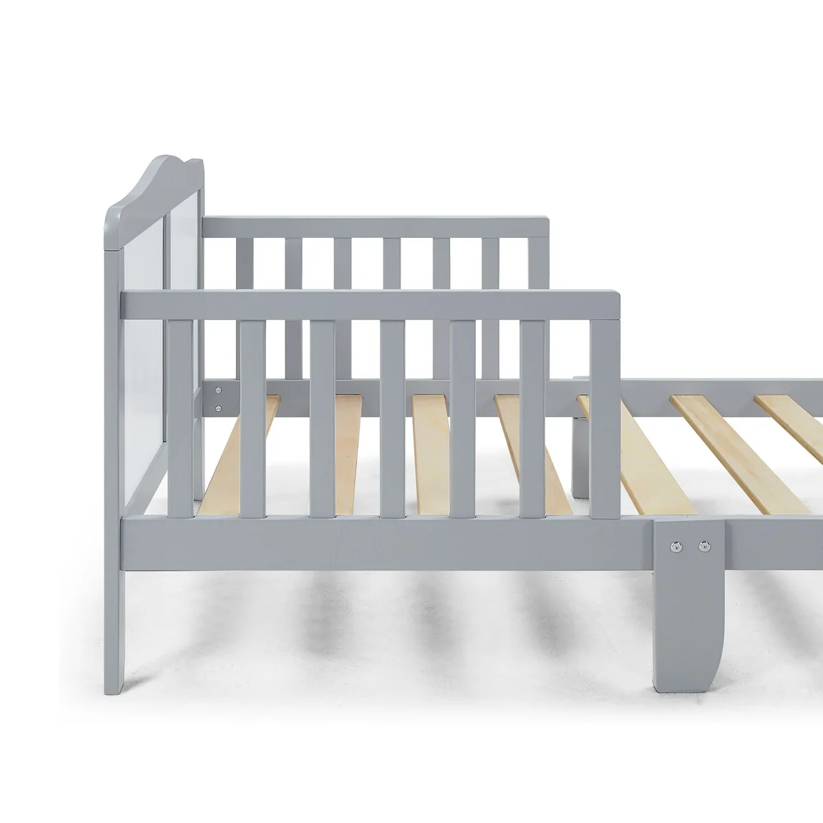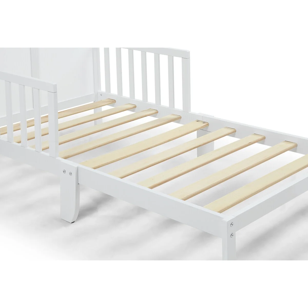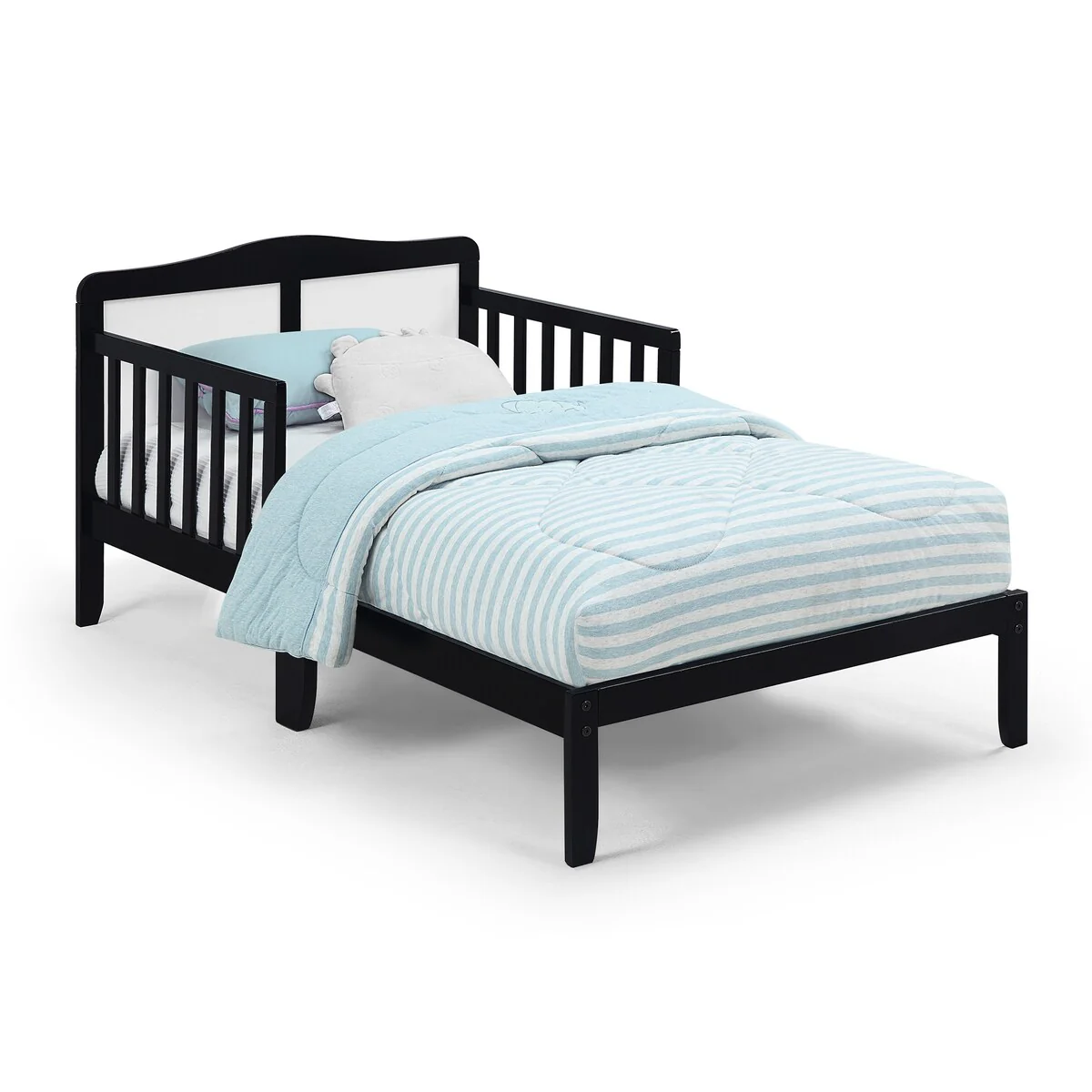 The Birdie toddler bed from Olive & Opie is as simple and sophisticated as the birdie starling. Striking finishes that complement the solid panel white headboard and a low profile footboard, designates Birdie as the perfect nesting spot for your toddler. Complete with dual side guardrails for security at night. The Birdie also features a solid wood frame, solid slat rails, and secondary support leg for extra durability.