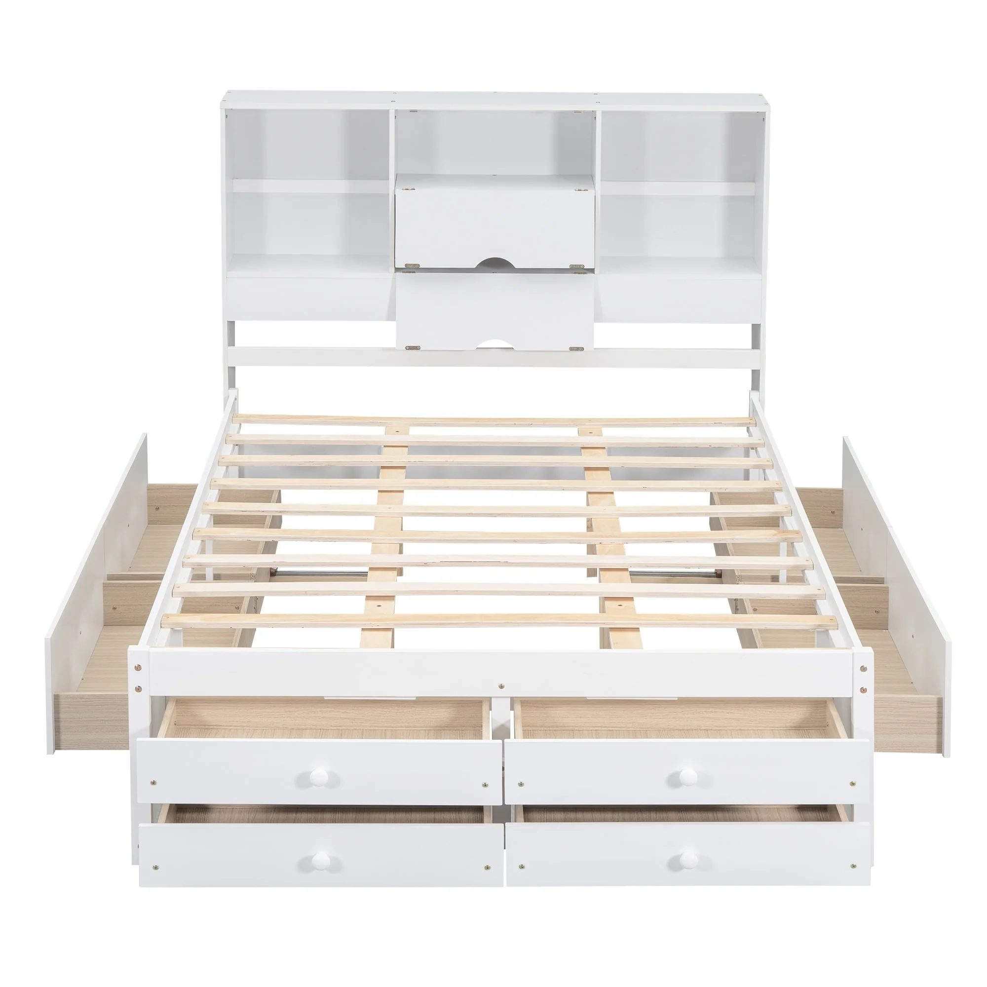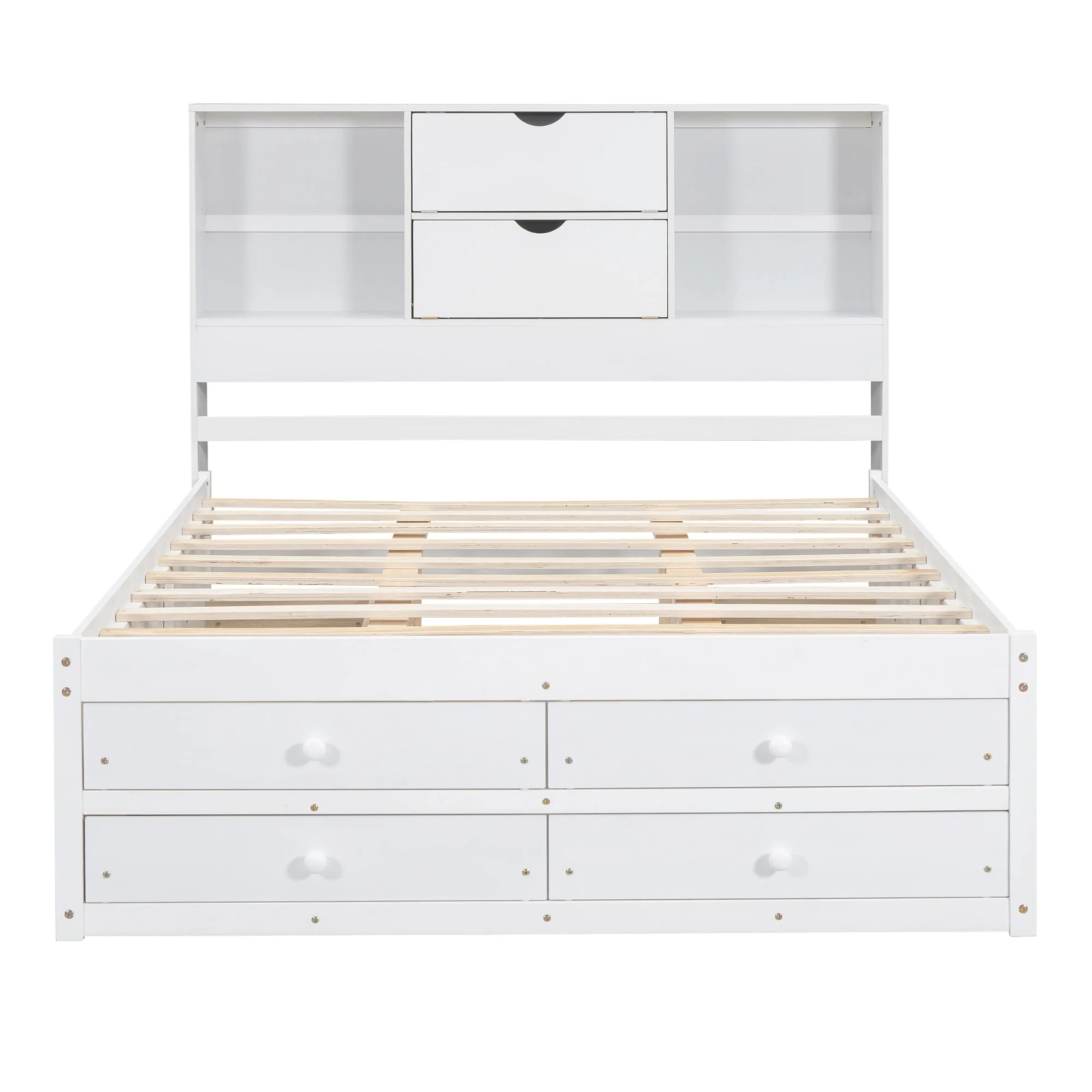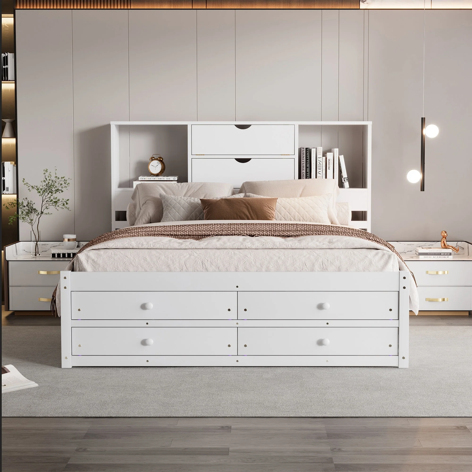 Enhance your bedroom with the simple yet stylish design of this Queen Size Platform Bed with Storage Headboard and 8 Drawers. Crafted from solid pine wood and MDF, this bed is built to last, offering both durability and ample storage space. The headboard features four storage compartments, while the bed itself is equipped with eight spacious drawers—four on the sides and four at the foot—providing you with plenty of room to store your daily essentials and personal belongings. The clean white finish adds a touch of elegance to any bedroom decor, making this bed a perfect blend of form and function.