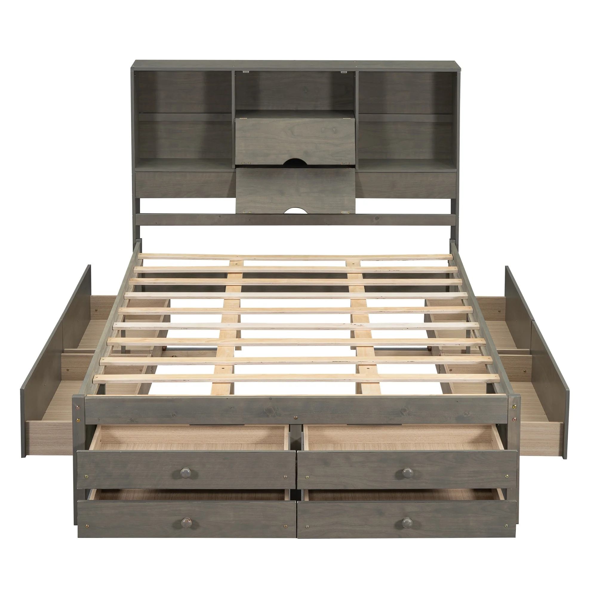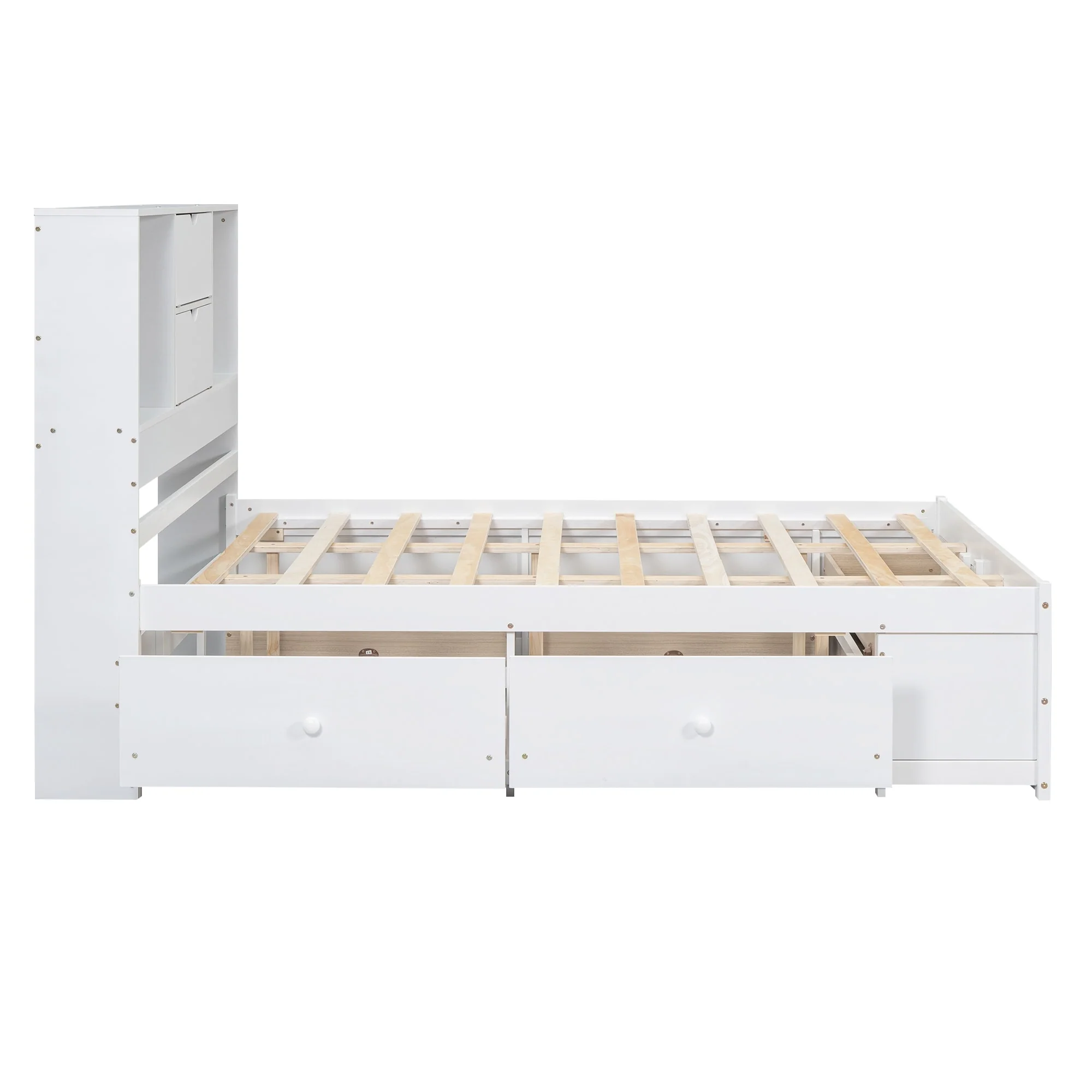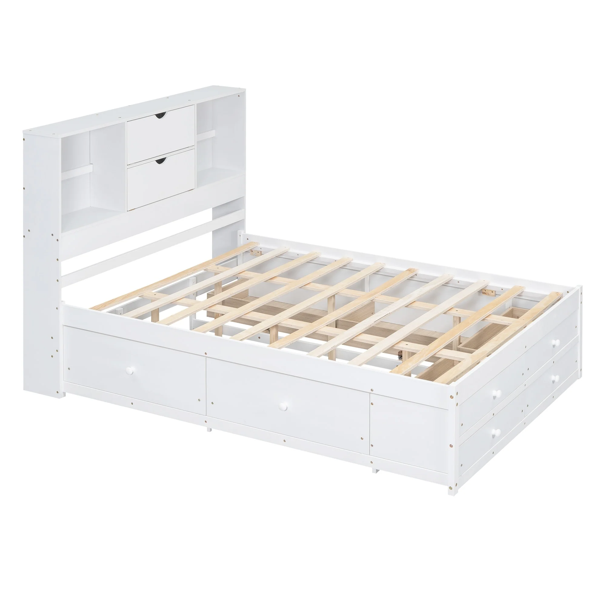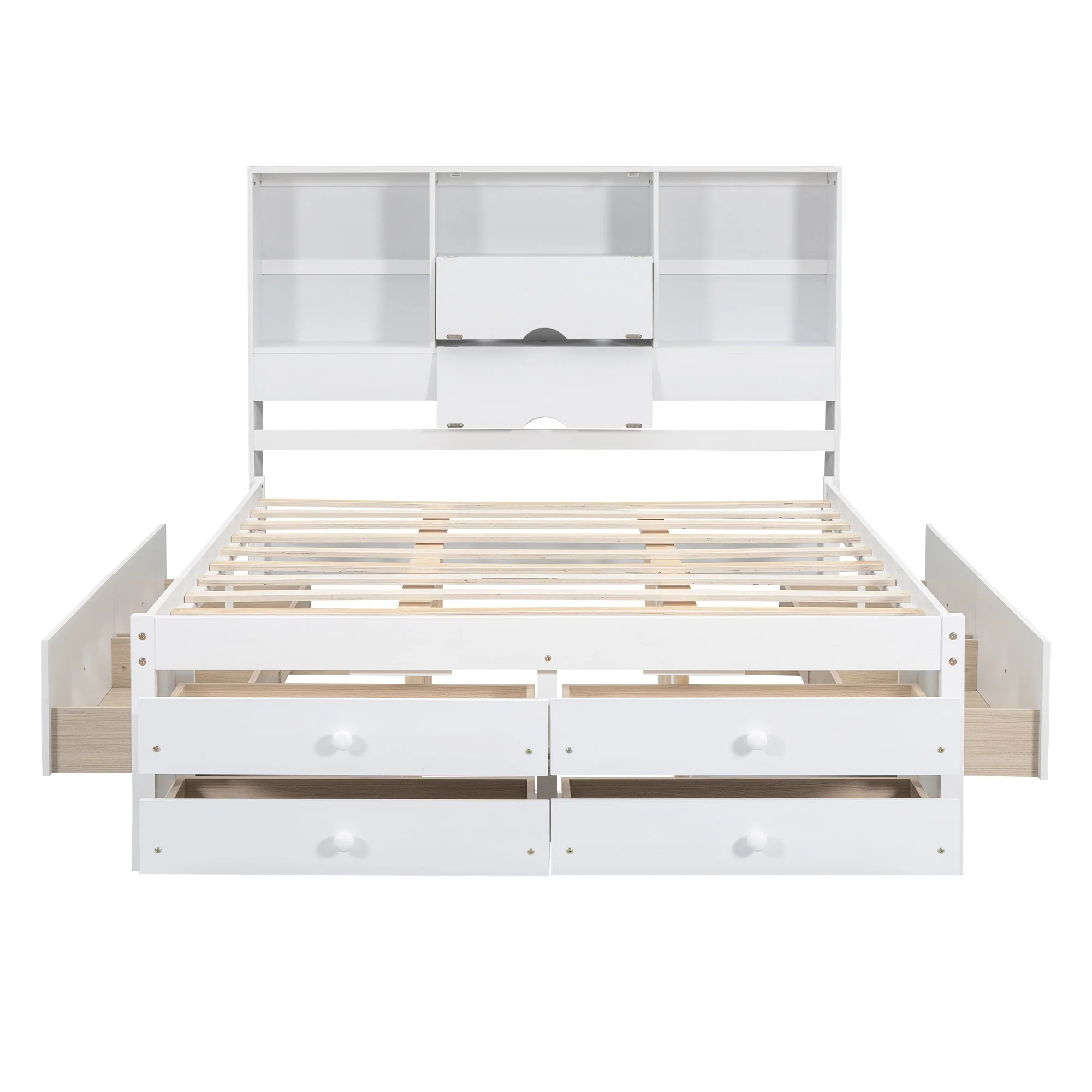 Enhance your bedroom with the simple yet stylish design of this Queen Size Platform Bed with Storage Headboard and 8 Drawers. Crafted from solid pine wood and MDF, this bed is built to last, offering both durability and ample storage space. The headboard features four storage compartments, while the bed itself is equipped with eight spacious drawers—four on the sides and four at the foot—providing you with plenty of room to store your daily essentials and personal belongings. The clean white finish adds a touch of elegance to any bedroom decor, making this bed a perfect blend of form and function.