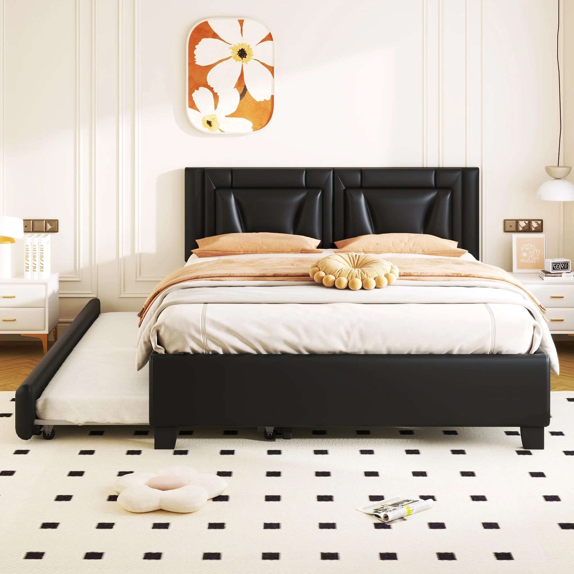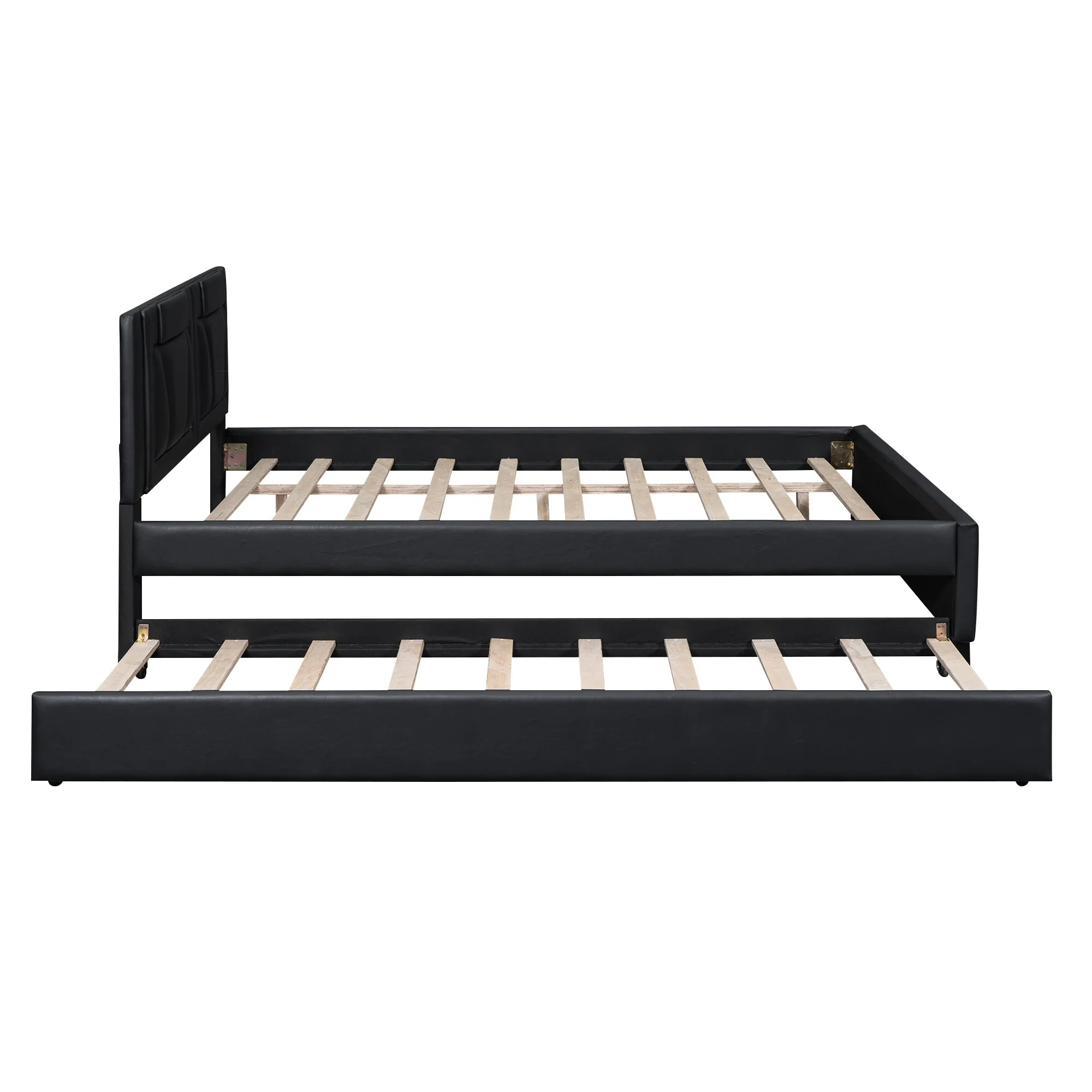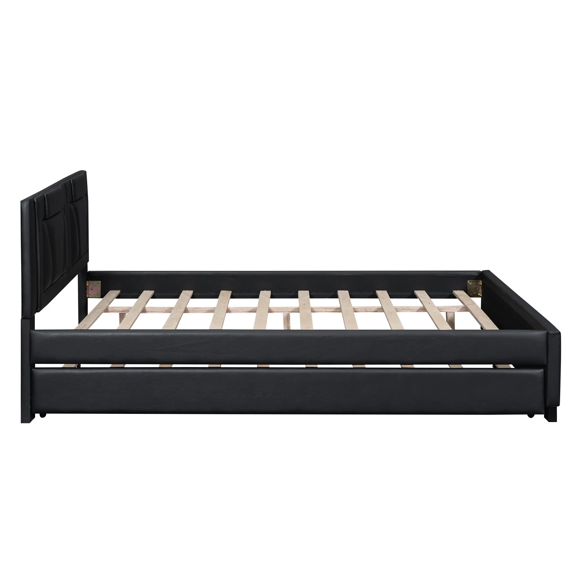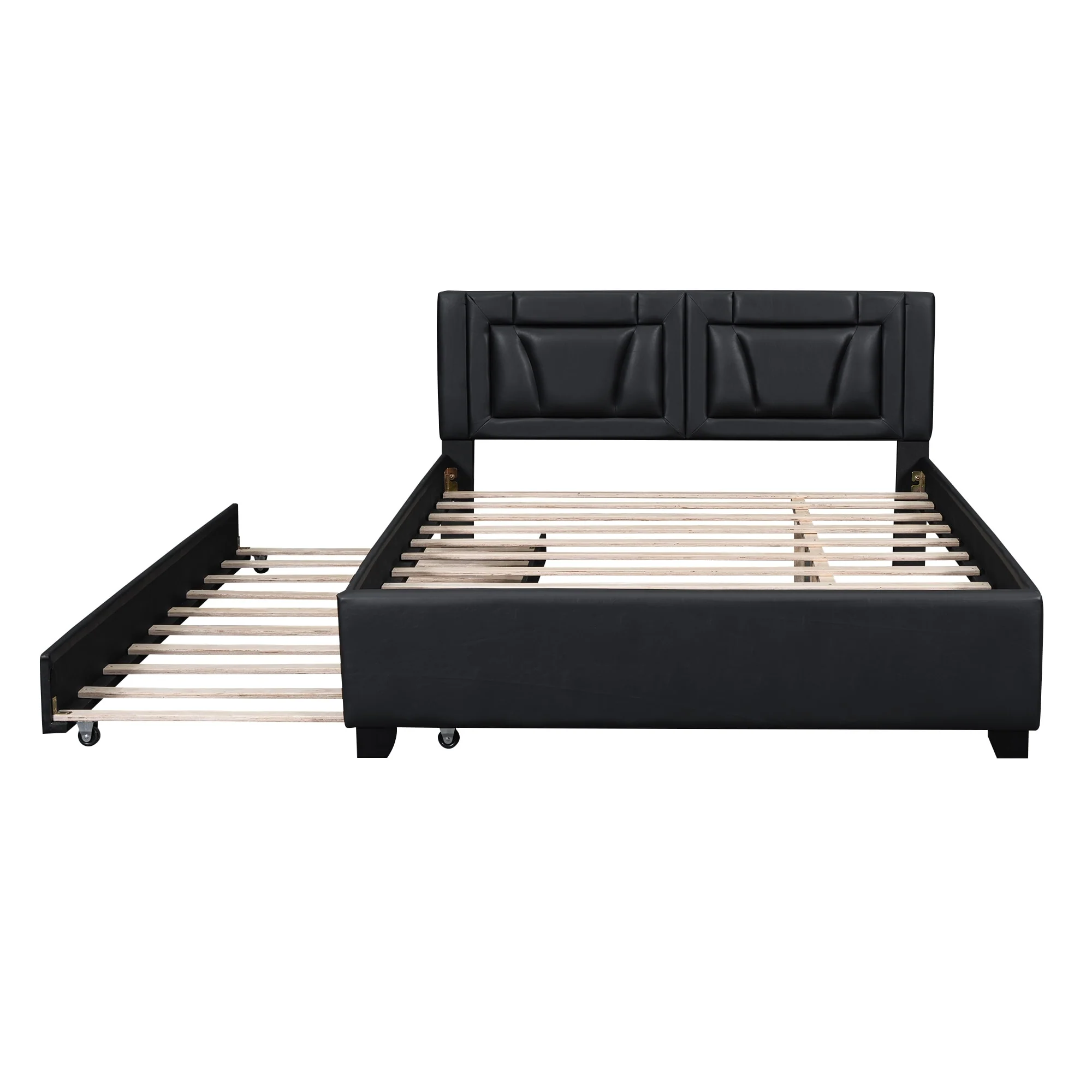 This elegant Queen Size Upholstered Platform Bed with a Twin Size Trundle offers both style and functionality for your bedroom. The sleek black PU leather headboard adds a touch of modern sophistication, while the twin trundle bed provides extra sleeping space for guests. Crafted from solid pine wood and MDF, the sturdy construction ensures durability and stability for long-term use. With no need for a box spring, the slatted support system offers firm mattress support, creating a comfortable and clutter-free sleeping space. Perfect for guest rooms, master bedrooms, or any space requiring extra functionality.