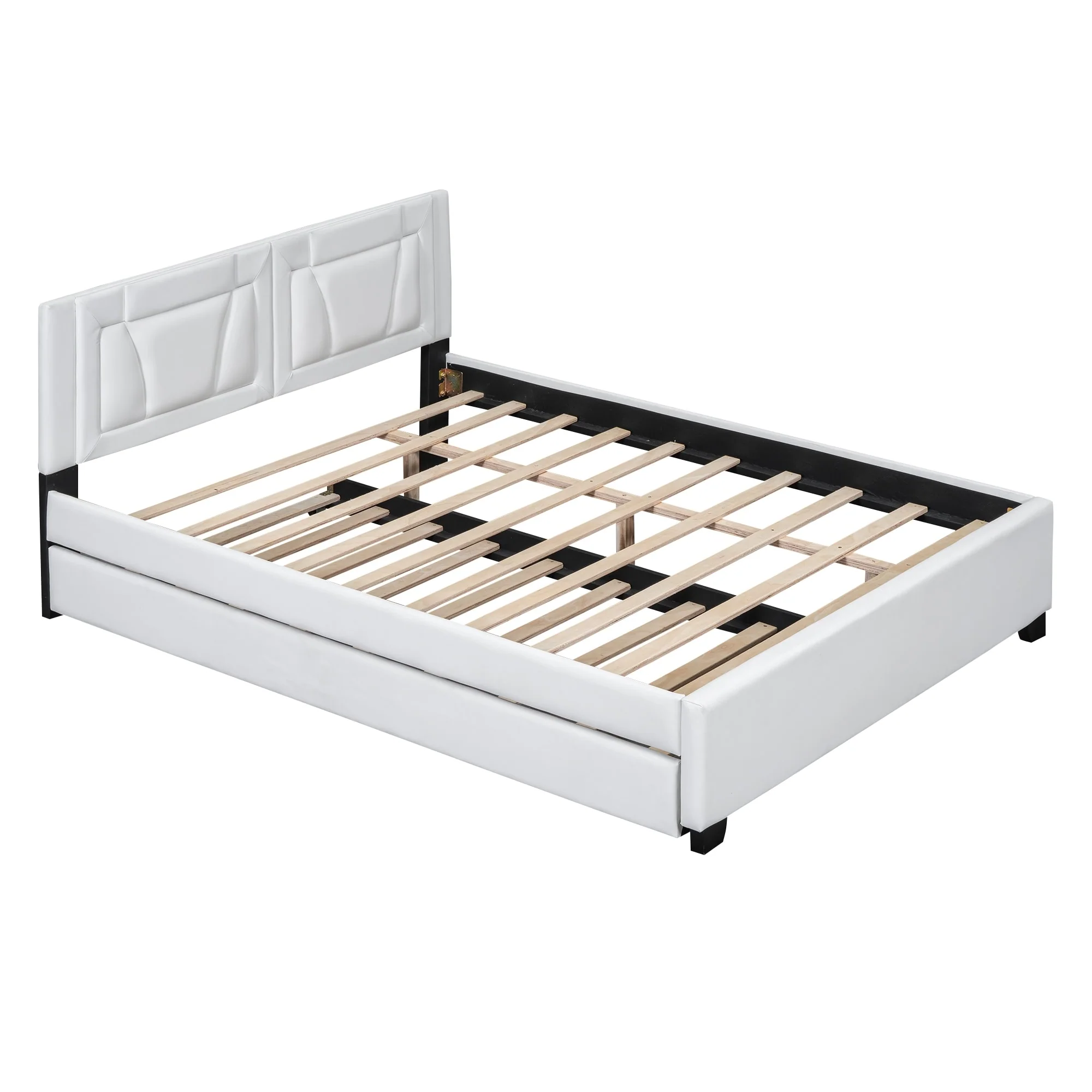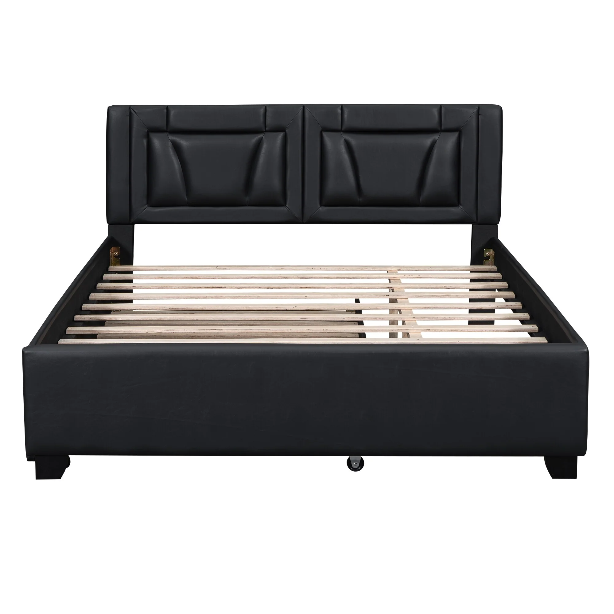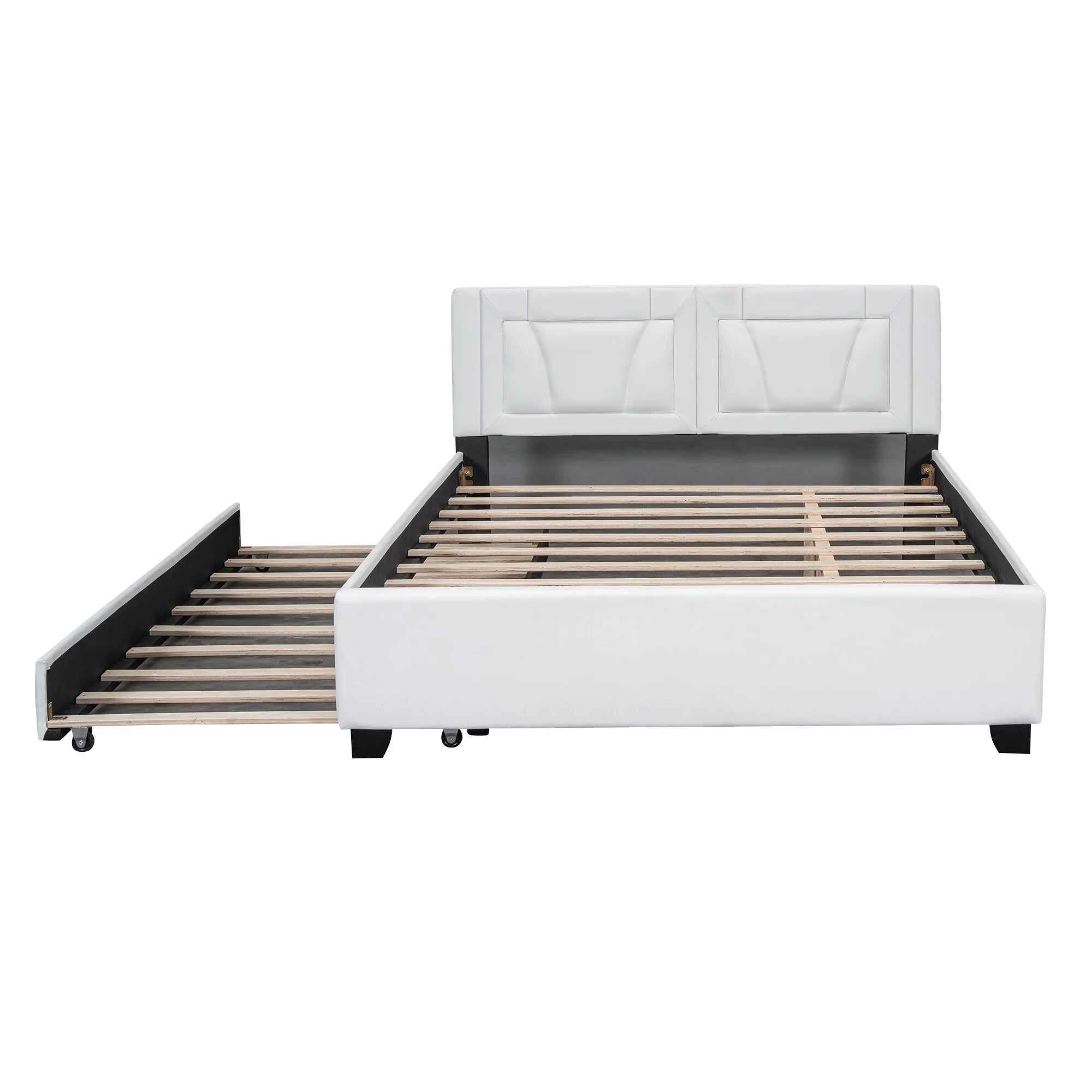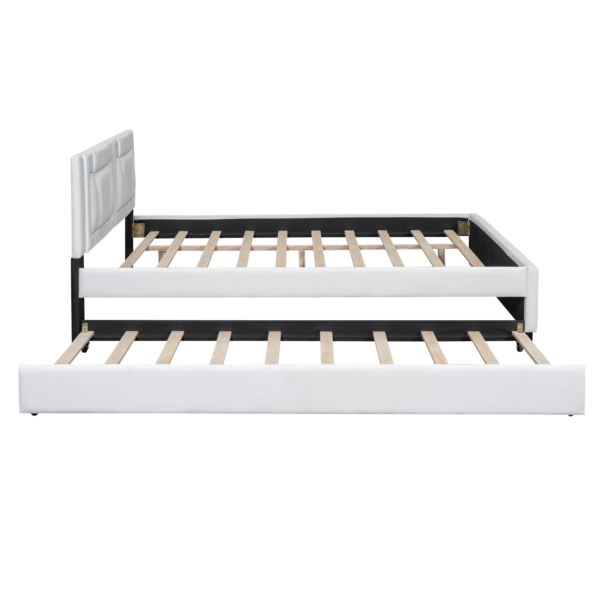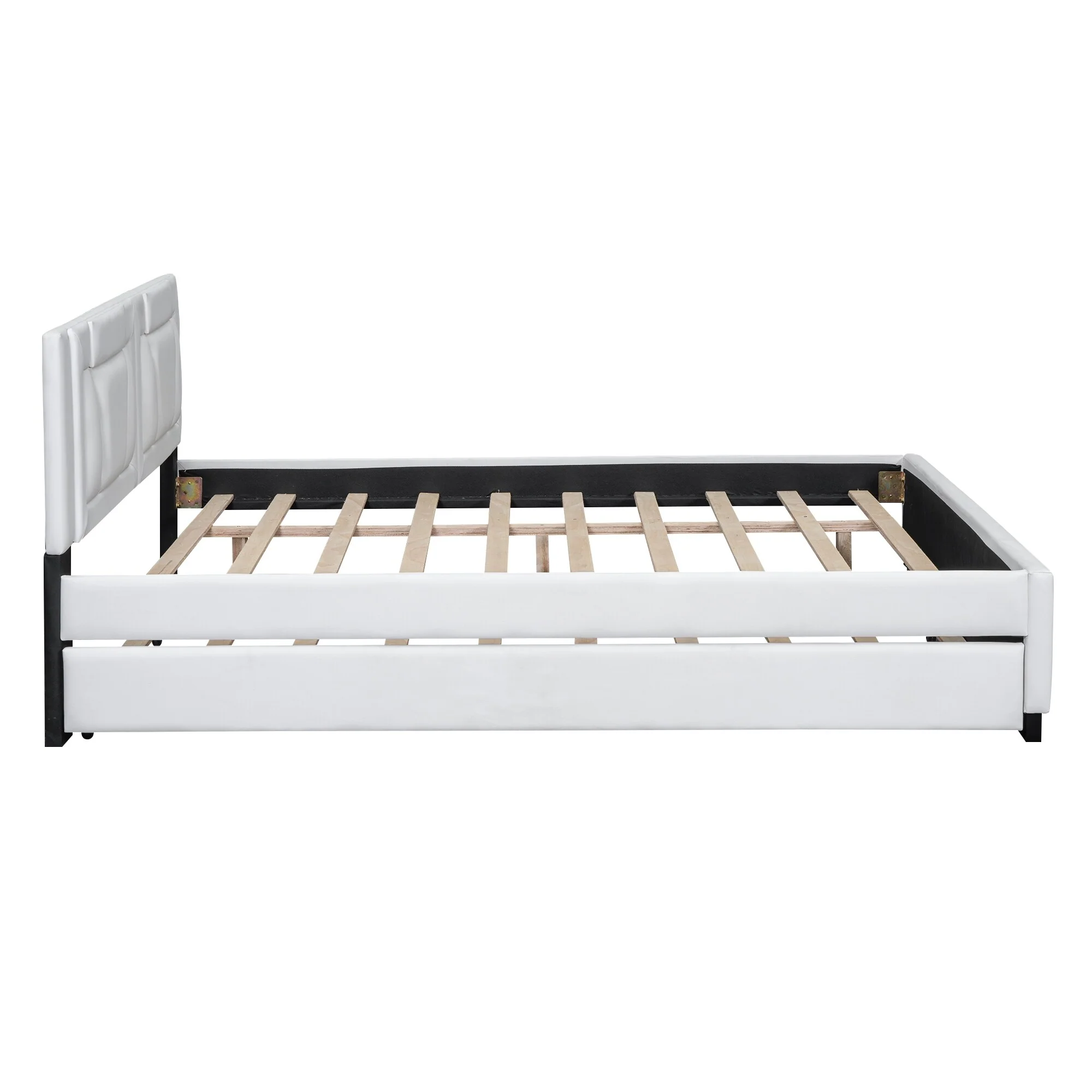 This elegant Queen Size Upholstered Platform Bed with a Twin Size Trundle offers both style and functionality for your bedroom. The sleek black PU leather headboard adds a touch of modern sophistication, while the twin trundle bed provides extra sleeping space for guests. Crafted from solid pine wood and MDF, the sturdy construction ensures durability and stability for long-term use. With no need for a box spring, the slatted support system offers firm mattress support, creating a comfortable and clutter-free sleeping space. Perfect for guest rooms, master bedrooms, or any space requiring extra functionality.