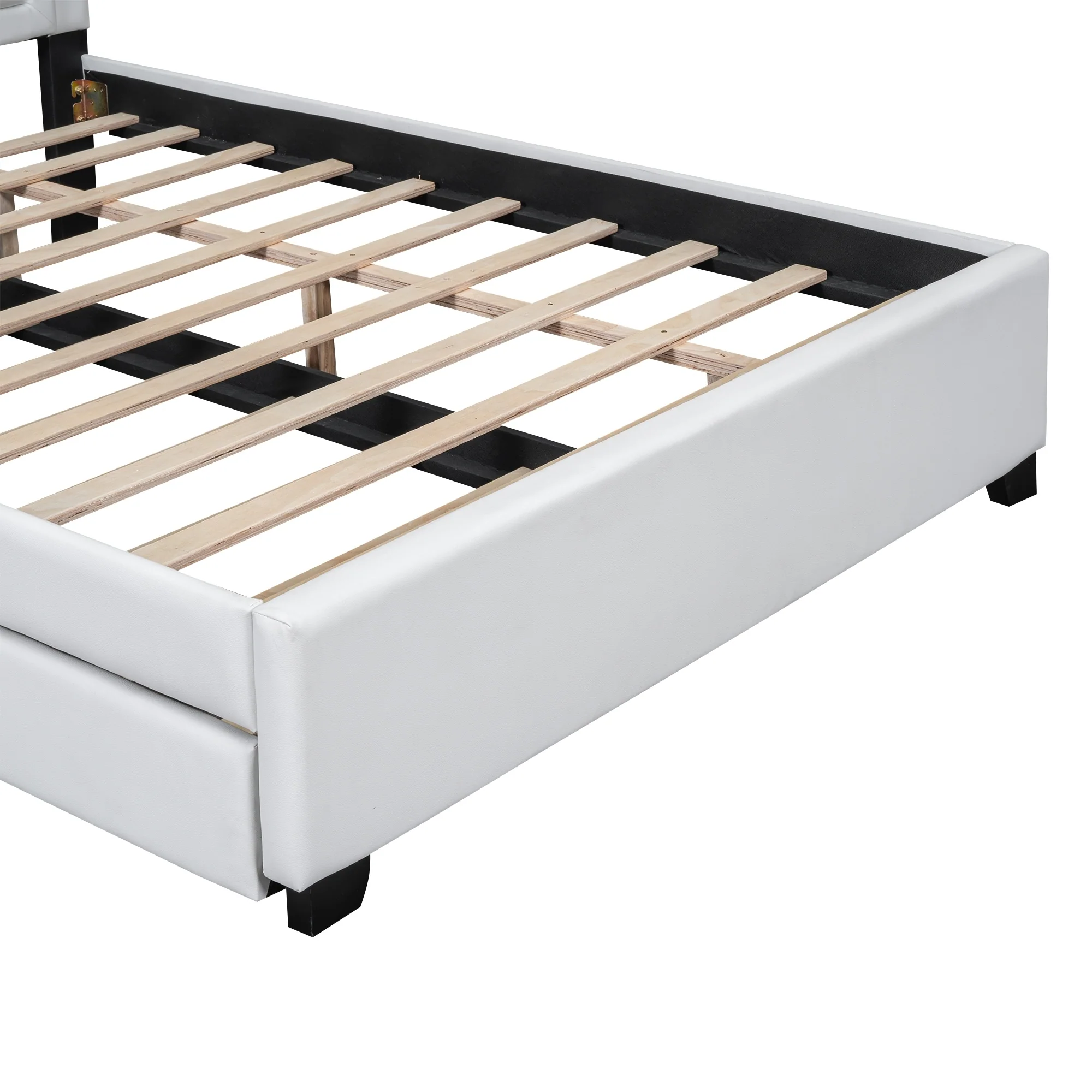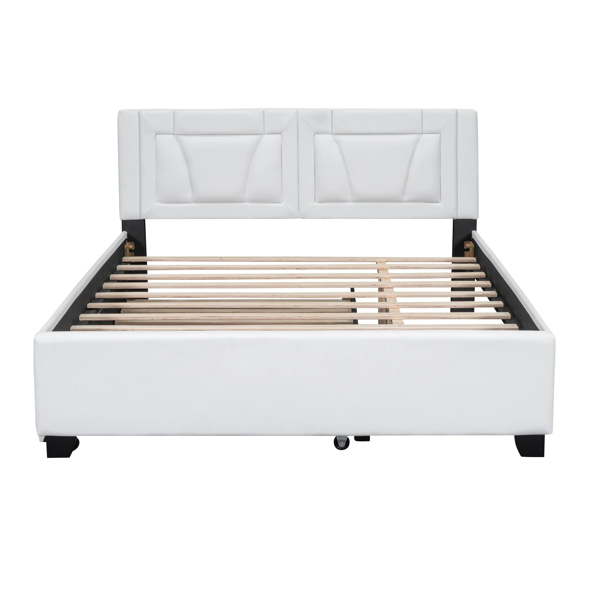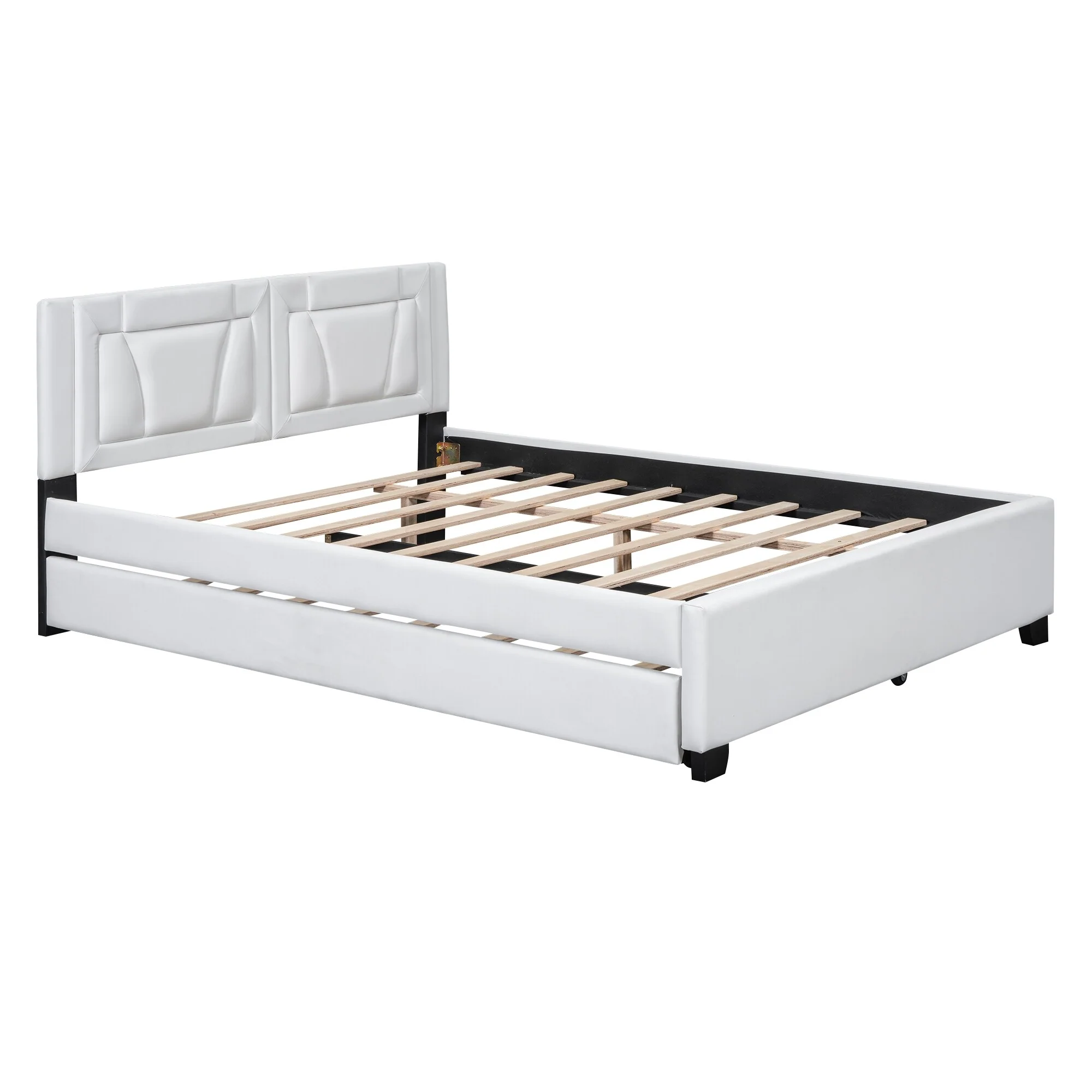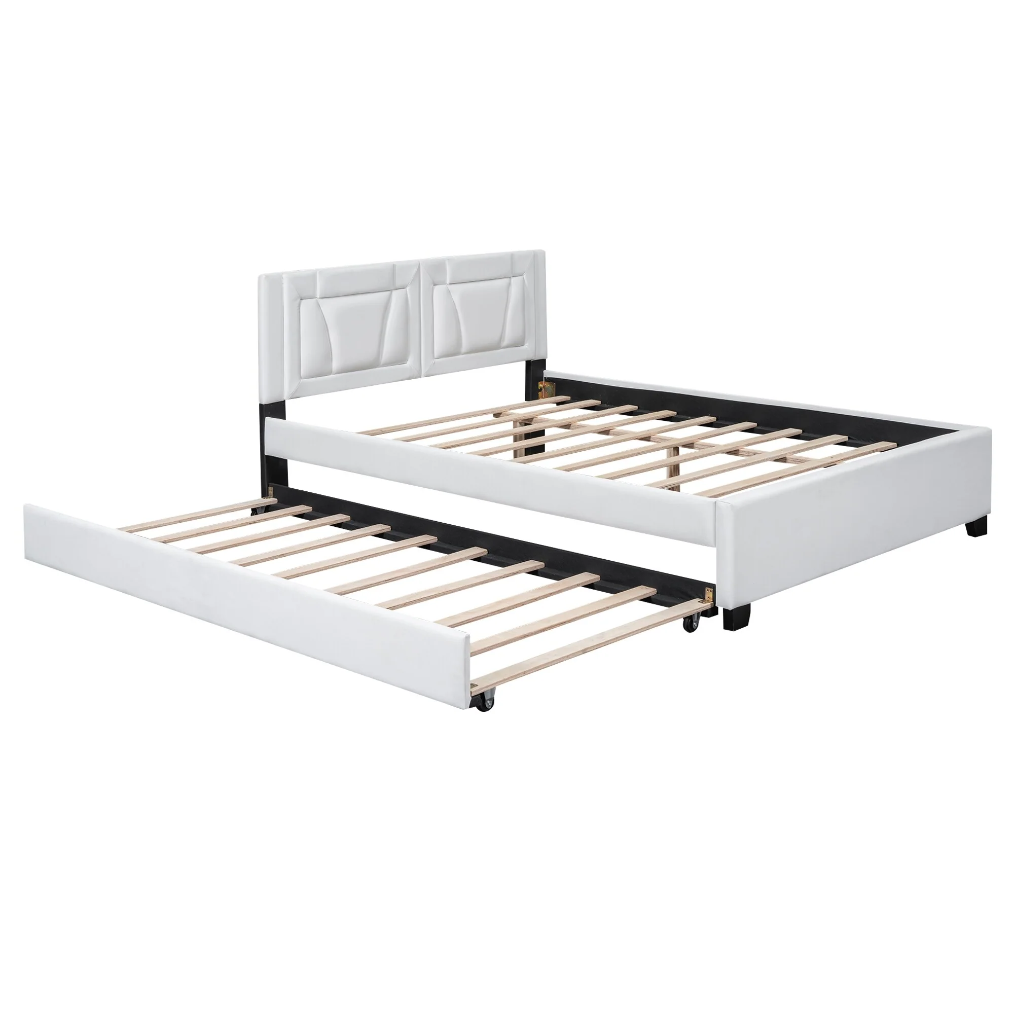 This elegant Queen Size Upholstered Platform Bed with a Twin Size Trundle offers both style and functionality for your bedroom. The sleek black PU leather headboard adds a touch of modern sophistication, while the twin trundle bed provides extra sleeping space for guests. Crafted from solid pine wood and MDF, the sturdy construction ensures durability and stability for long-term use. With no need for a box spring, the slatted support system offers firm mattress support, creating a comfortable and clutter-free sleeping space. Perfect for guest rooms, master bedrooms, or any space requiring extra functionality.