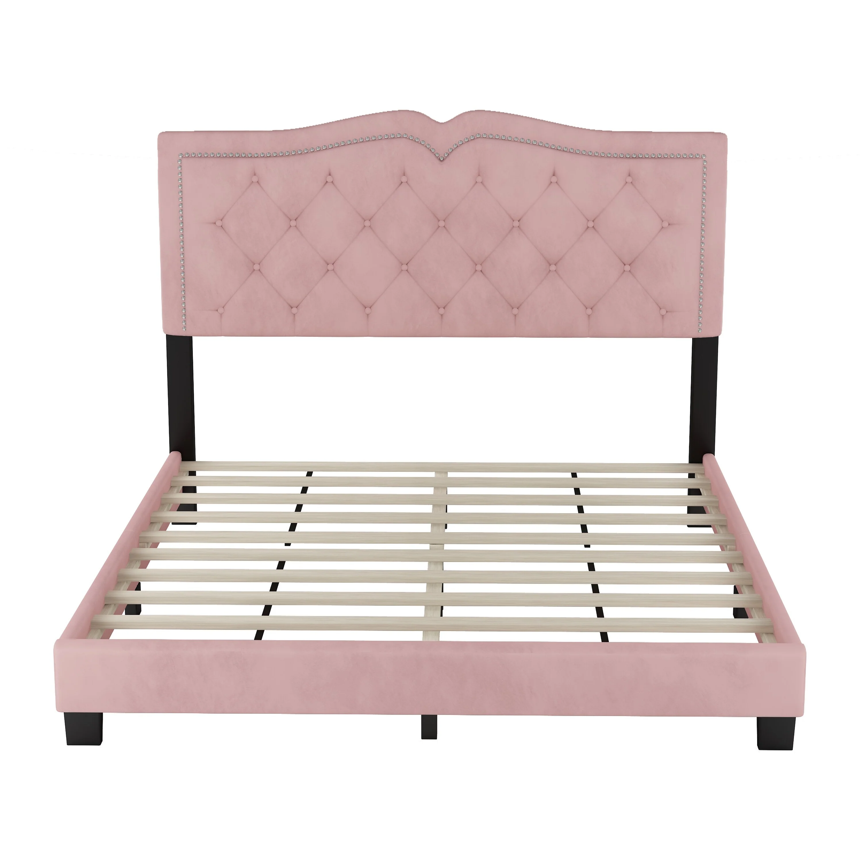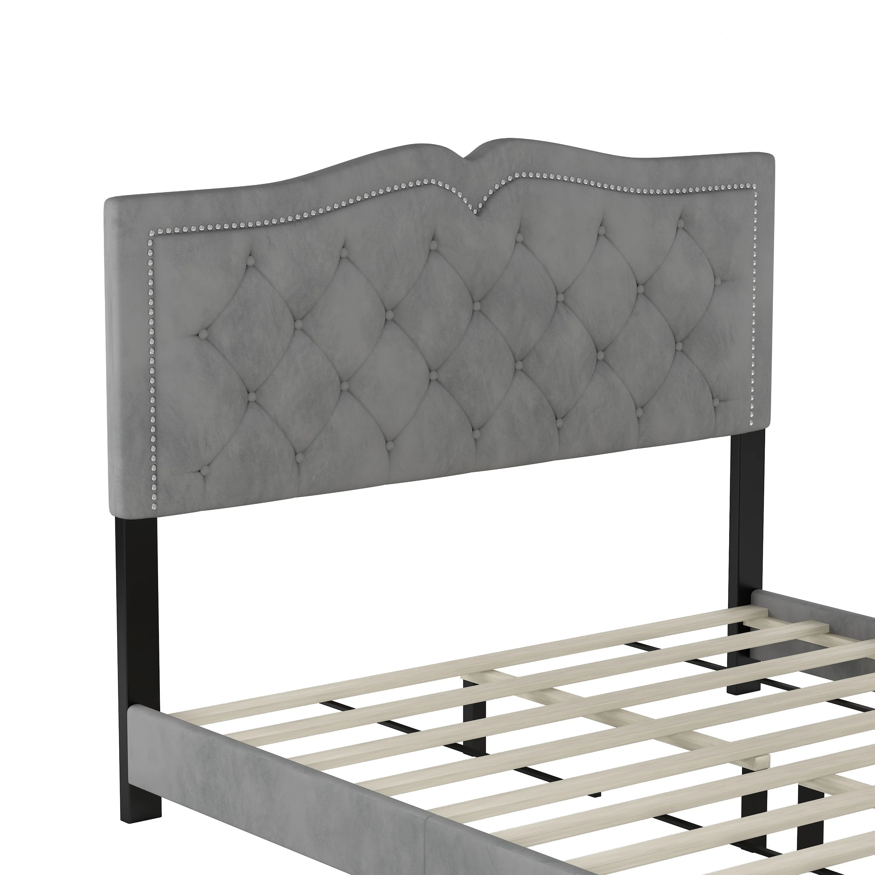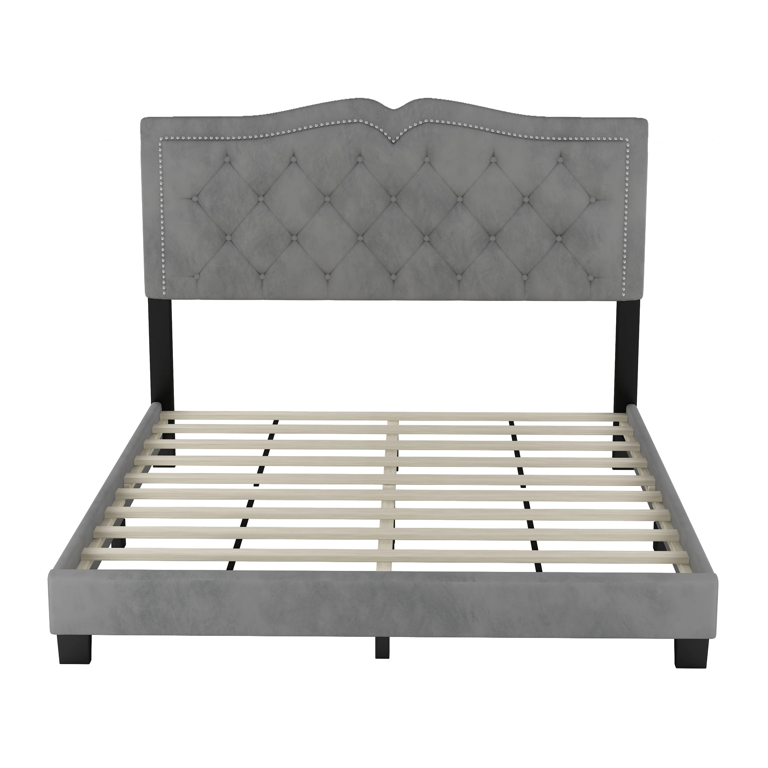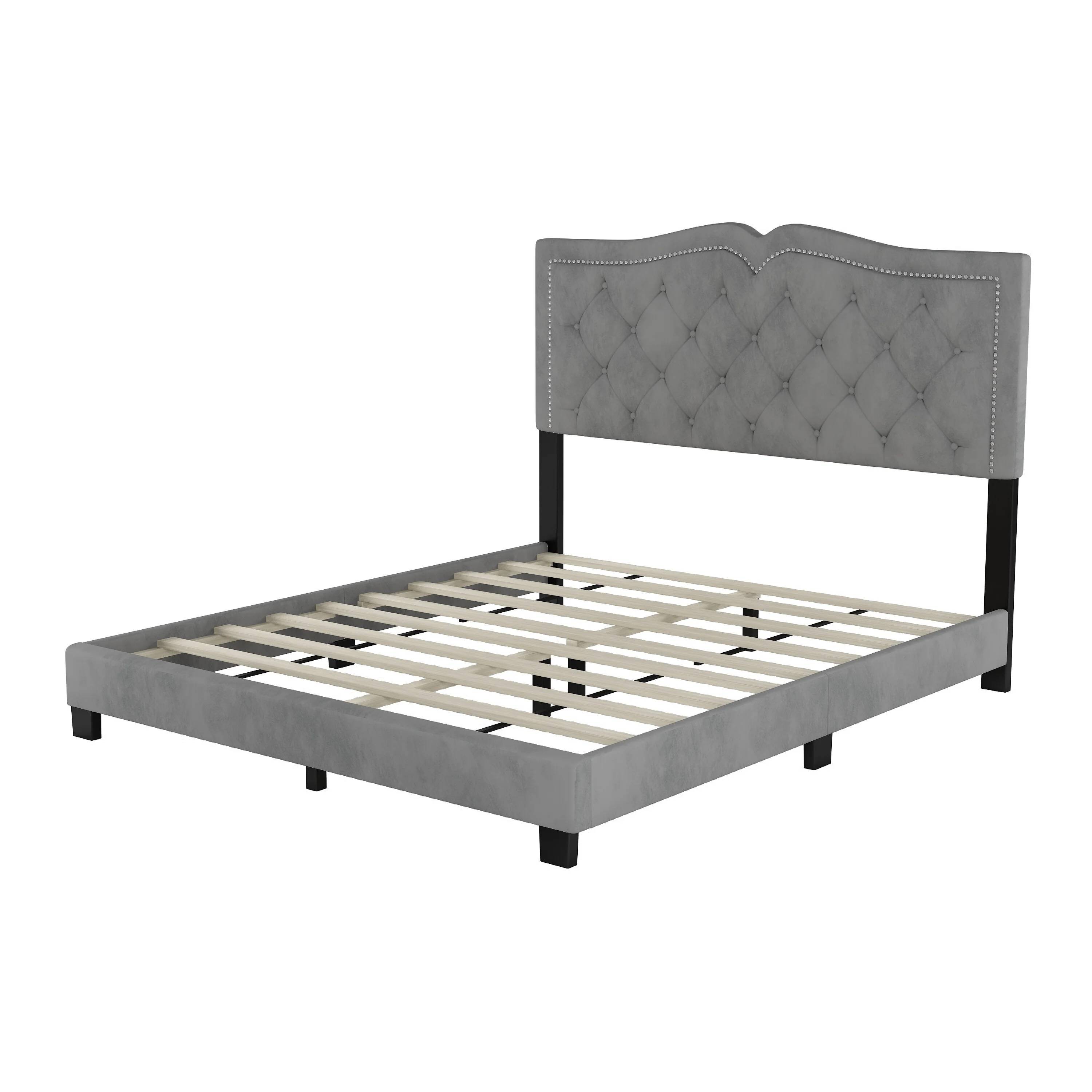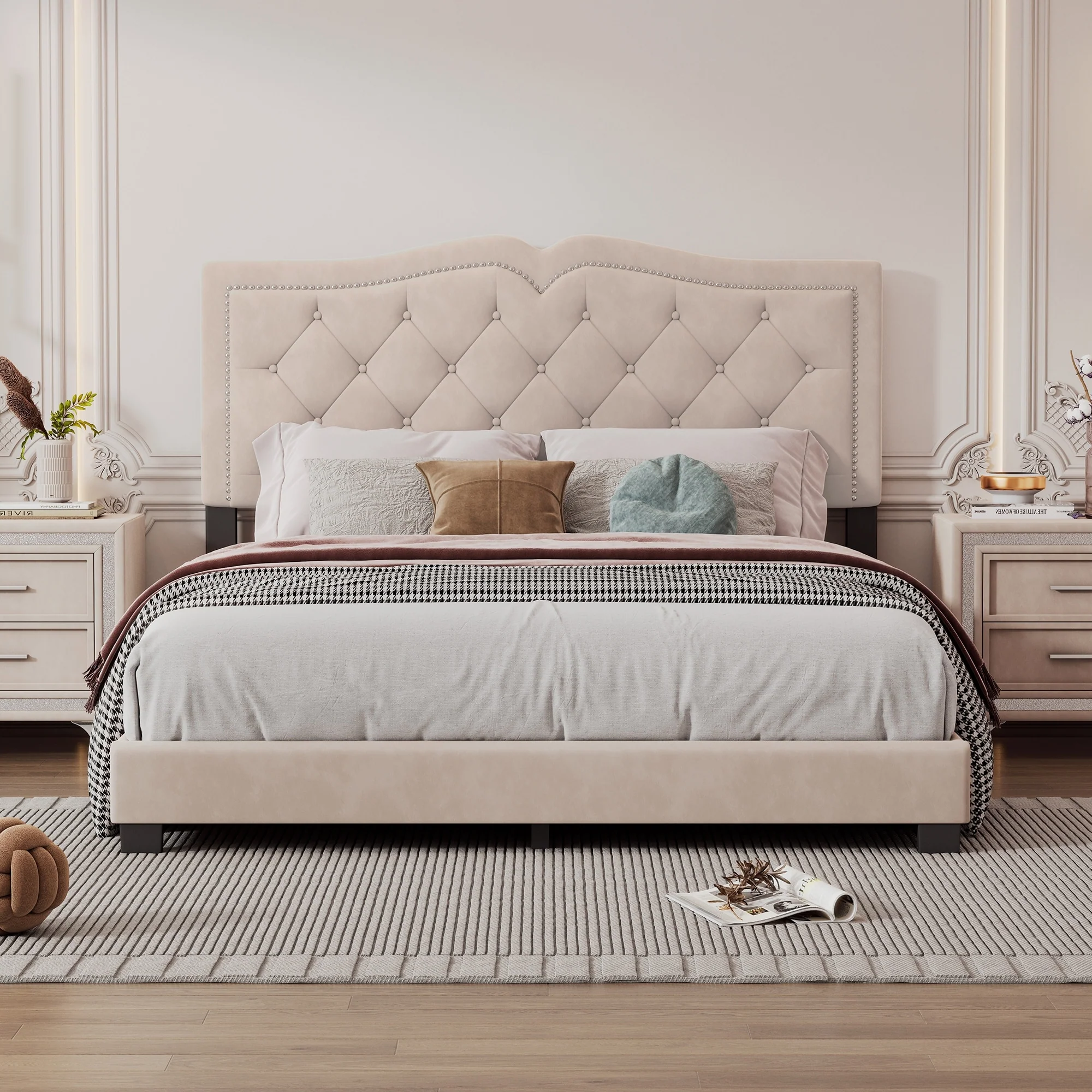 This Queen Size Upholstered Platform Bed brings an elegant and luxurious touch to your bedroom with its plush velvet headboard and charming tufted design. The decorative rivets placed along the outer edge of the tufting enhance the bed's sophisticated look. Crafted from sturdy MDF and plywood, this bed frame is designed to support up to 700 lbs, offering long-lasting durability and stability. The wooden slat system eliminates the need for a box spring, making it an efficient and stylish choice for any bedroom decor.