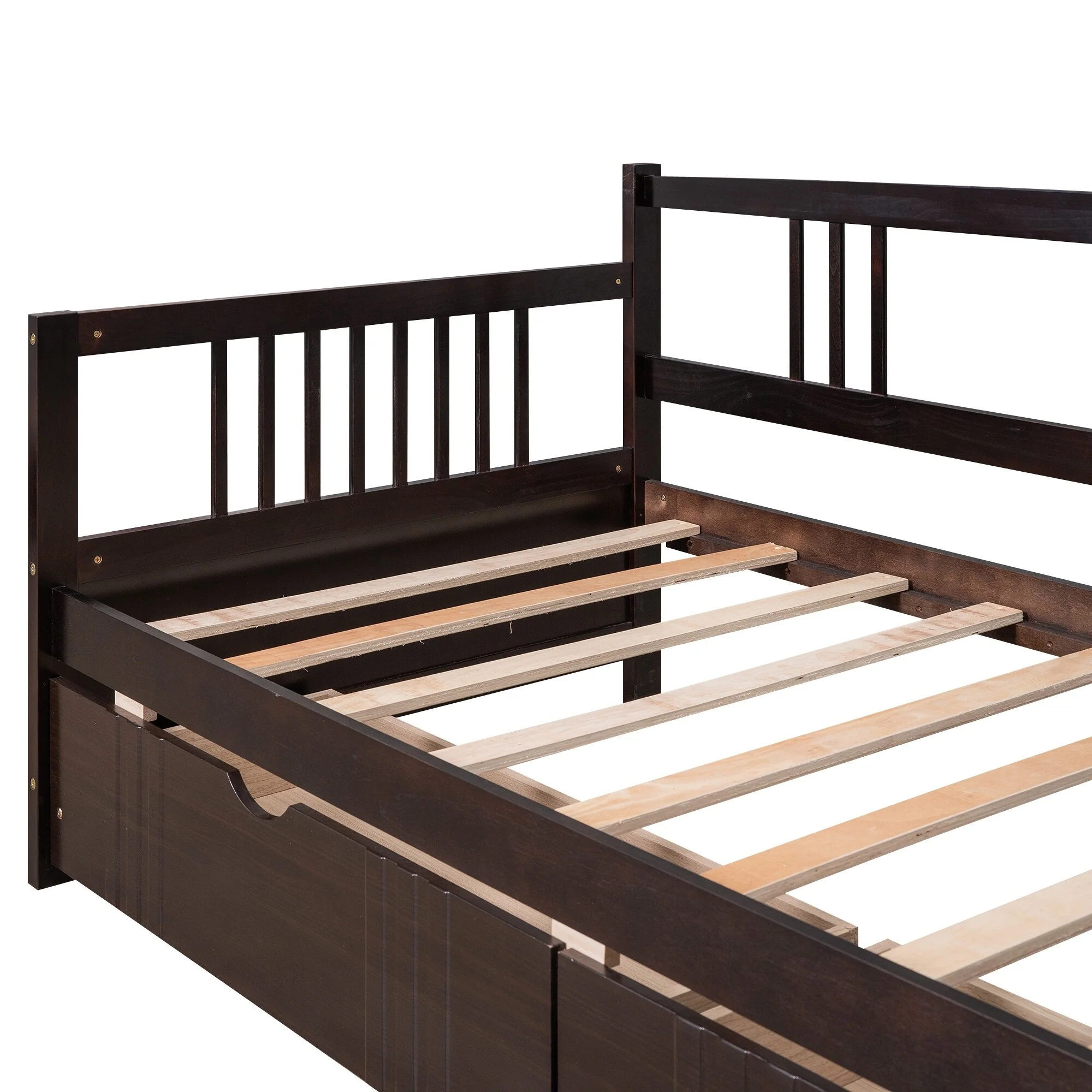 This Twin Size Daybed with two drawers is designed for both style and functionality. Crafted from sturdy pine wood, it can serve as a comfortable seating option during the day and a cozy sleeping space at night. The built-in drawers are ideal for storing extra bedding, books, or personal items, making this daybed a perfect solution for small spaces or guest rooms. Its sleek, modern design fits seamlessly into any décor style, providing both practicality and elegance.