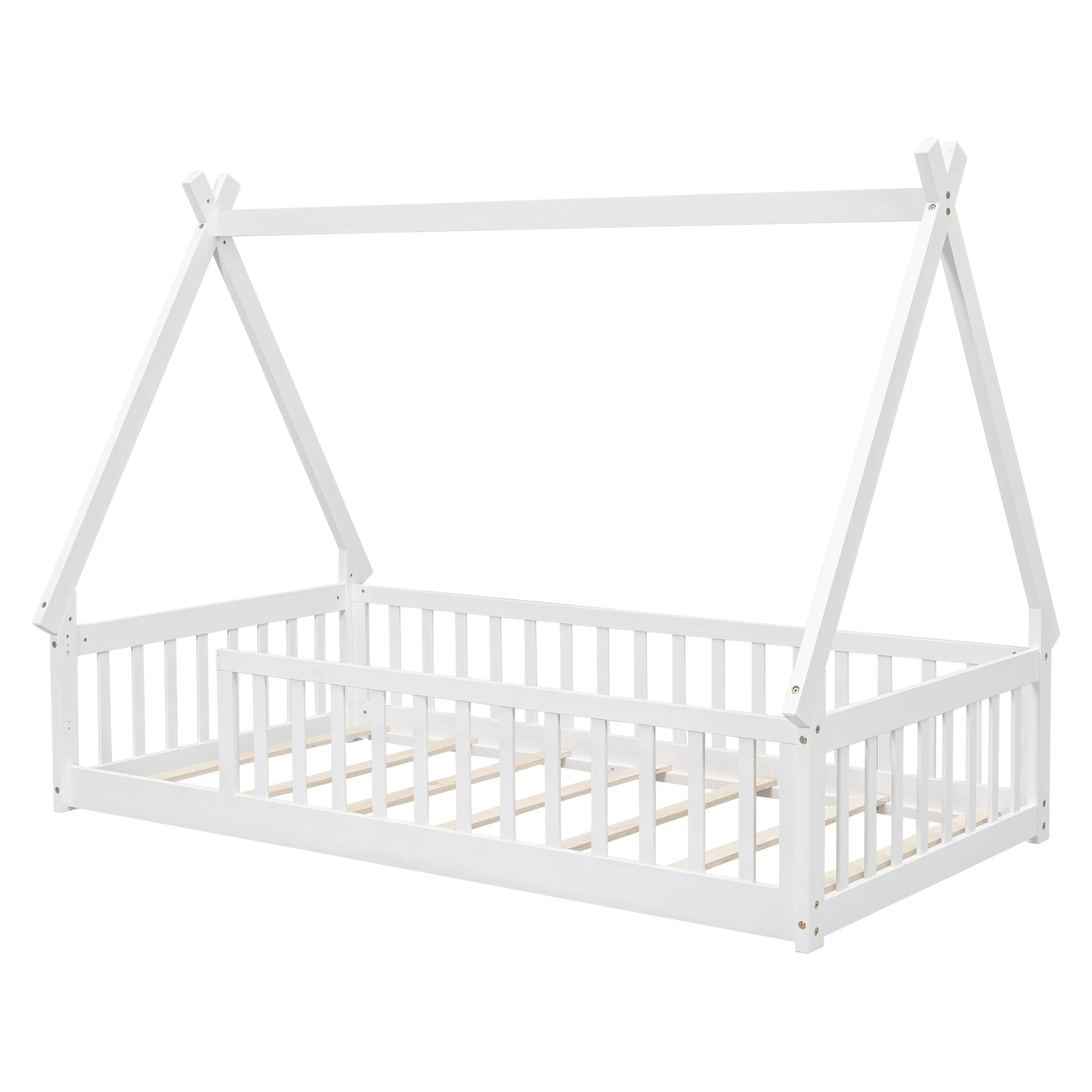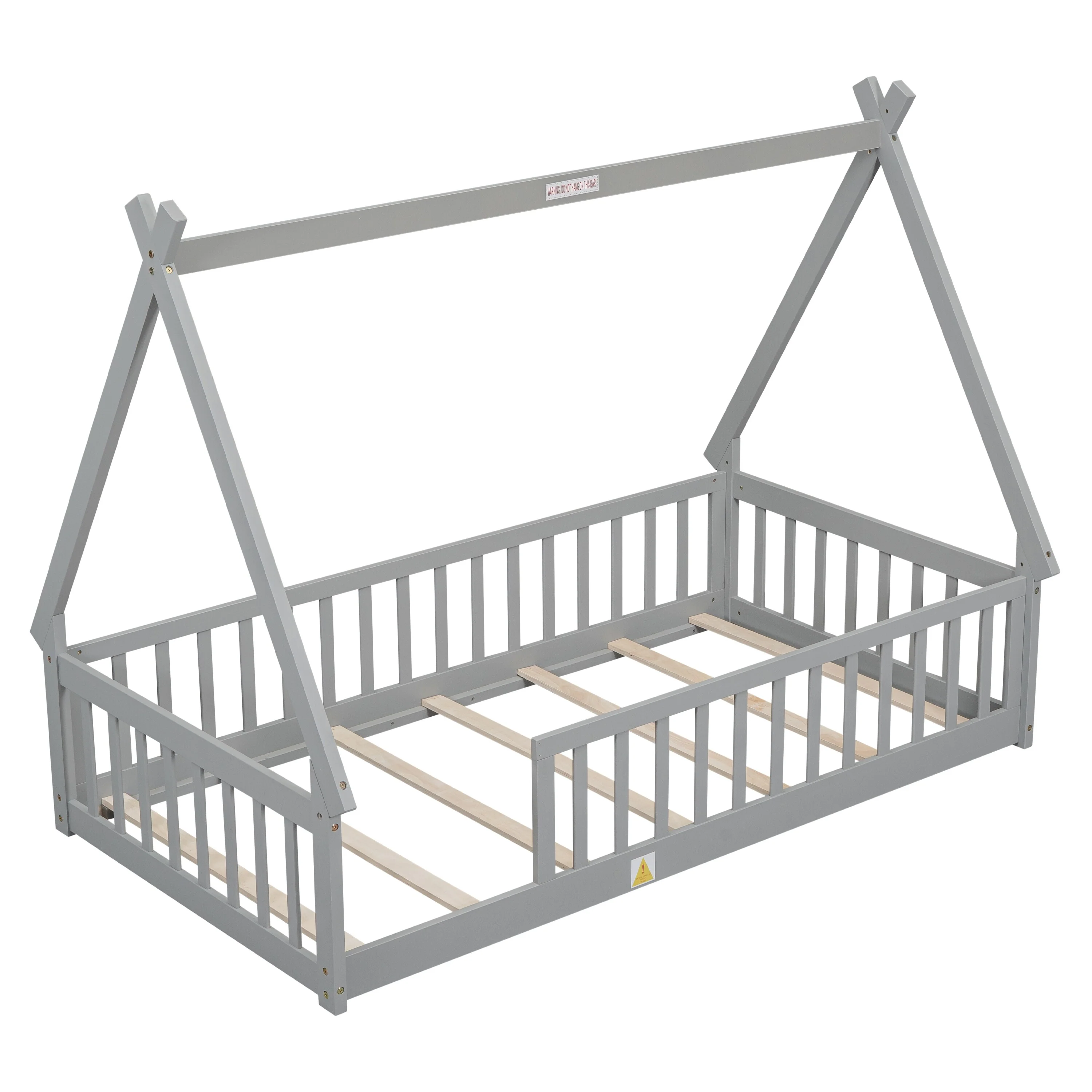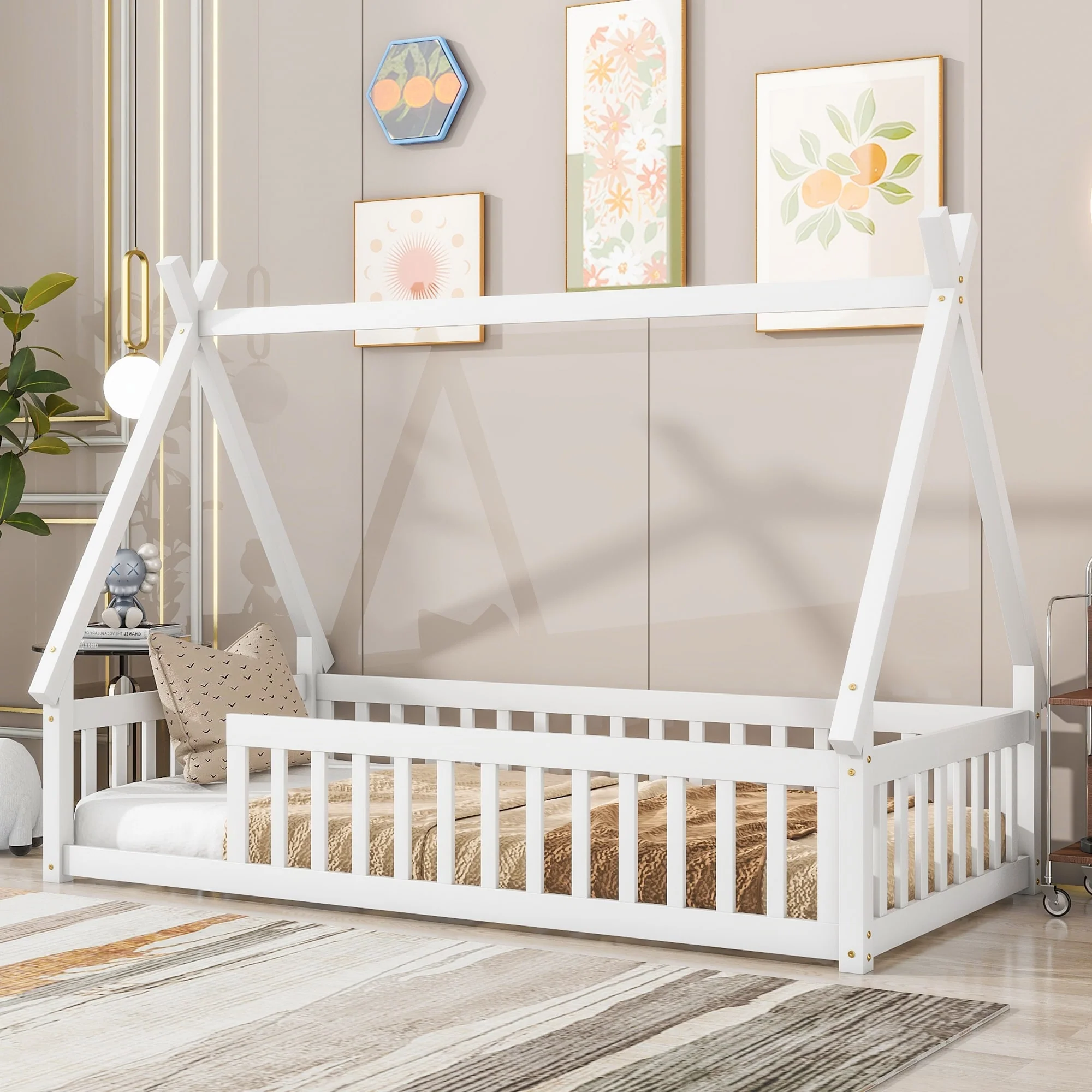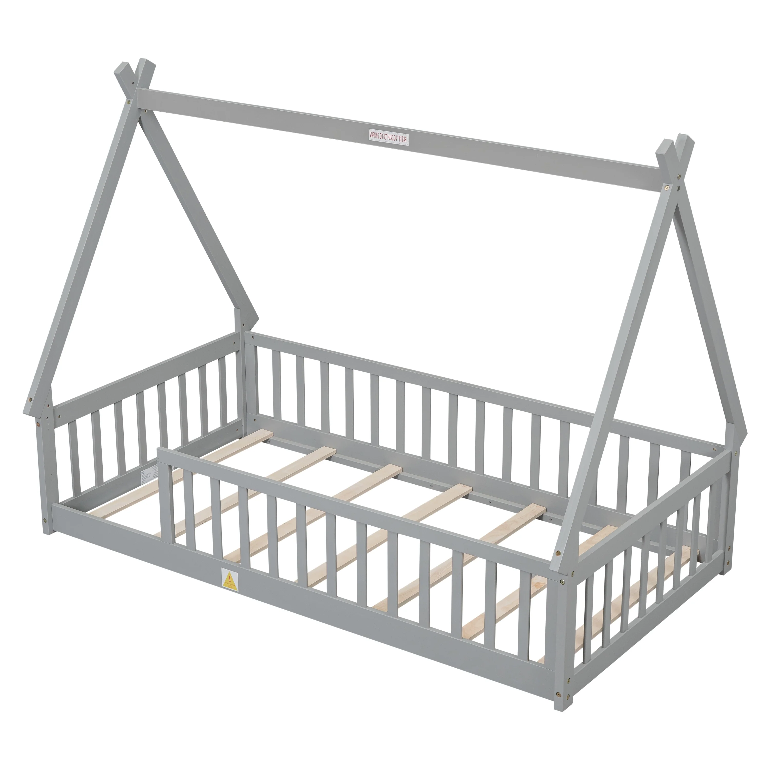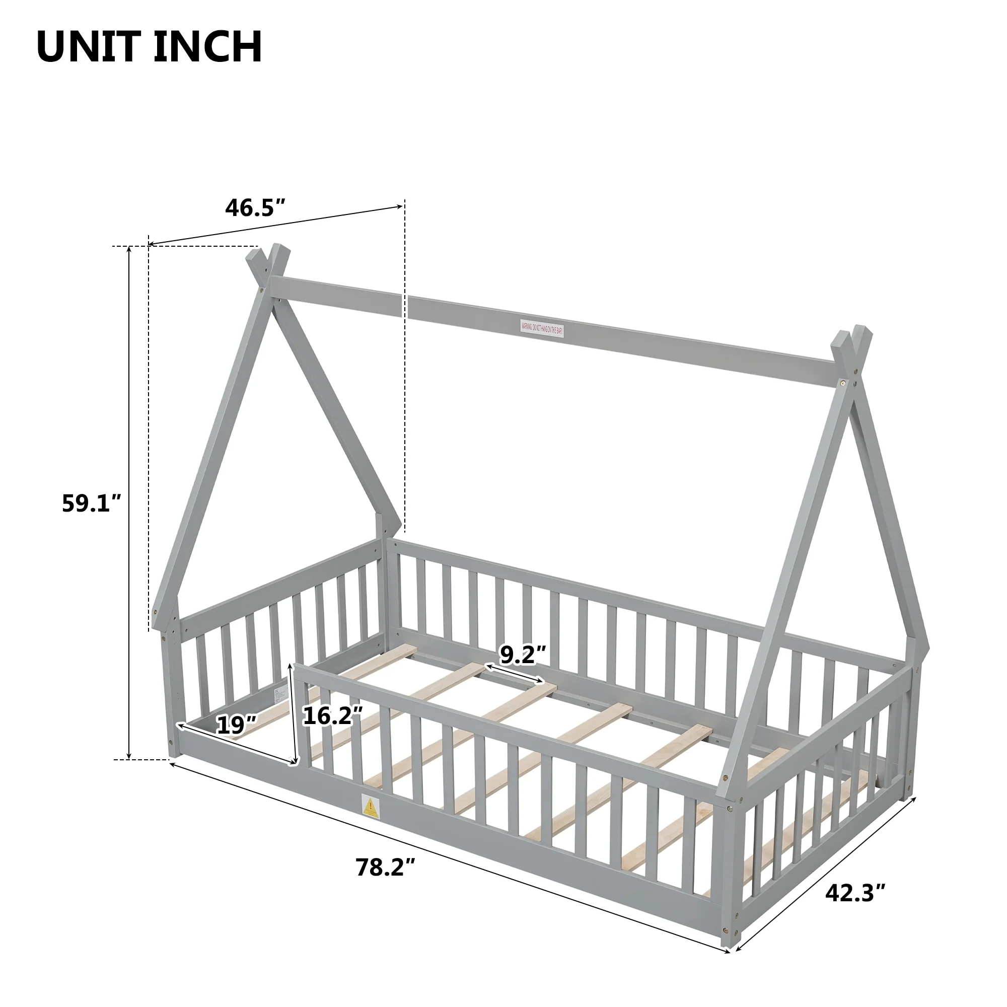 This Twin Size Tent-Shaped Floor Bed with Guardrails offers a charming and functional solution for your child's bedroom. Designed with a teepee-inspired frame, it not only provides a comfortable place to sleep but also creates an exciting space for imaginative play. The durable pine wood frame ensures stability, while the built-in guardrails around the bed provide added safety. With a focus on both aesthetics and practicality, this bed is perfect for any child who dreams of adventure while staying grounded in comfort.