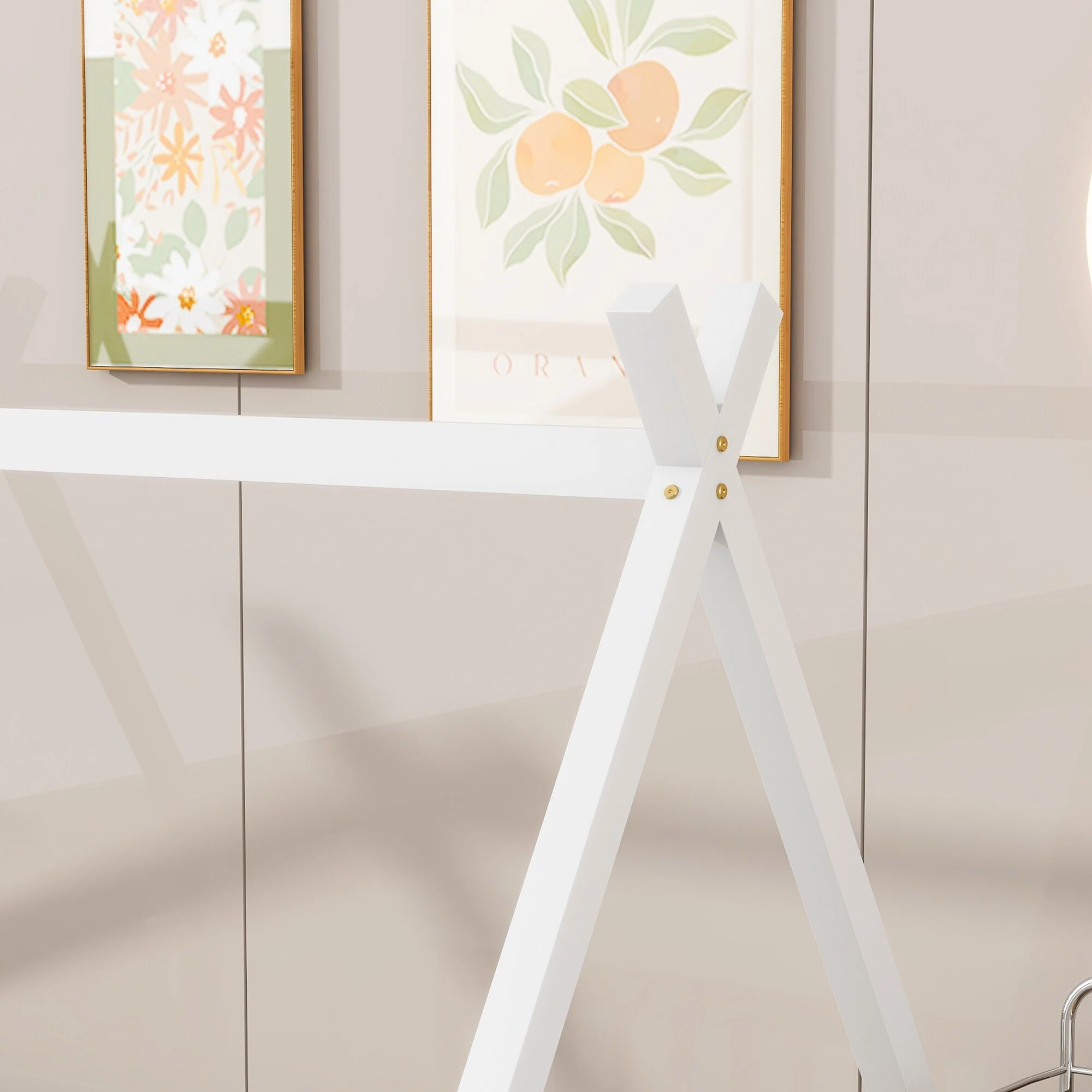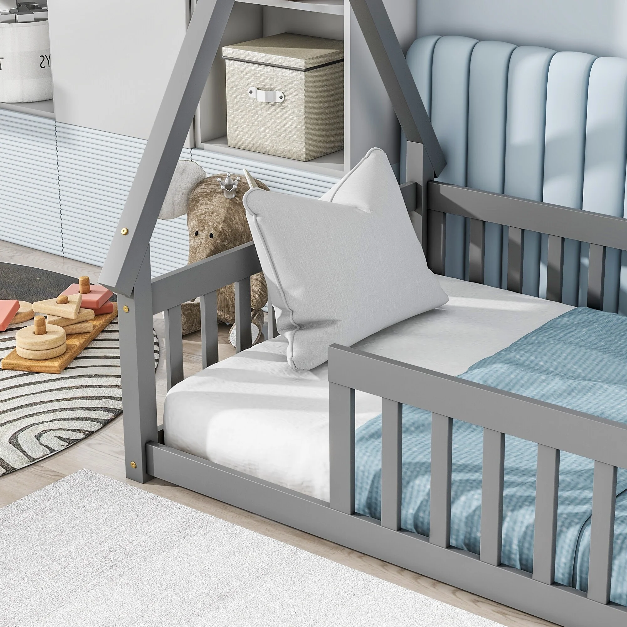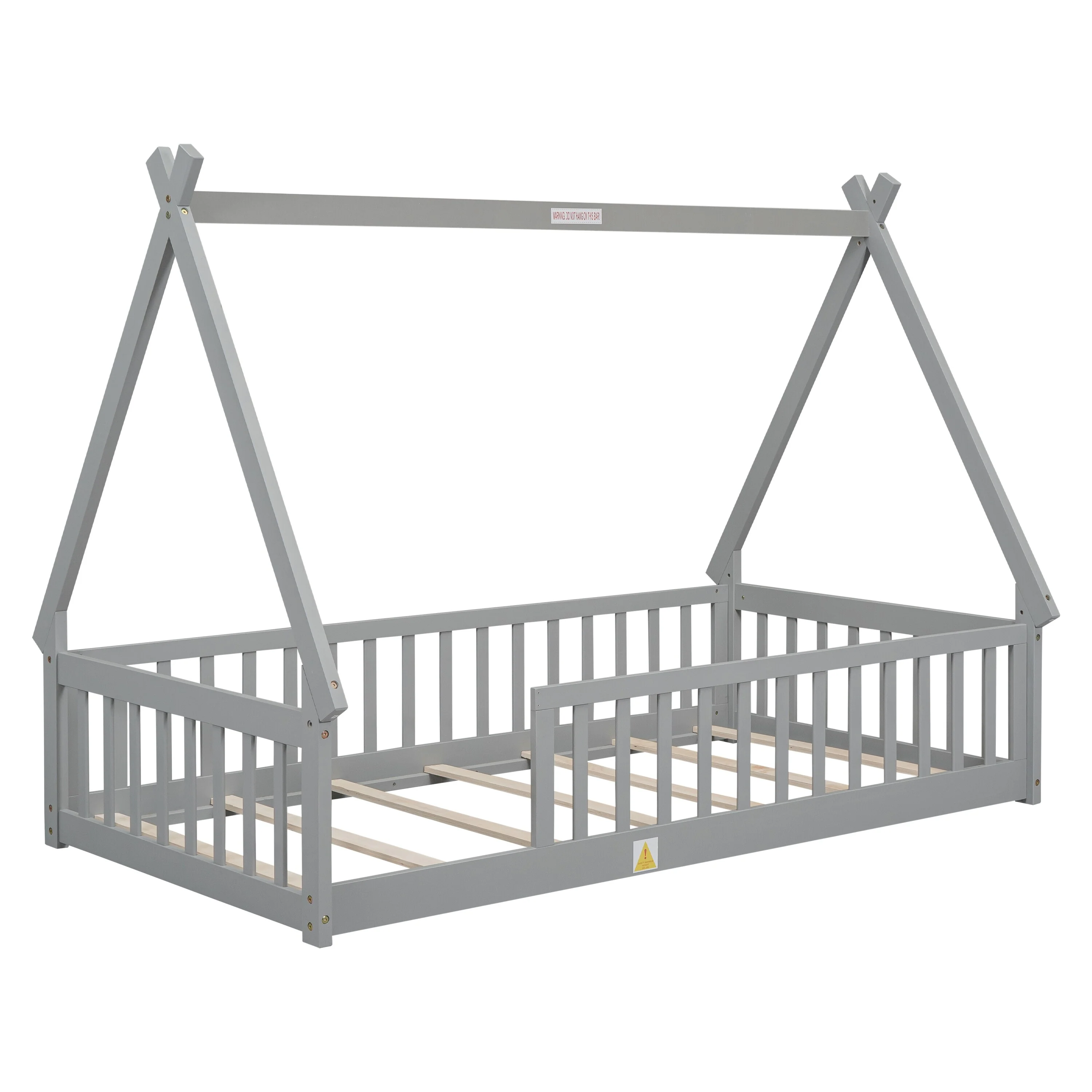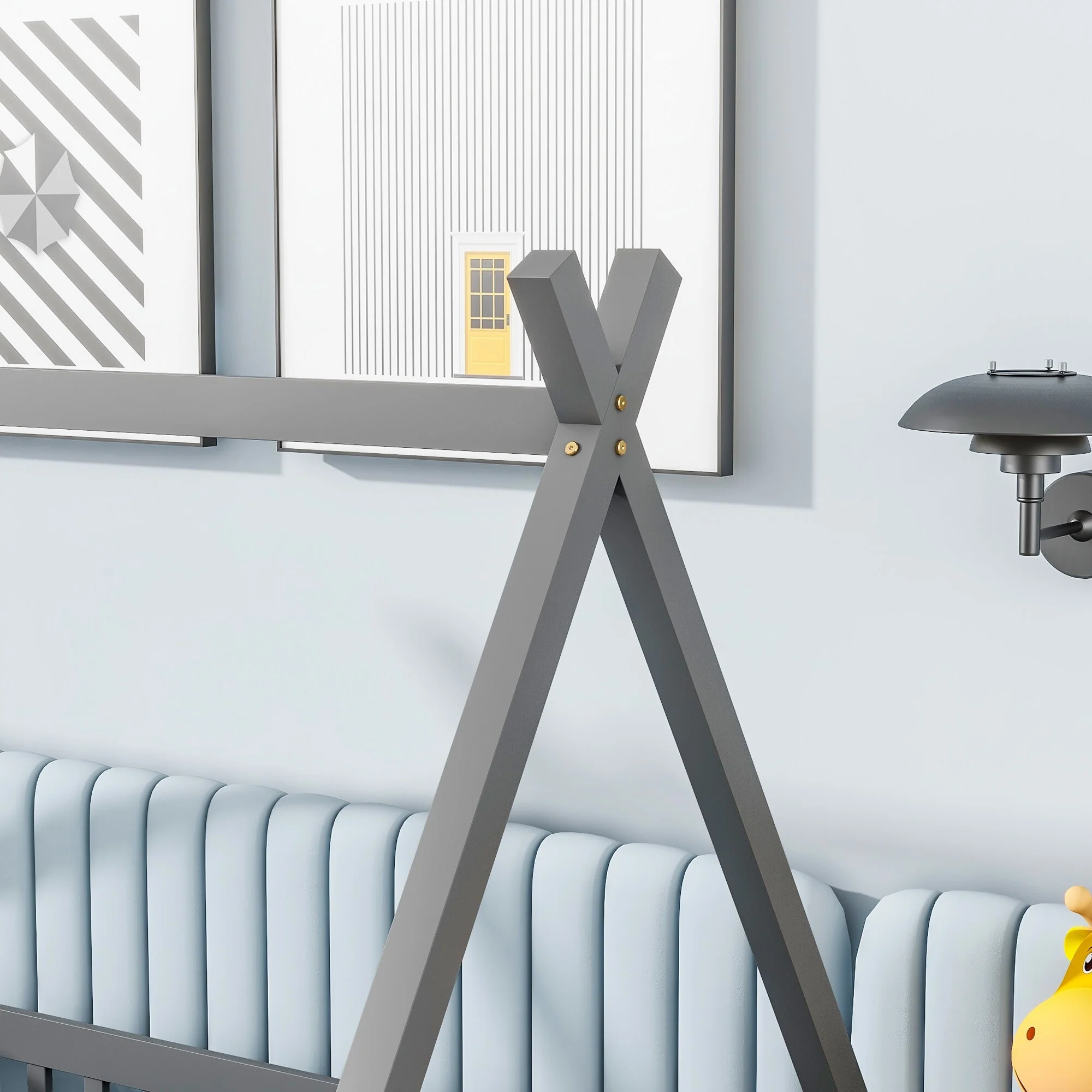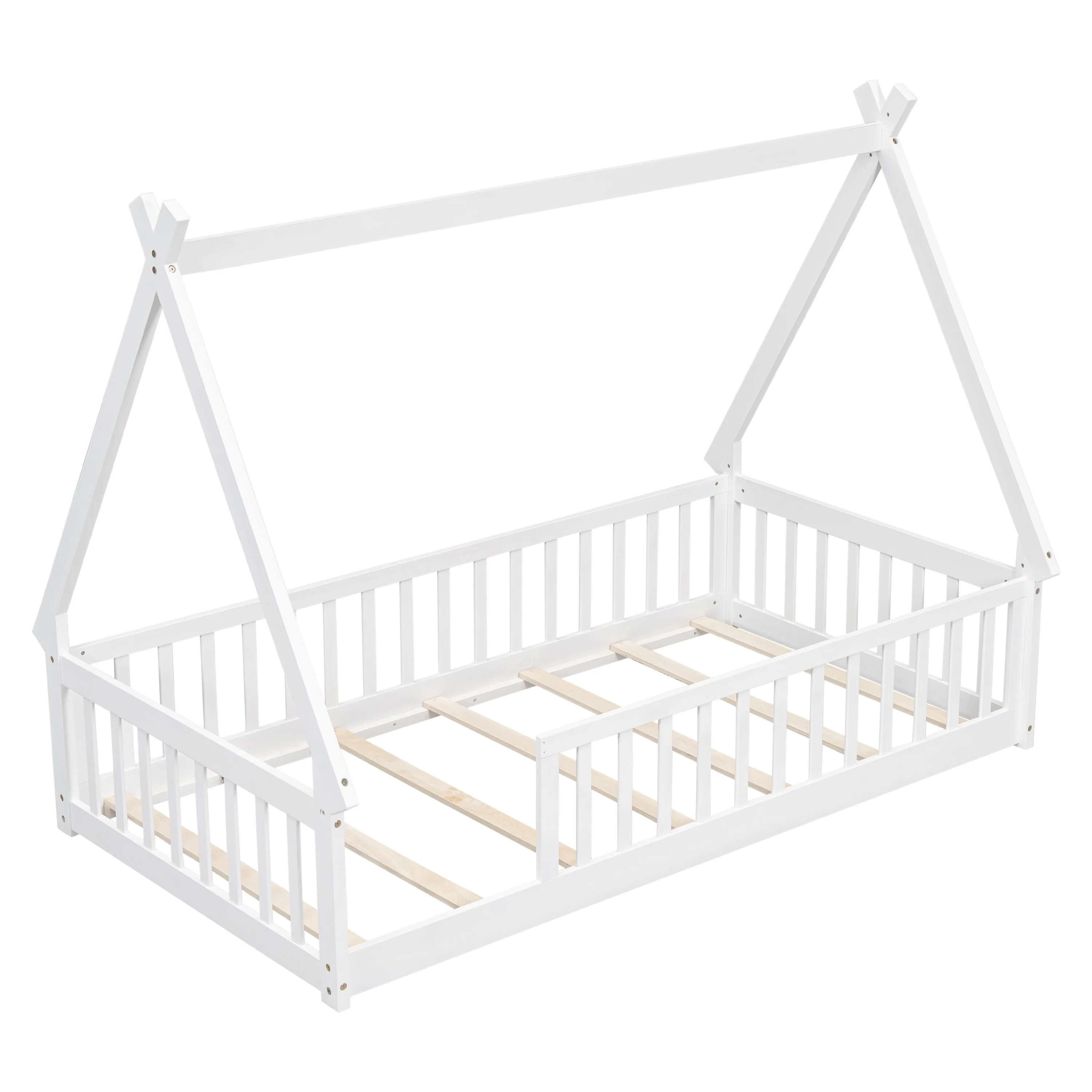 This Twin Size Tent-Shaped Floor Bed with Guardrails offers a charming and functional solution for your child's bedroom. Designed with a teepee-inspired frame, it not only provides a comfortable place to sleep but also creates an exciting space for imaginative play. The durable pine wood frame ensures stability, while the built-in guardrails around the bed provide added safety. With a focus on both aesthetics and practicality, this bed is perfect for any child who dreams of adventure while staying grounded in comfort.