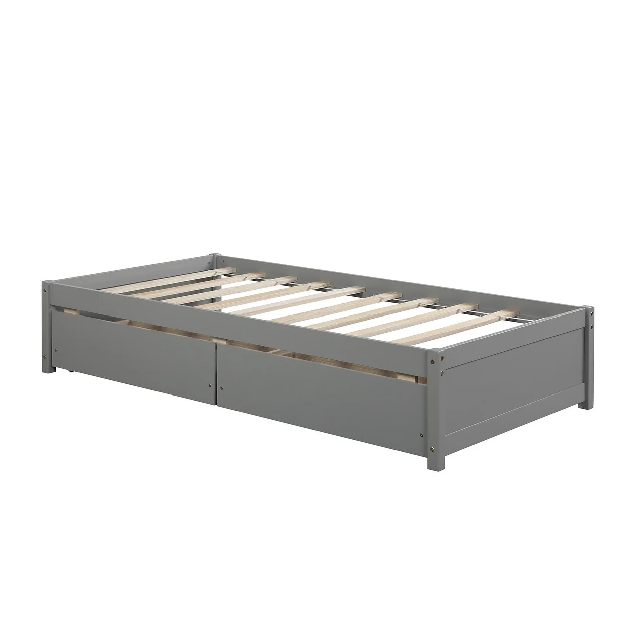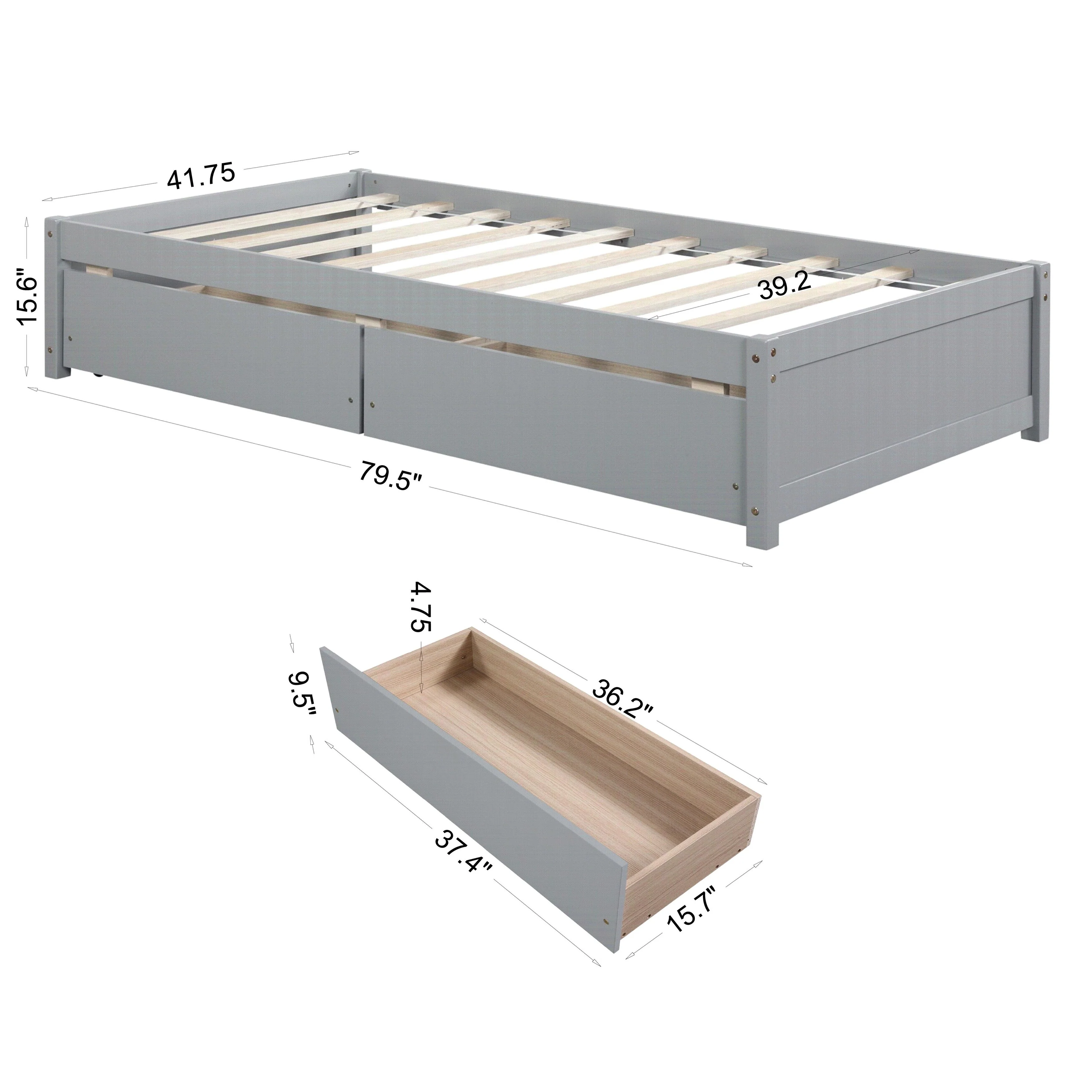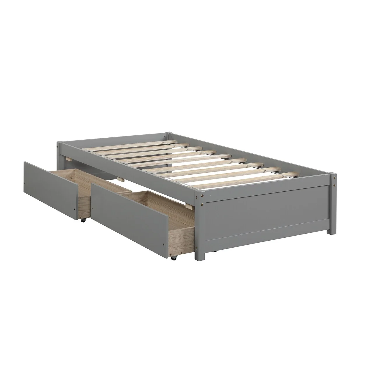 This twin size platform bed with 2 storage drawers offers a perfect combination of modern design and practical functionality. With its clean, minimalist look, this bed adds elegance to any bedroom, living room, or tight space. Made from sturdy pine wood, plywood, and MDF, the frame is built to last while providing ample storage space with two spacious drawers that glide smoothly on wheels. Ideal for keeping your room organized, this bed eliminates the need for a box spring and features solid wood slats for mattress support.