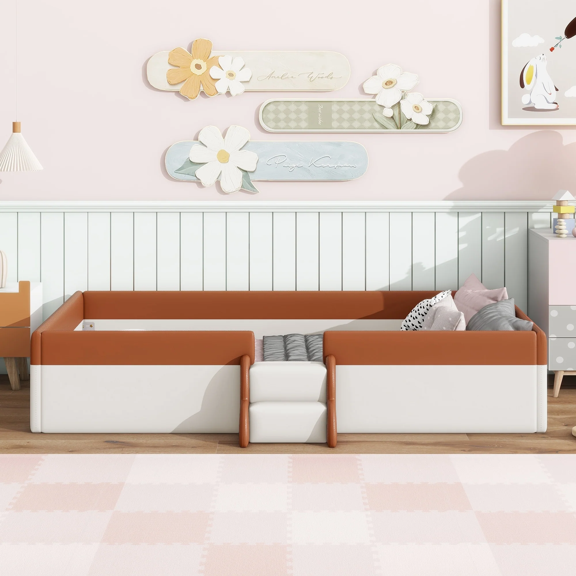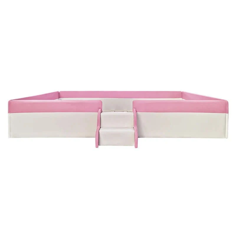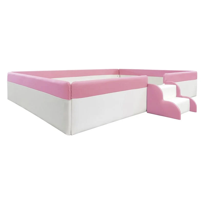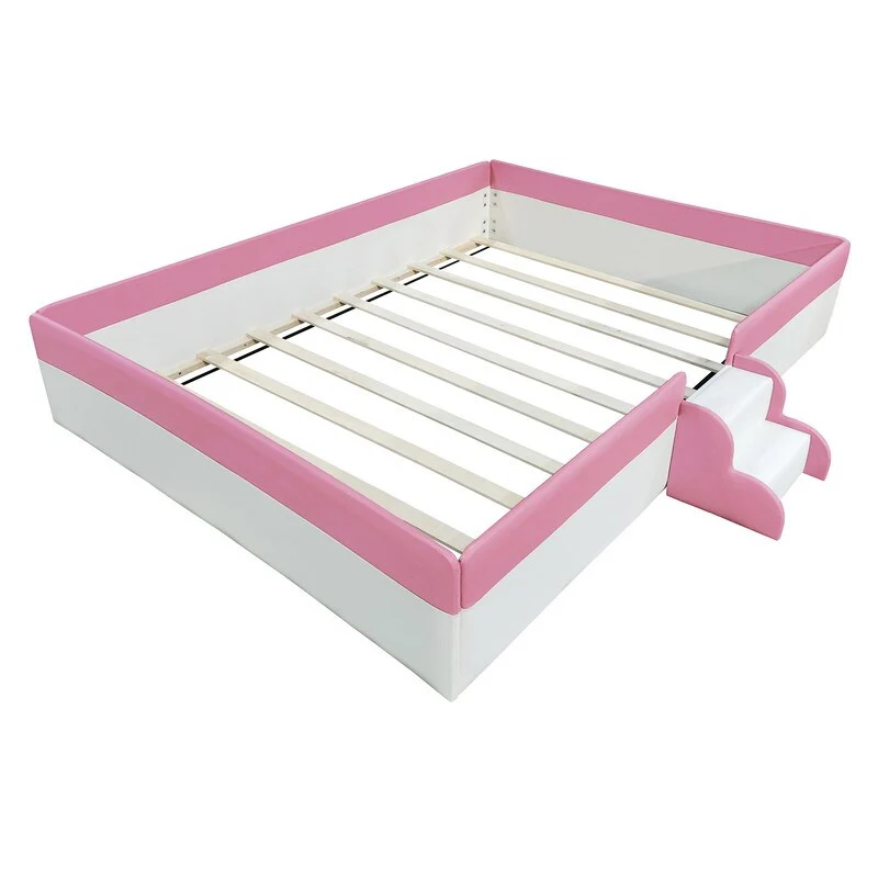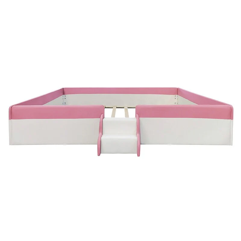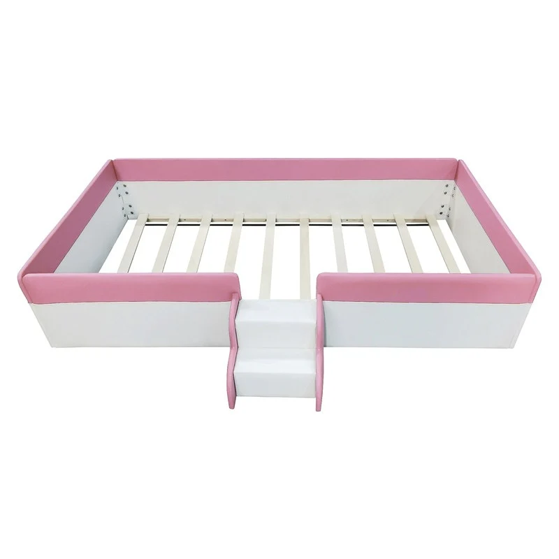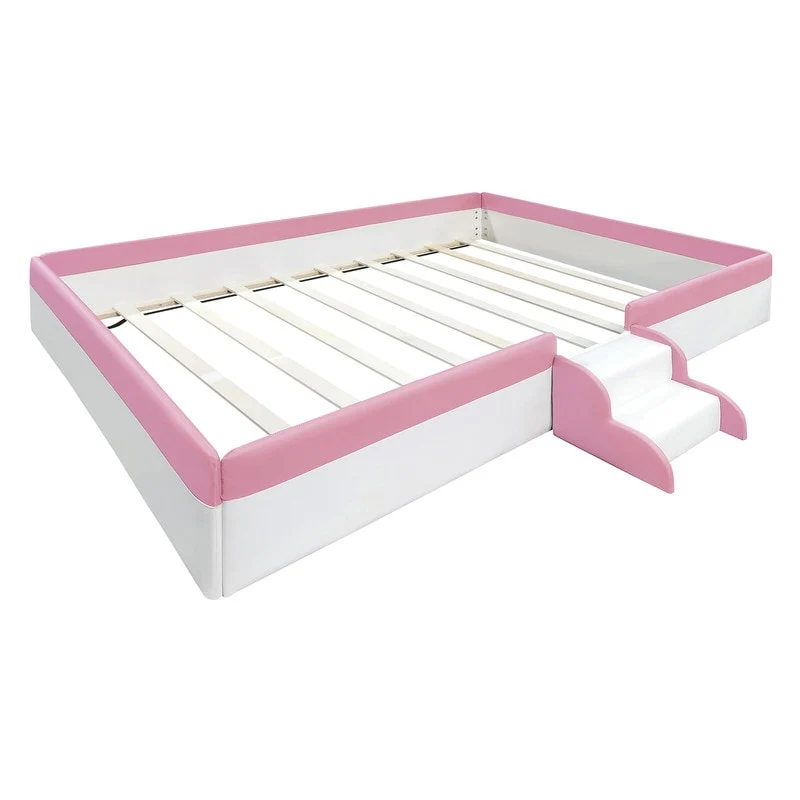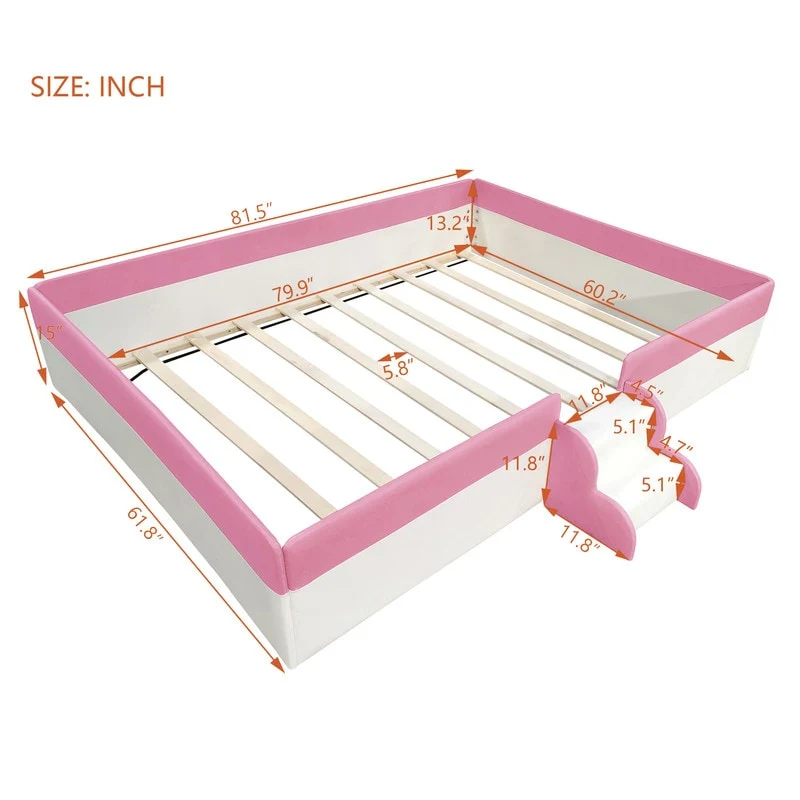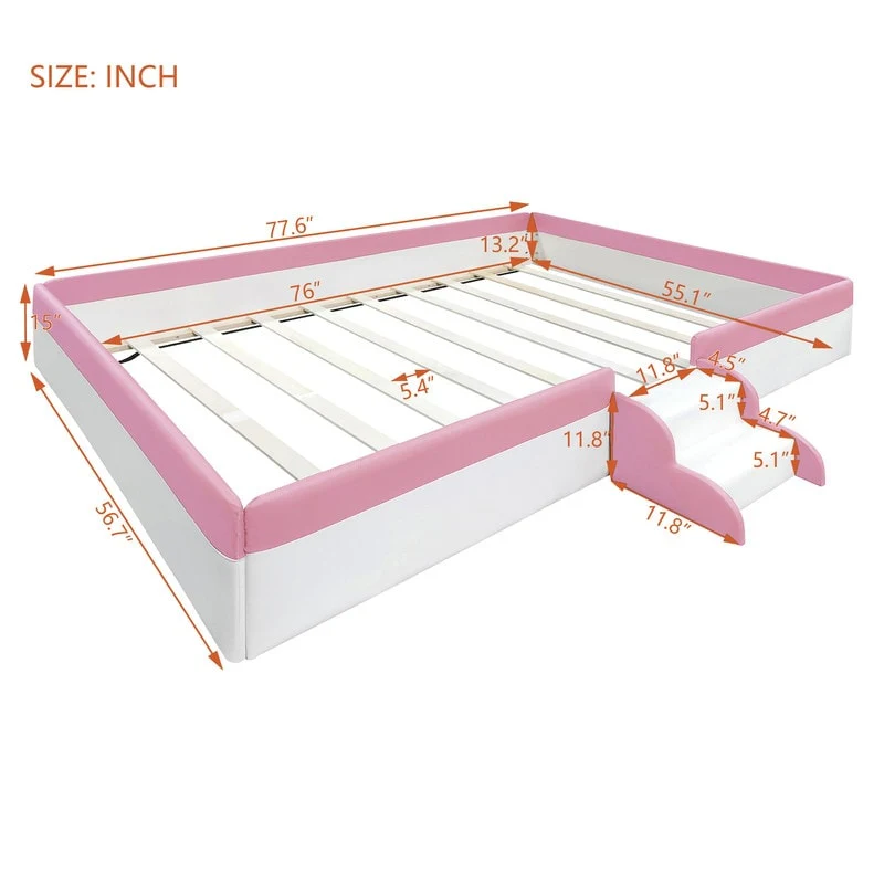 - 【Fun Design】This upholstered floor bed frame has a circle of fences. The side has a two-tier staircase., which increases the interest of the bed and creates a more safety sleeping space.