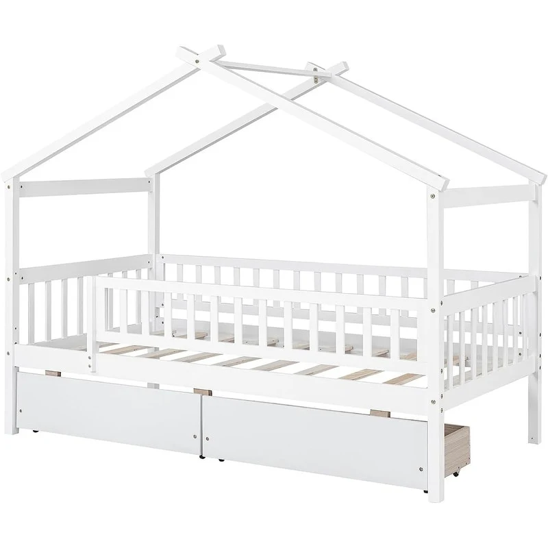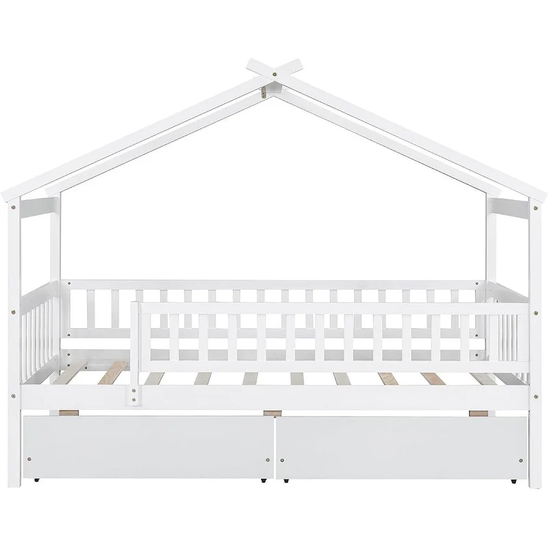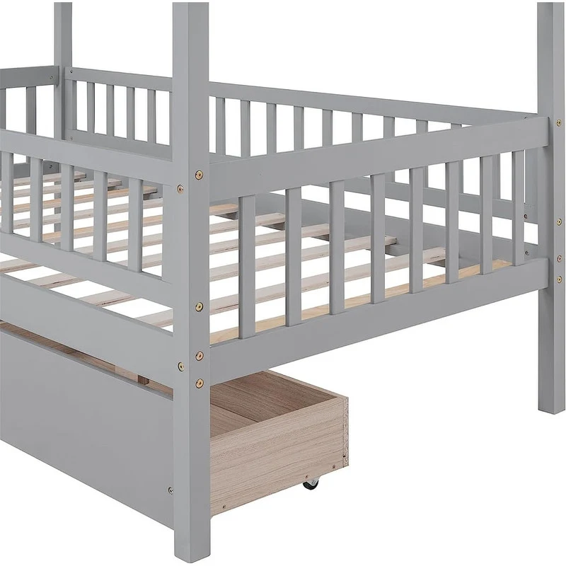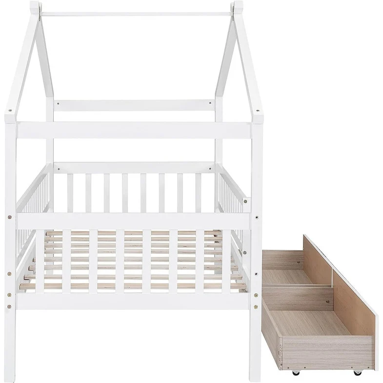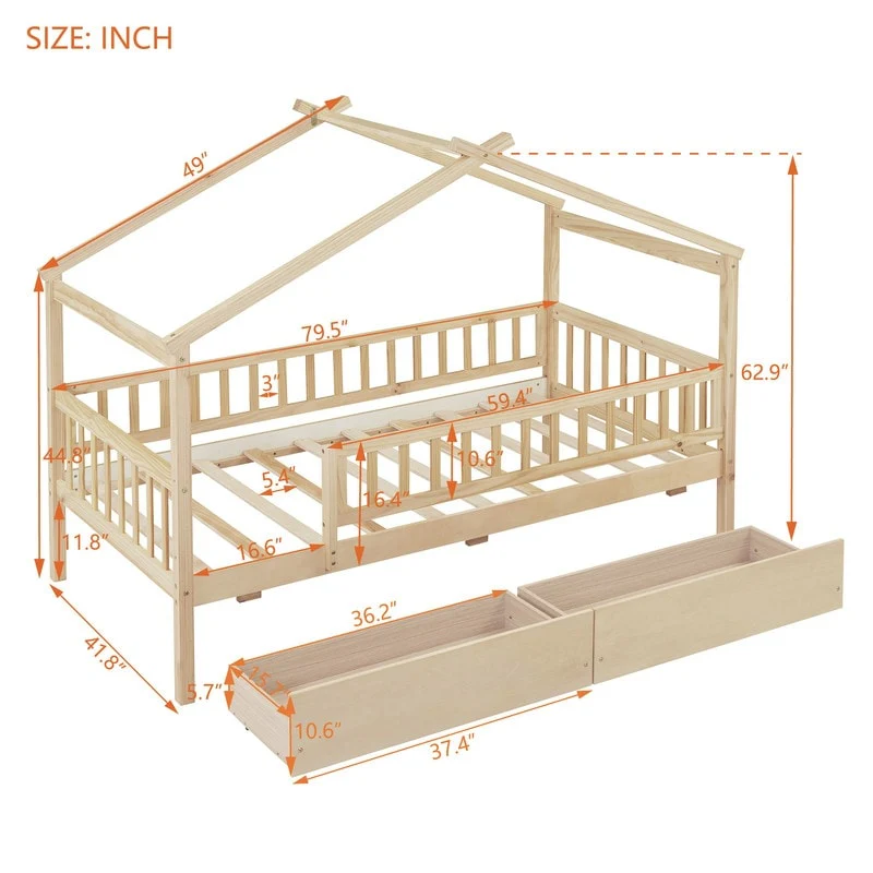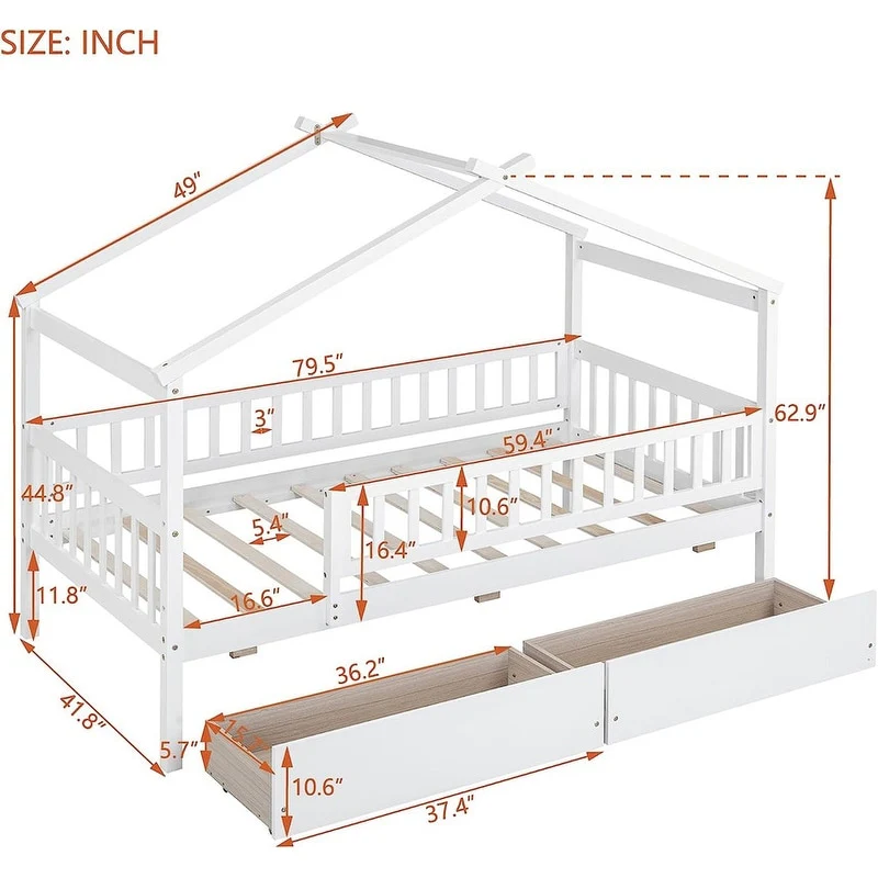 [Easy to Assemble House Bed Frame] - Kids Bed Frame Size:79.5'L x 41.8'W x 62.9'H. Our twin size house bed with drawers comes with 1 package included detailed instructions and numbered parts, so that it can be assembled step by step conveniently. If there is any part missing or damaged during shipping, please contact us, we will help you to solve the problem.