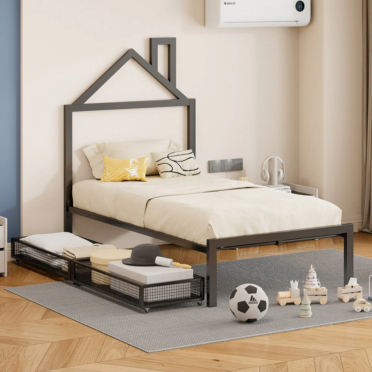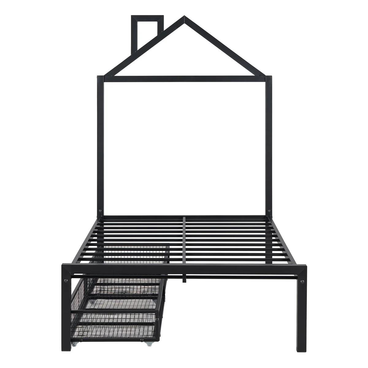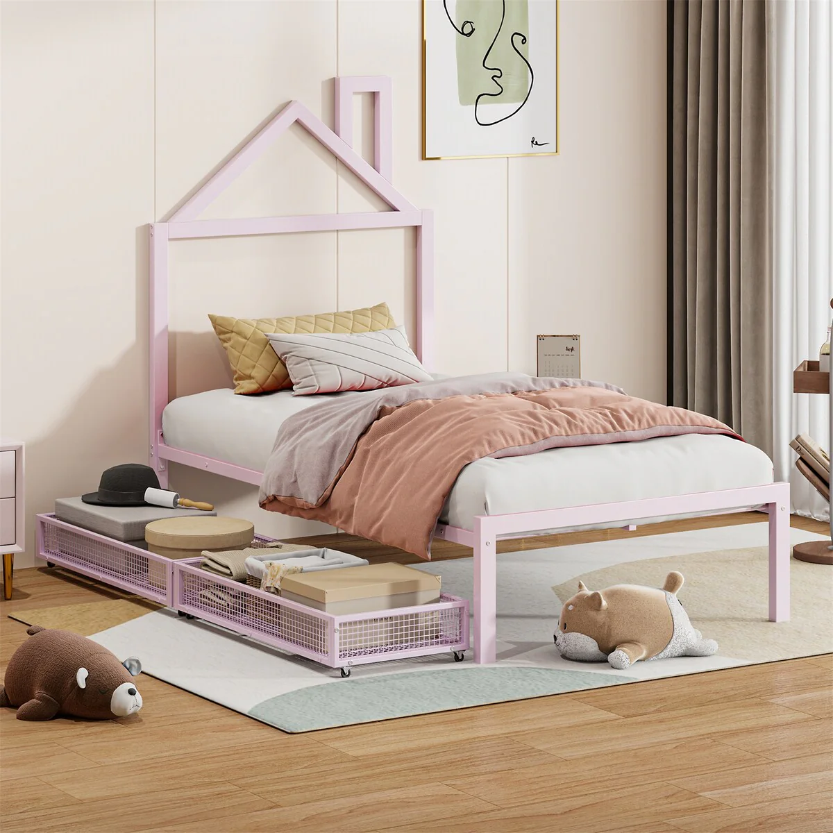 The design with house elements brings artistic atmosphere to your home. It meets any child's imagination of an eye-catching bed, and the 2 drawers under the bed can be slided in and out very smoothly, which takes full advantage of the space under the bed.Crafted from premium metal, this platform bed is built to last. The sturdy frame ensures stability and safety, making it a reliable choice for both adults and children.This metal platform will be a practical and full piece for your family.