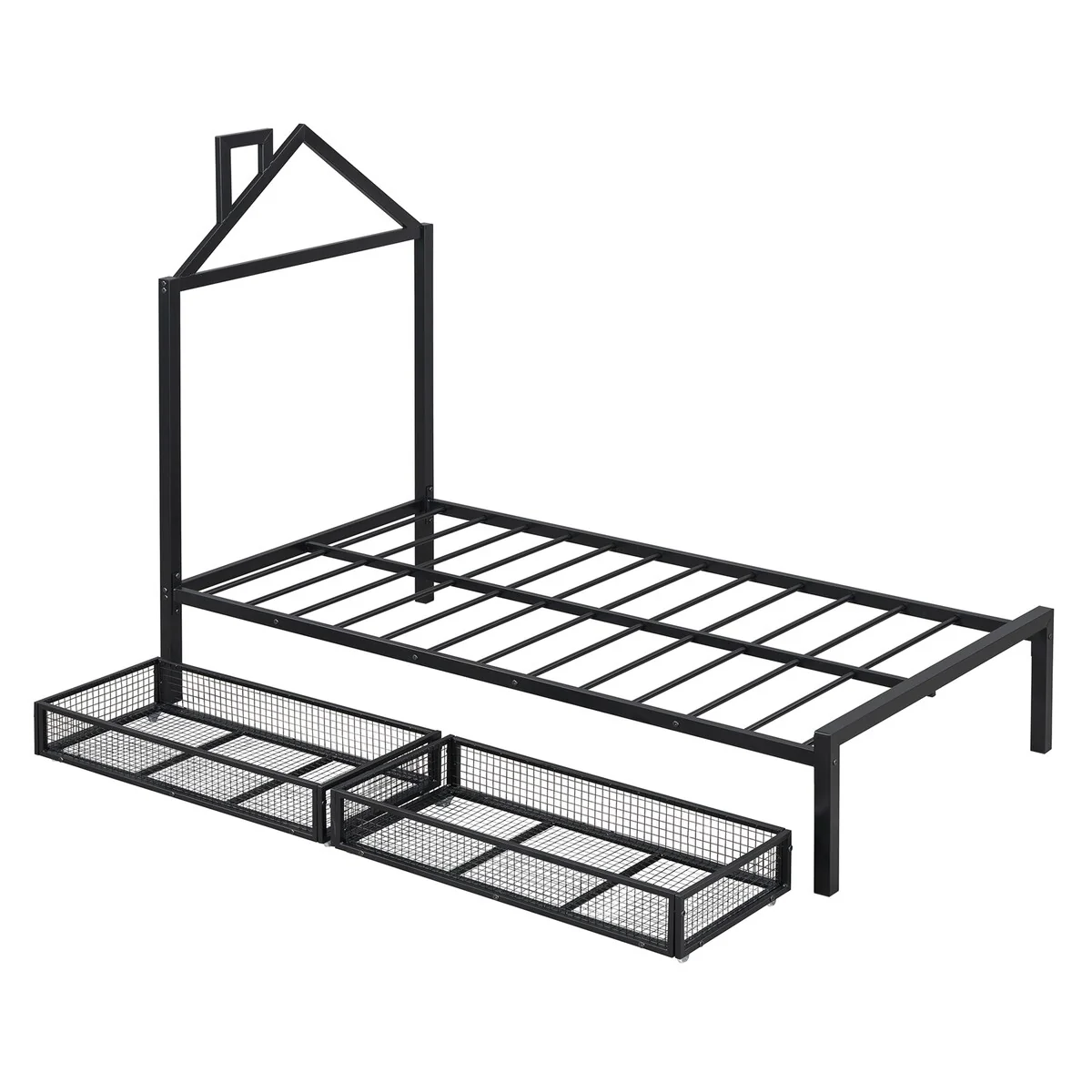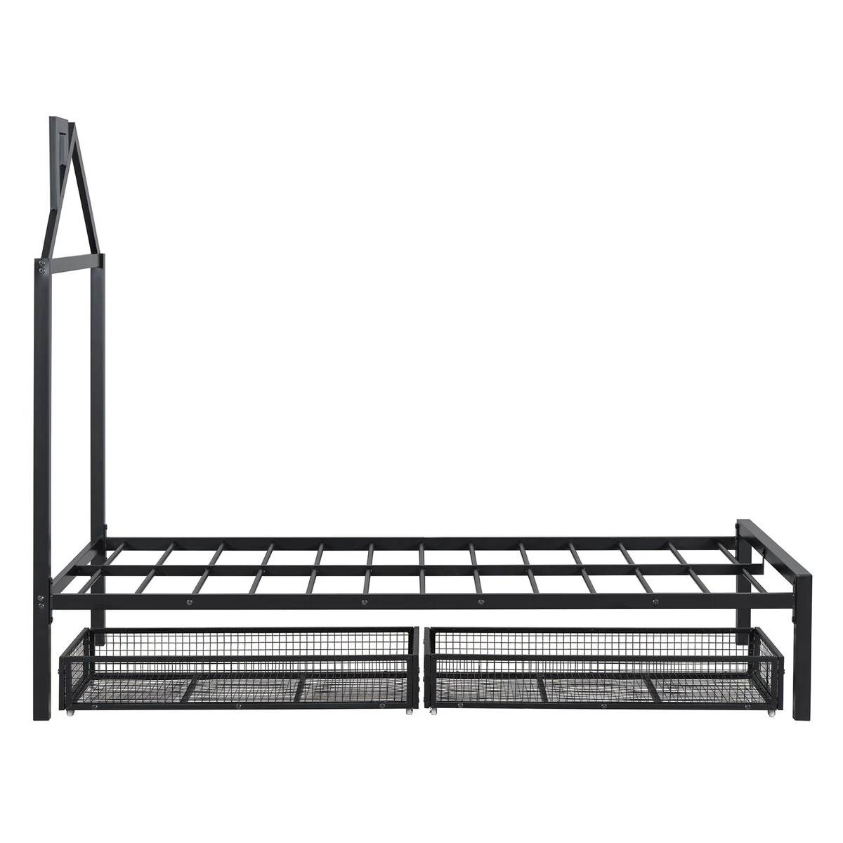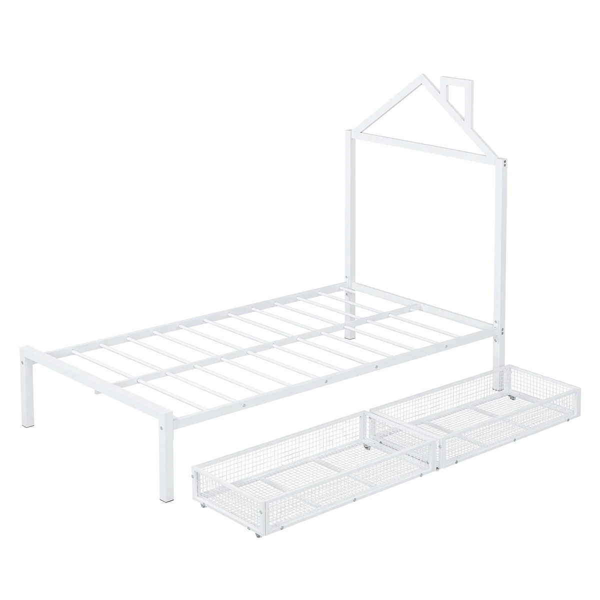 The design with house elements brings artistic atmosphere to your home. It meets any child's imagination of an eye-catching bed, and the 2 drawers under the bed can be slided in and out very smoothly, which takes full advantage of the space under the bed.Crafted from premium metal, this platform bed is built to last. The sturdy frame ensures stability and safety, making it a reliable choice for both adults and children.This metal platform will be a practical and full piece for your family.