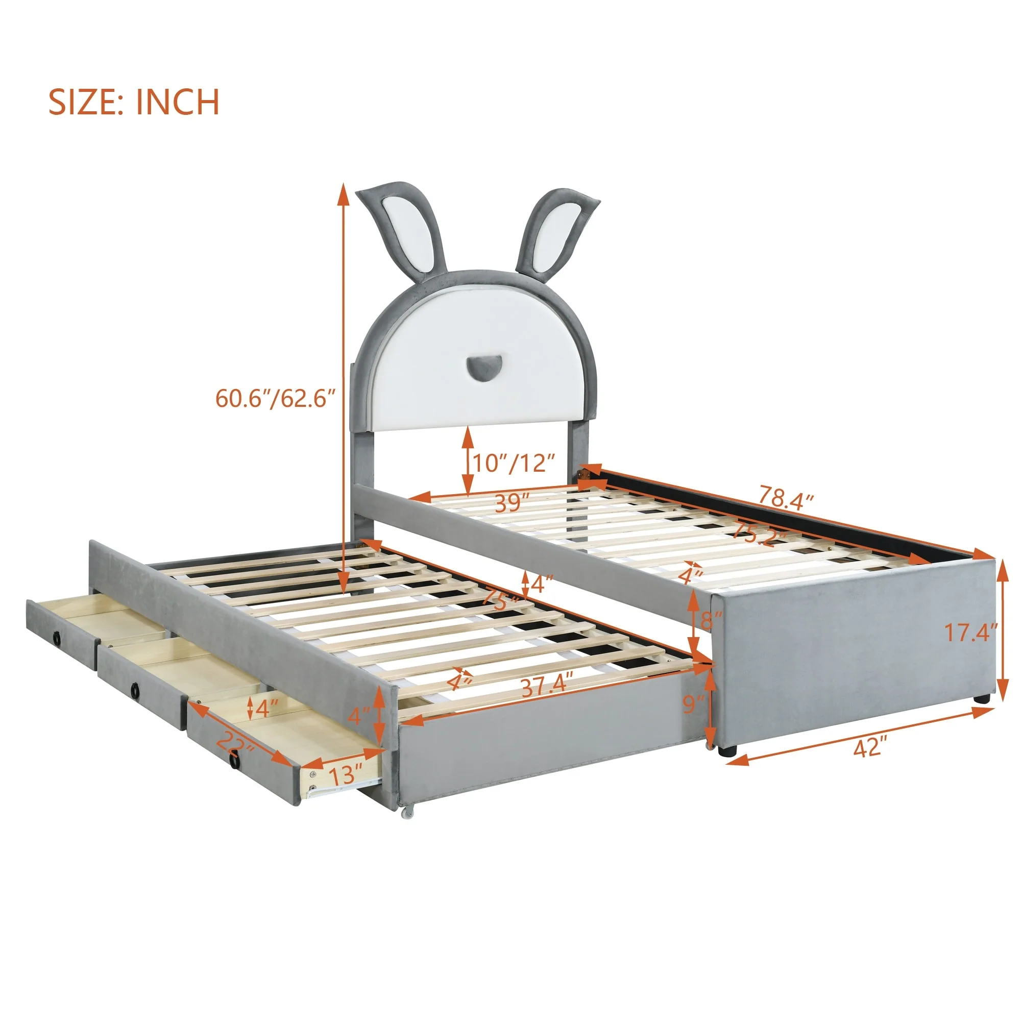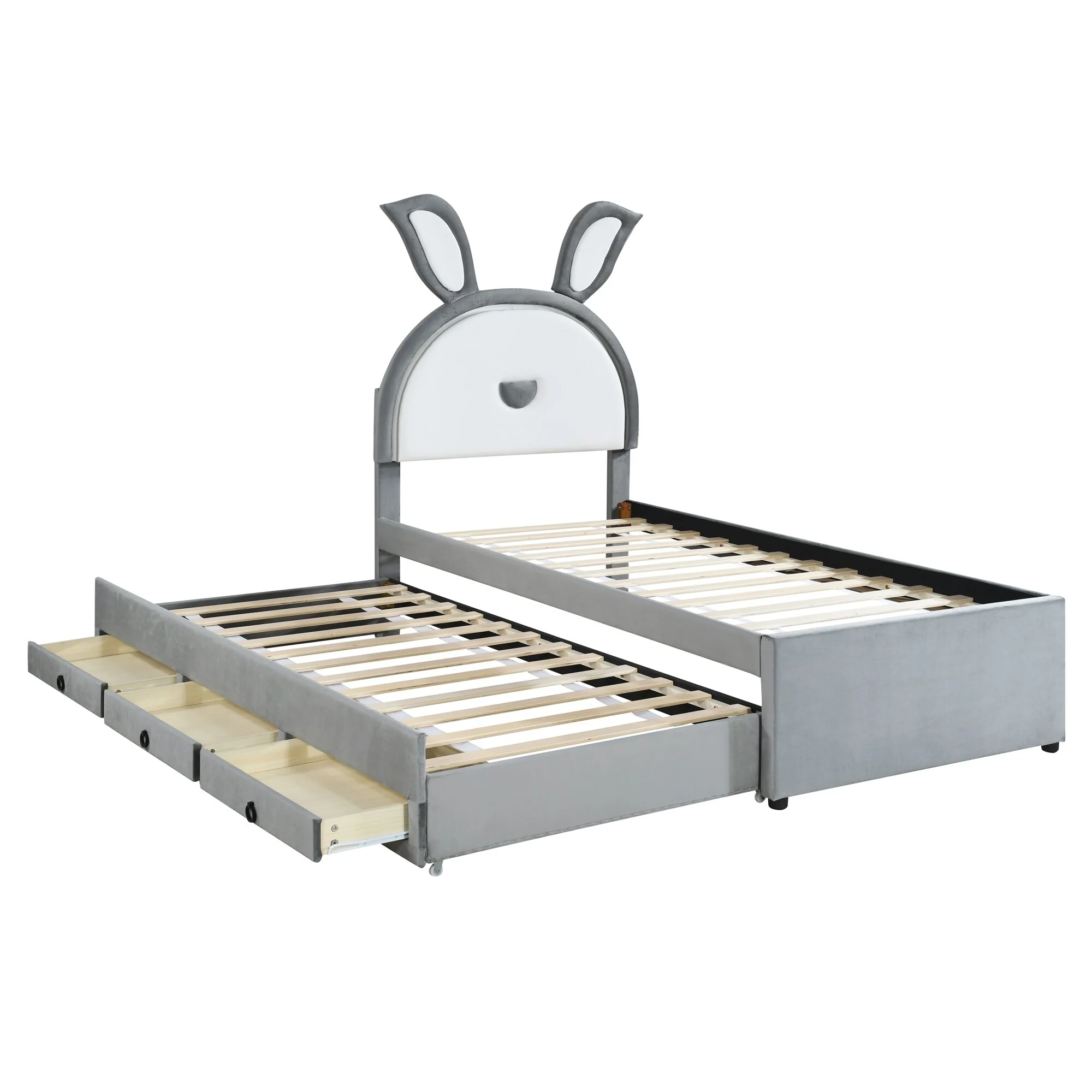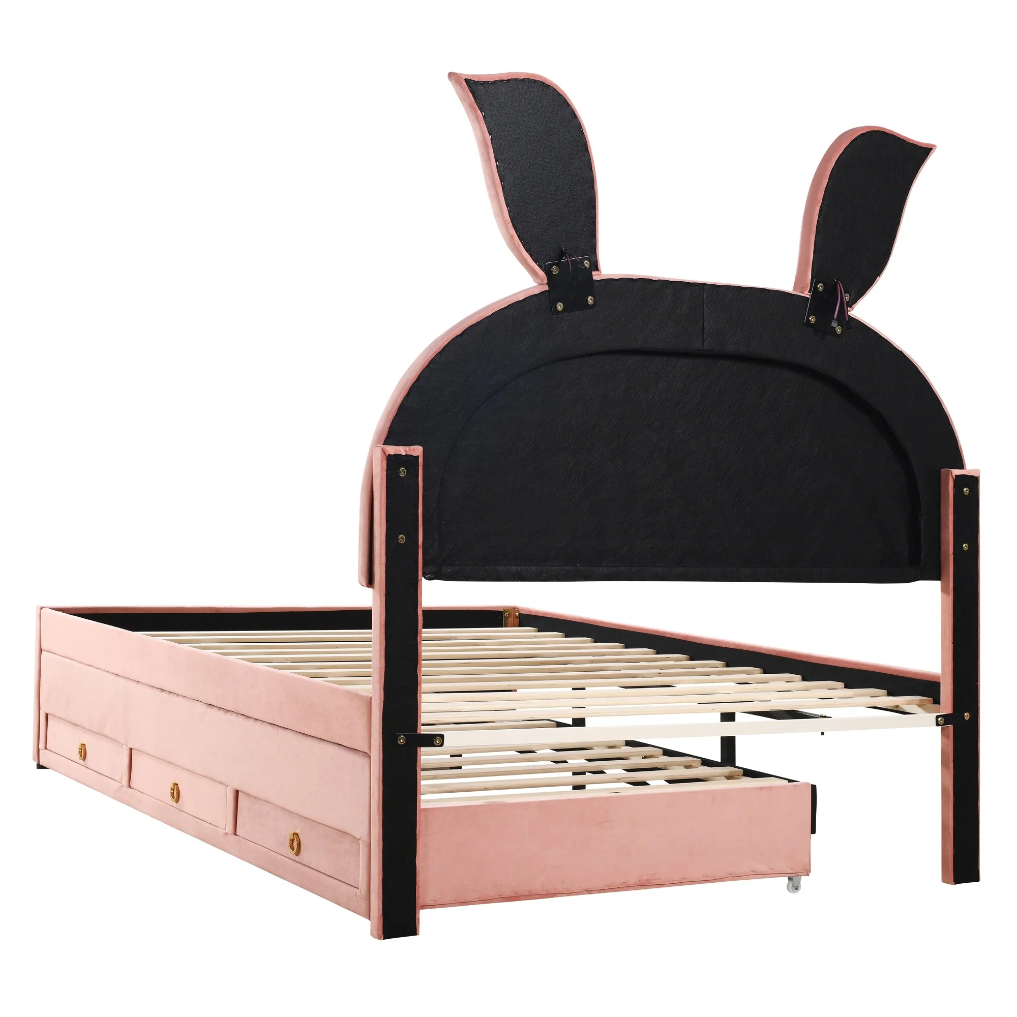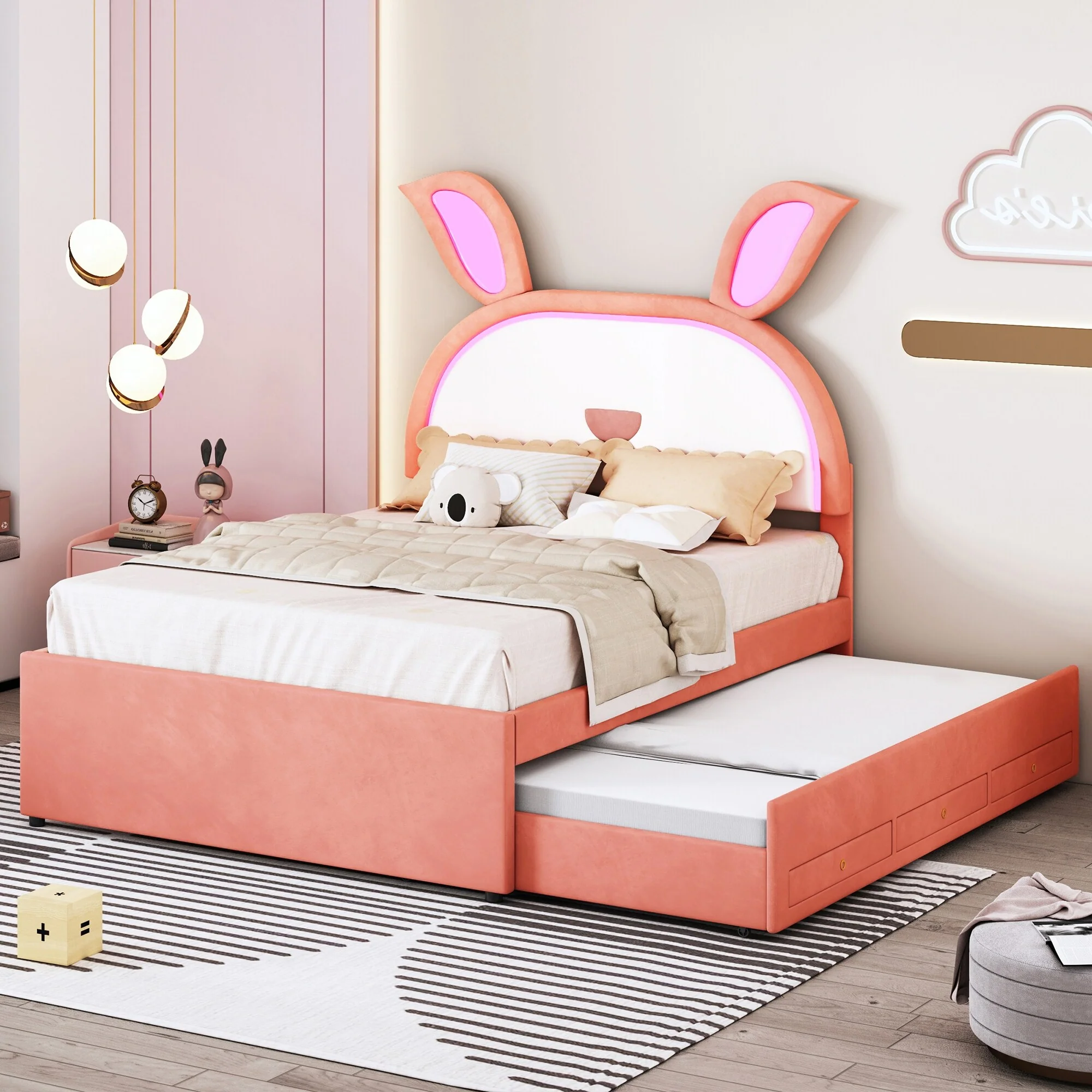 Transform your child's bedroom into a magical space with this Velvet Twin Platform Bed featuring a playful rabbit-shaped headboard and integrated trundle. The soft velvet upholstery adds a touch of luxury, while the LED-illuminated headboard brings a fun, whimsical element. With a trundle bed for extra sleeping space and three storage drawers for organizing toys, clothes, and bedding, this bed offers both functionality and style. The sturdy platform construction ensures long-lasting durability and support for a peaceful night's sleep.