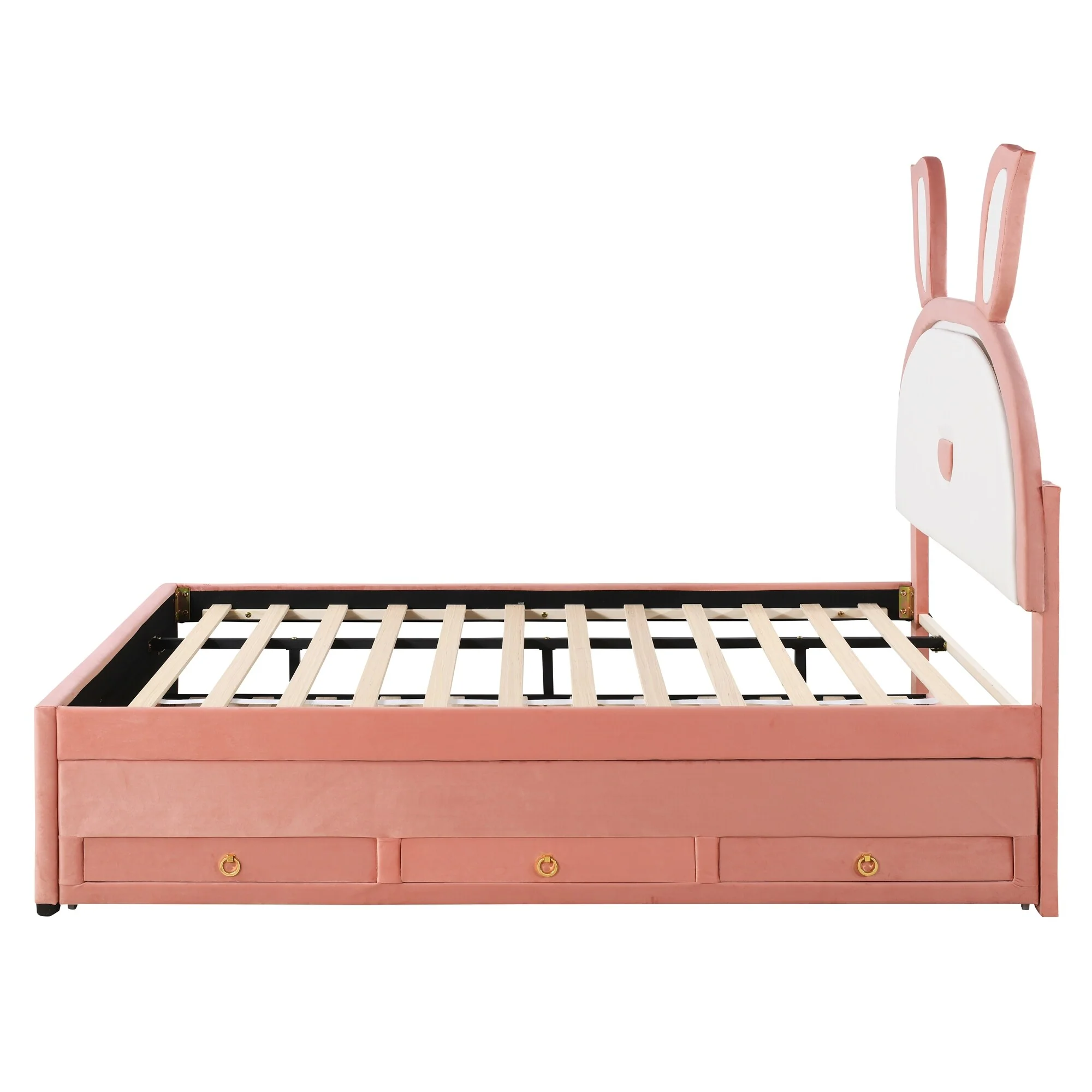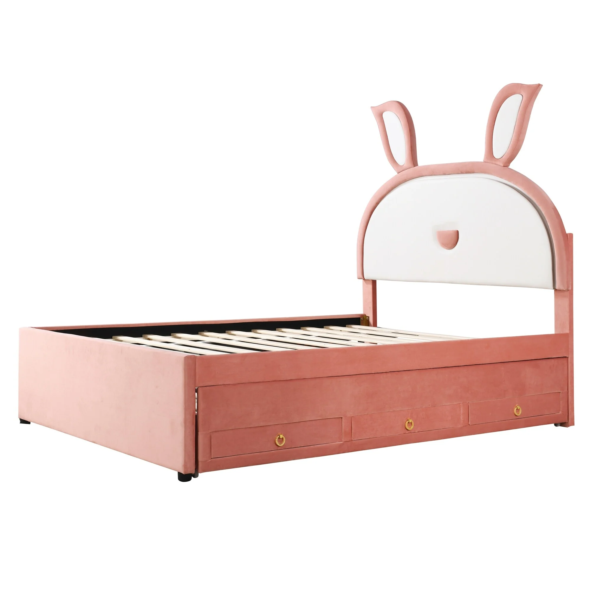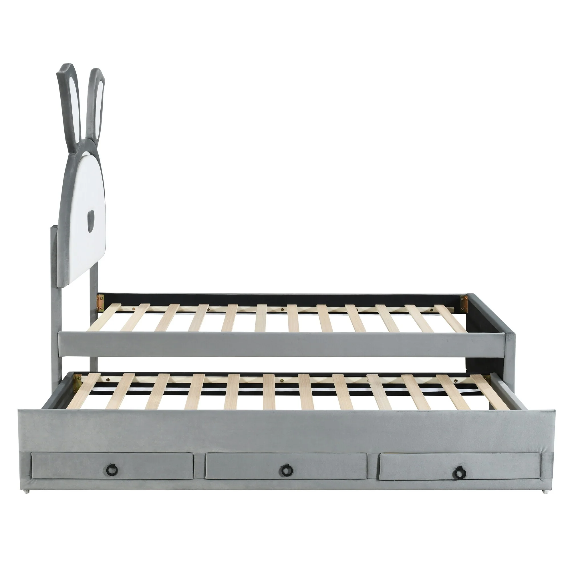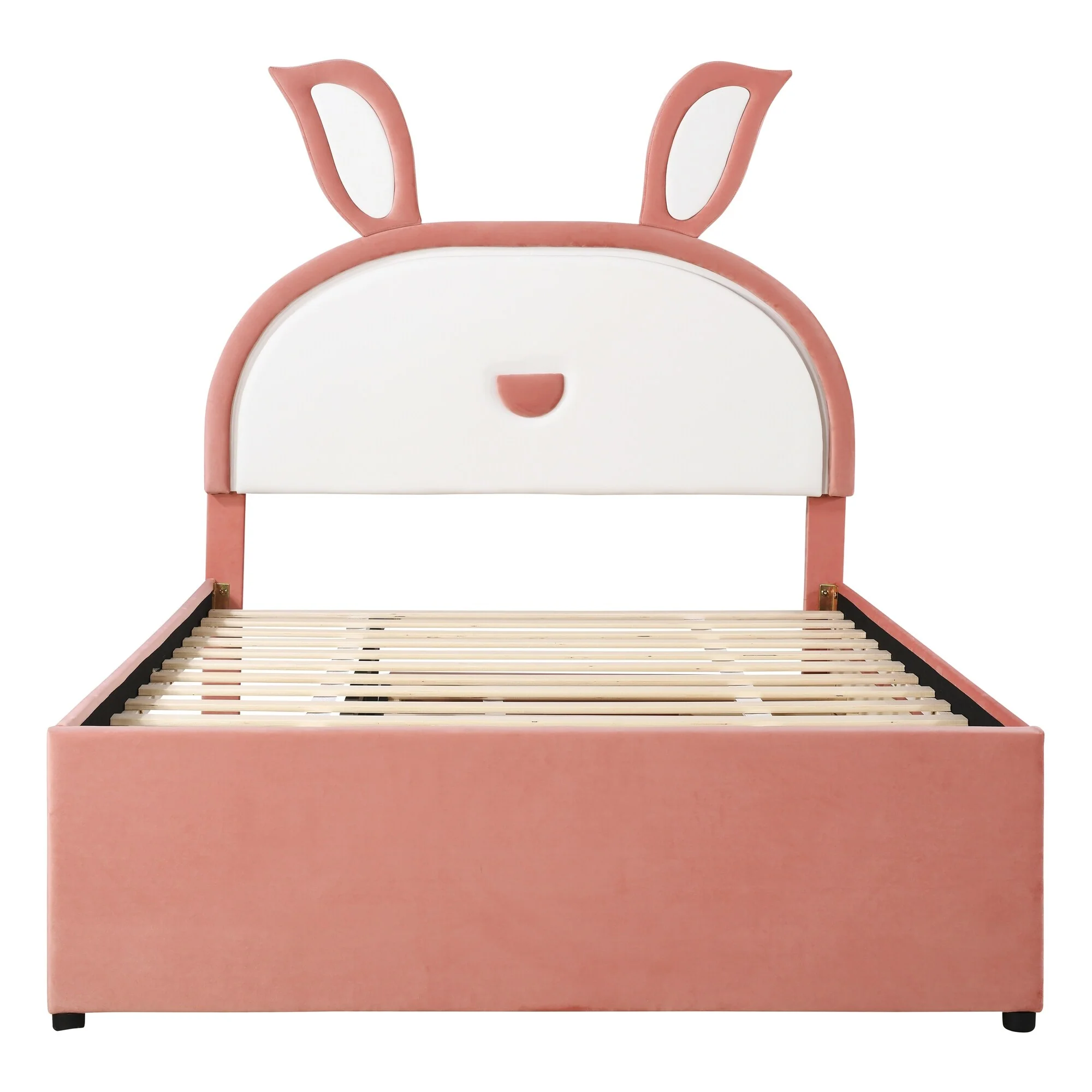Transform your child's bedroom into a magical space with this Velvet Twin Platform Bed featuring a playful rabbit-shaped headboard and integrated trundle. The soft velvet upholstery adds a touch of luxury, while the LED-illuminated headboard brings a fun, whimsical element. With a trundle bed for extra sleeping space and three storage drawers for organizing toys, clothes, and bedding, this bed offers both functionality and style. The sturdy platform construction ensures long-lasting durability and support for a peaceful night's sleep.