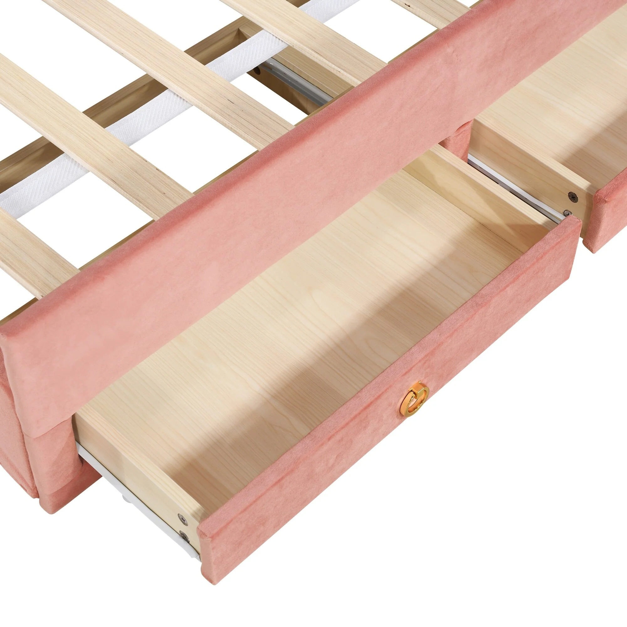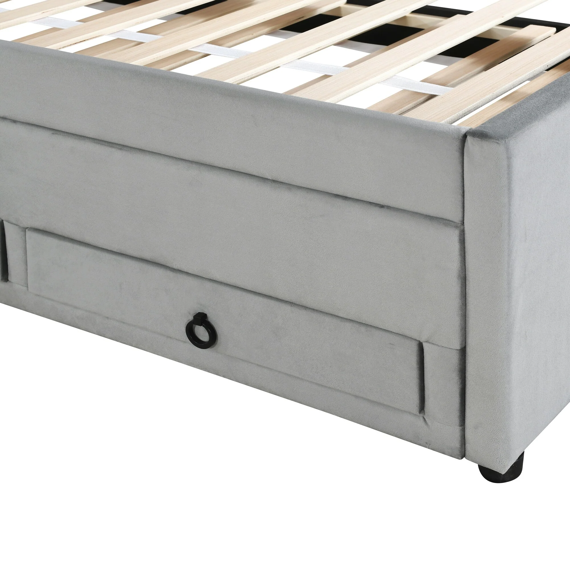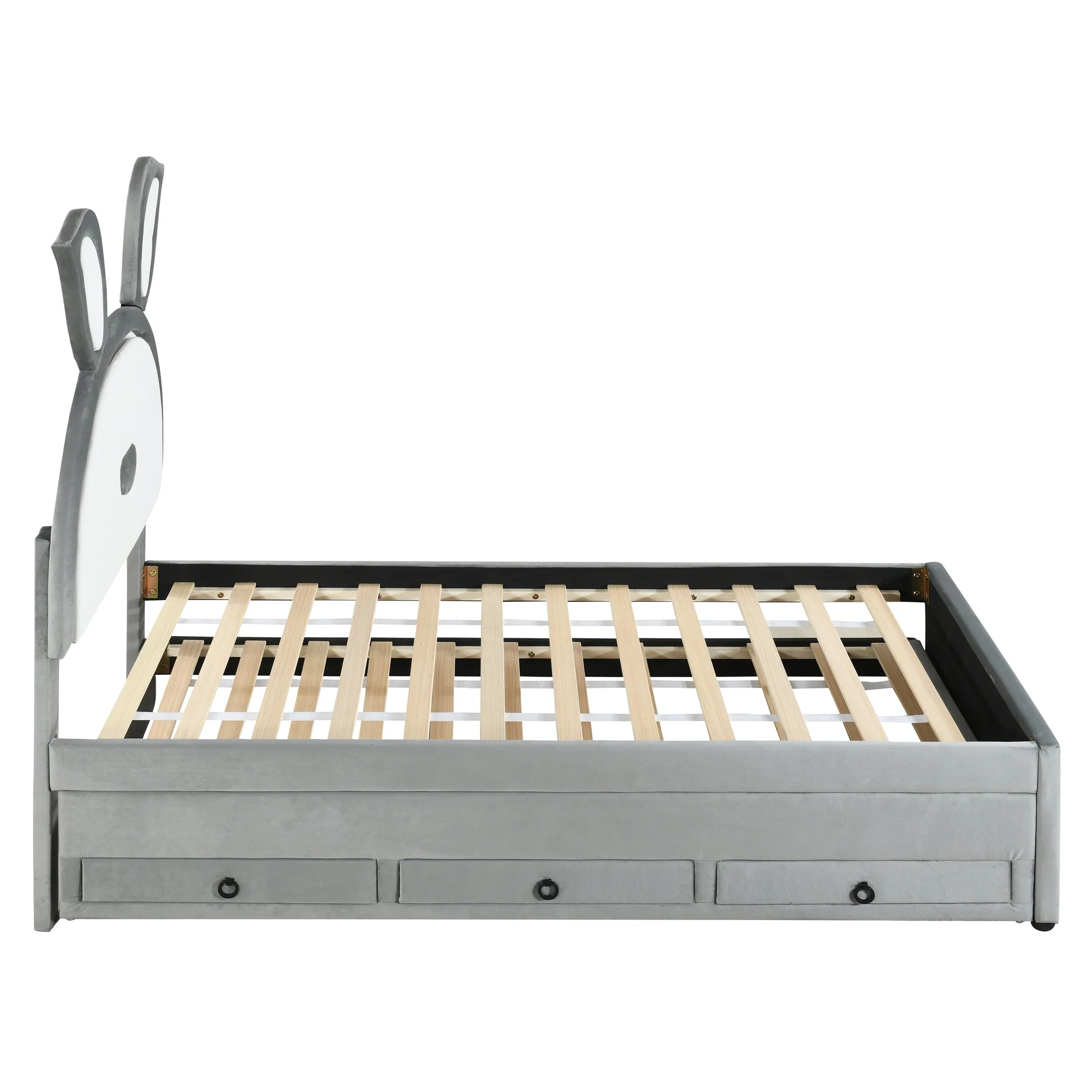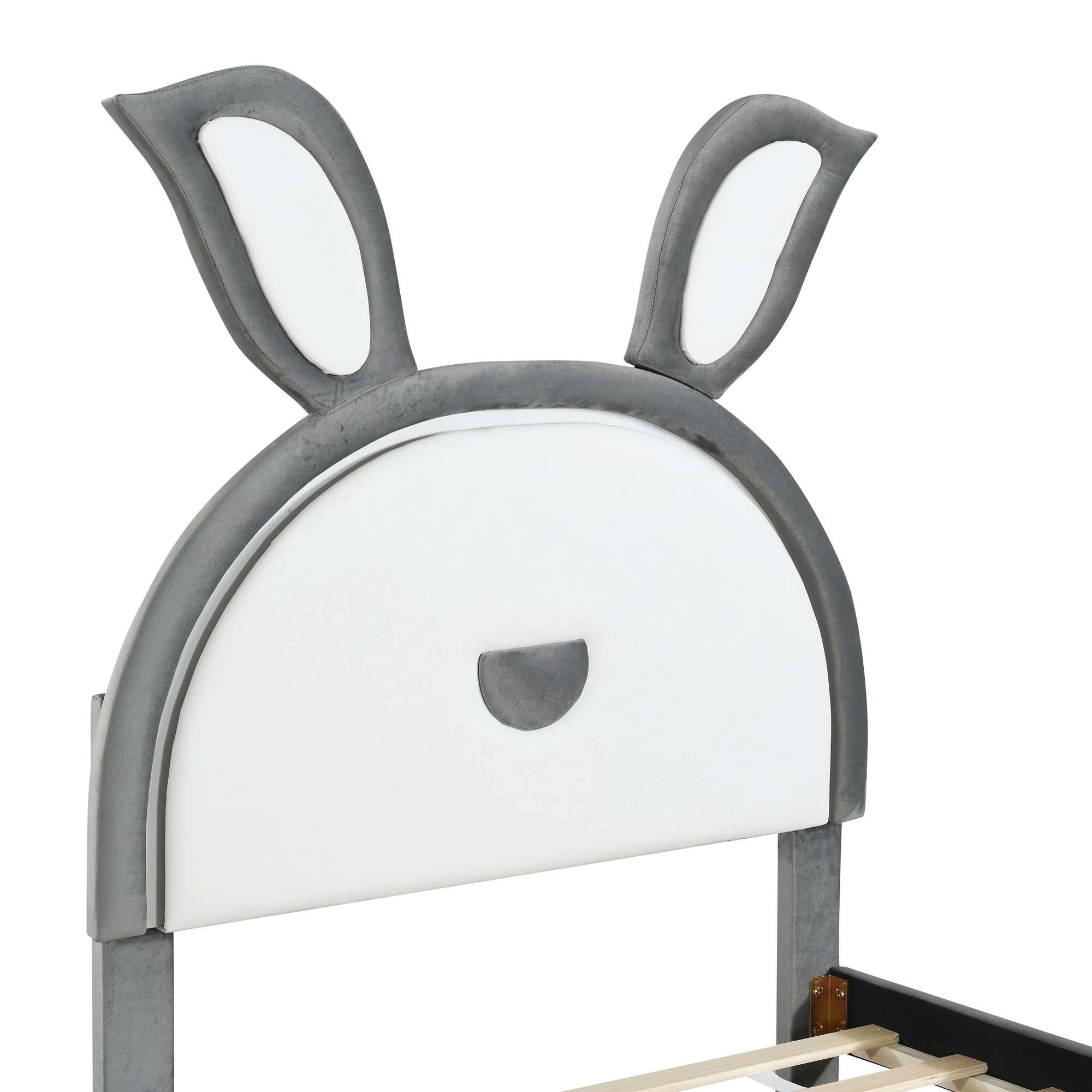 Transform your child's bedroom into a magical space with this Velvet Twin Platform Bed featuring a playful rabbit-shaped headboard and integrated trundle. The soft velvet upholstery adds a touch of luxury, while the LED-illuminated headboard brings a fun, whimsical element. With a trundle bed for extra sleeping space and three storage drawers for organizing toys, clothes, and bedding, this bed offers both functionality and style. The sturdy platform construction ensures long-lasting durability and support for a peaceful night's sleep.