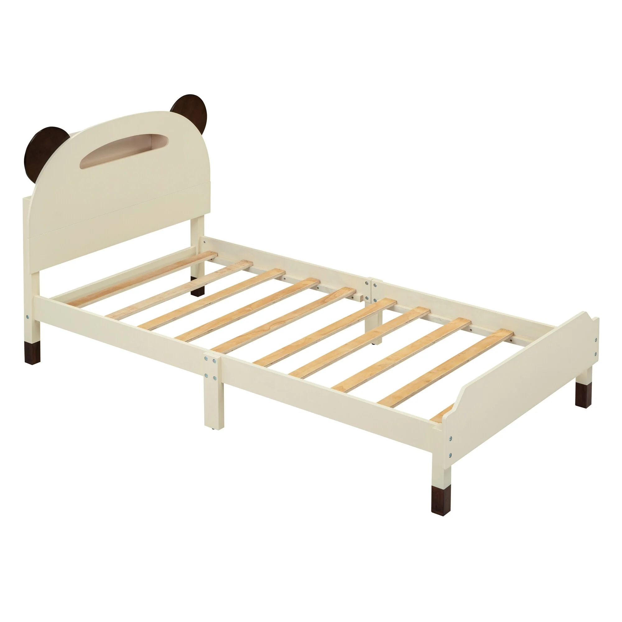 Bring both fun and functionality to your child's bedroom with this twin-size platform bed featuring a unique bear-shaped headboard. Designed to create a cozy and playful atmosphere, this bed also offers a motion-activated nightlight that provides extra comfort and safety during the night. Made from solid pine wood, MDF, and plywood, the bed is durable and lightweight, ensuring it lasts for years. Its sturdy construction, paired with the included slat system, means you won't need a box spring. With a load capacity of up to 300 lbs, this bed provides both style and reliability for your child's space.