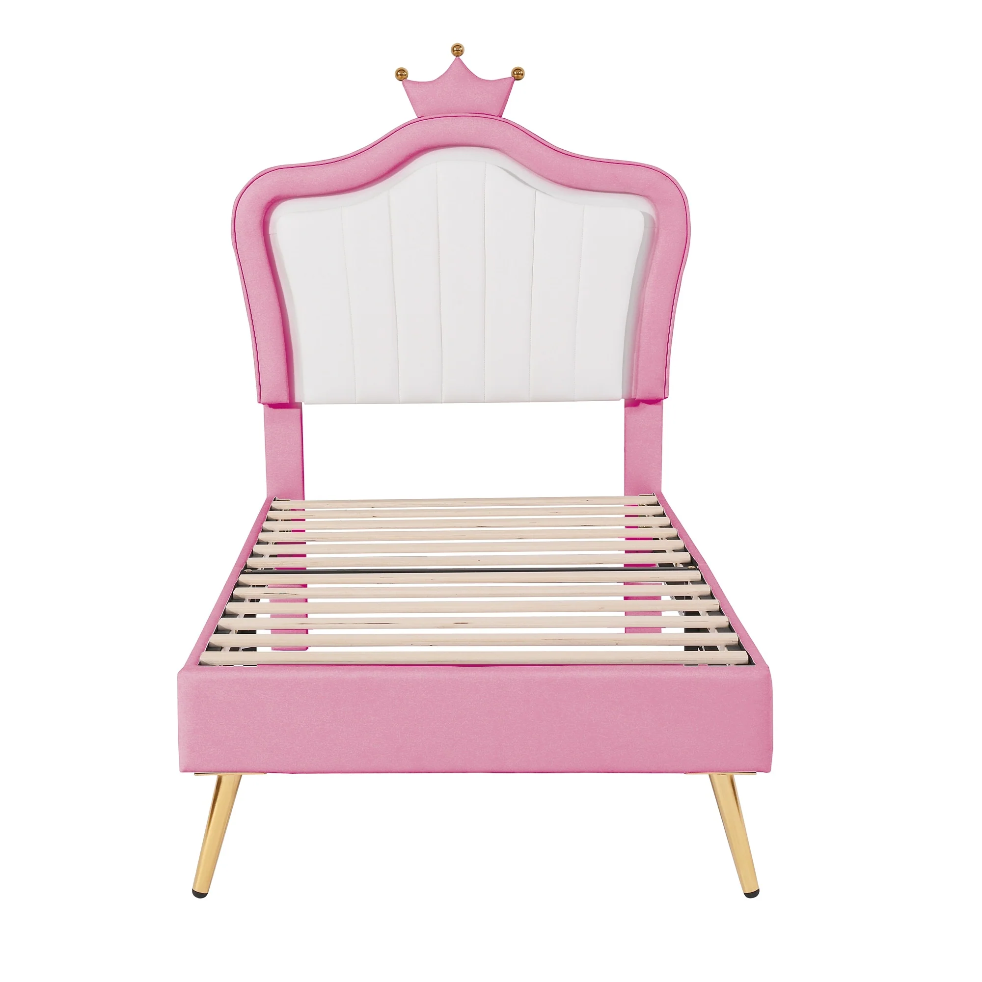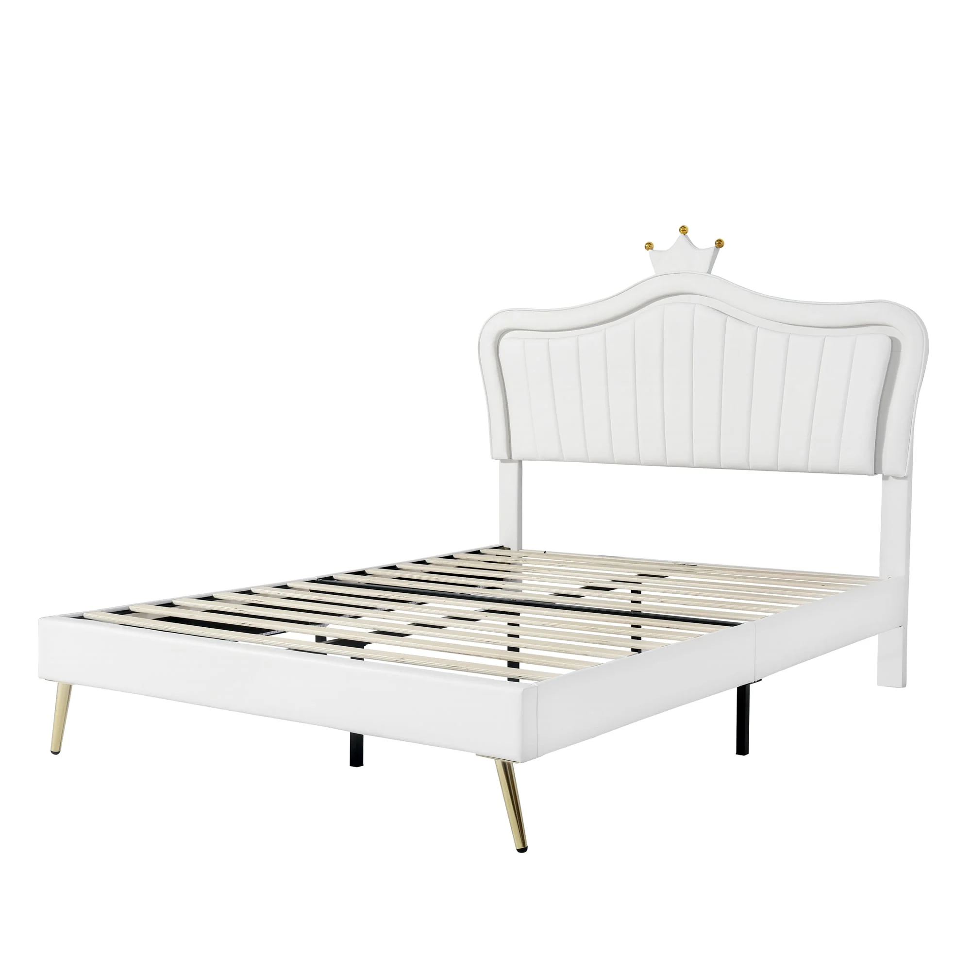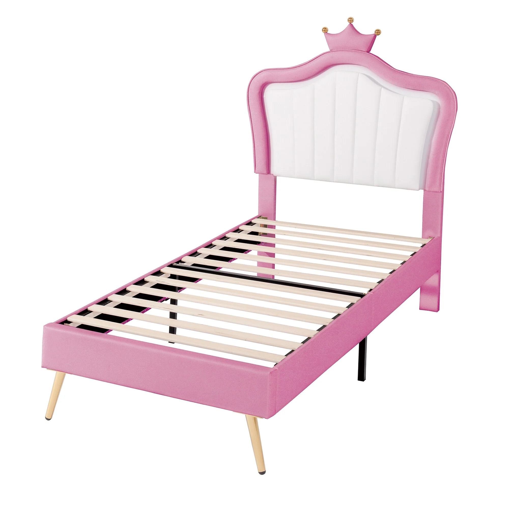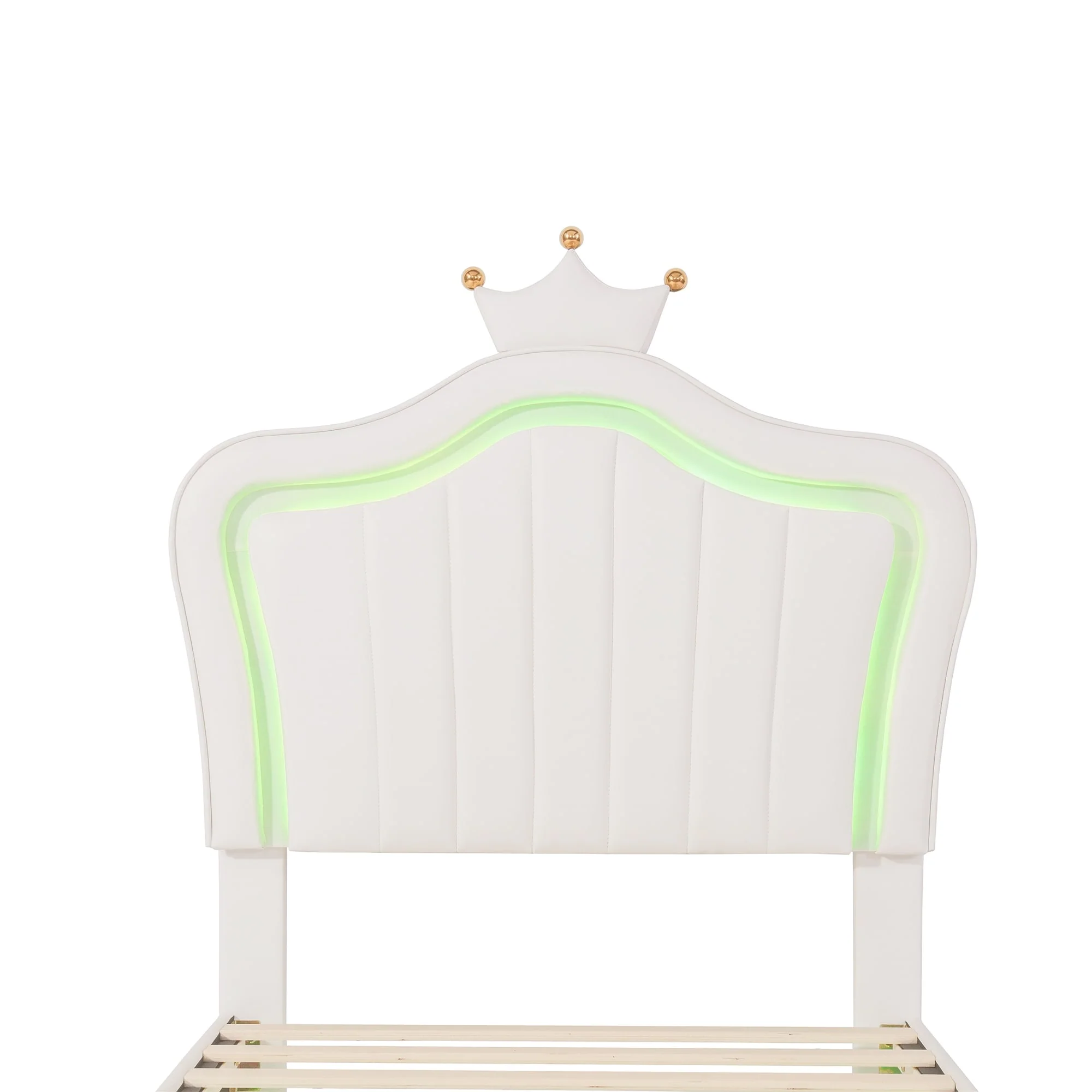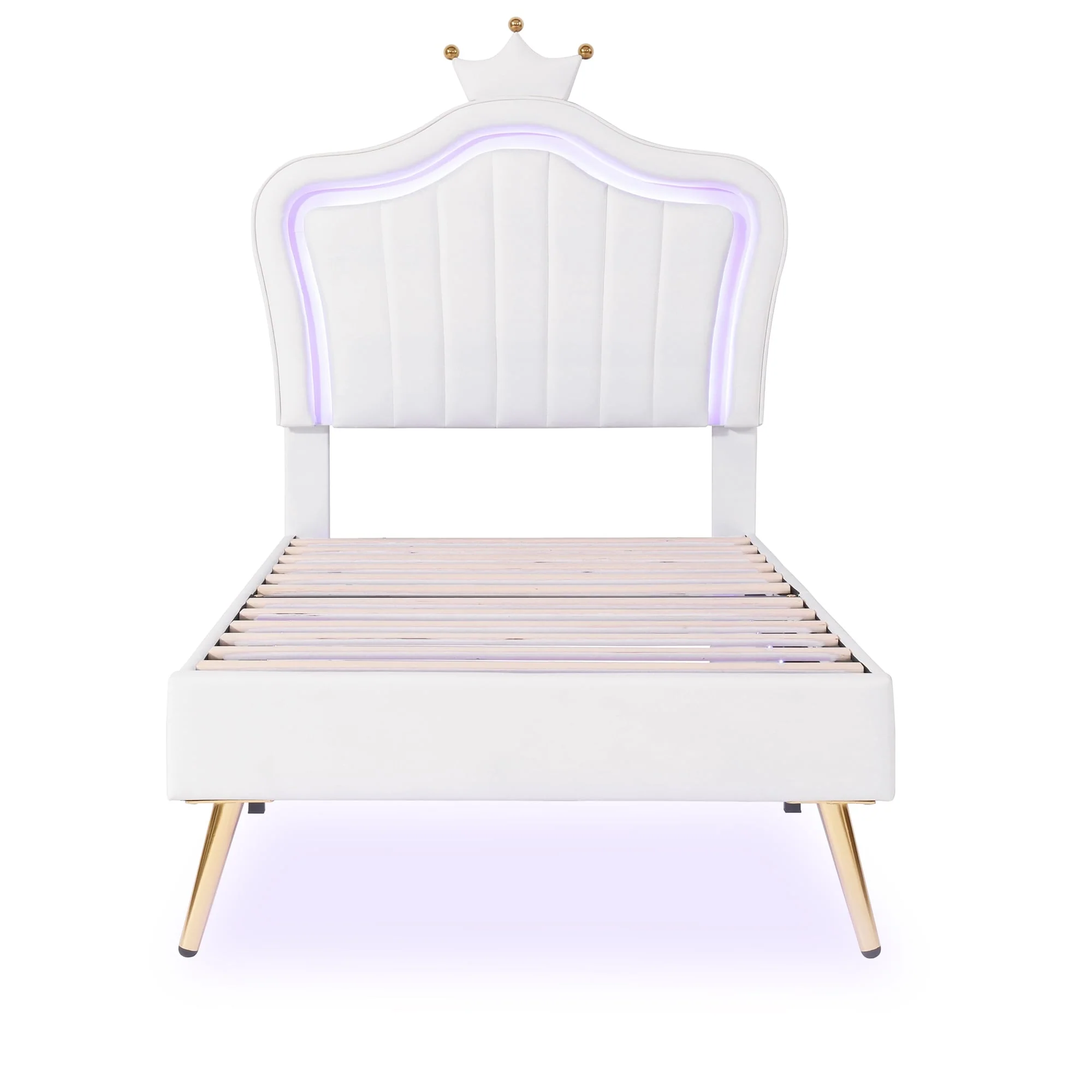 [Crown Headboard Design] The headboard of this princess platform bed is crown shape. It is so cute that you will love it.It masterfully blends with all styles of home decoration, and helps to complete and enhance the look of any bedroom.The height of the head of the bed can be adjusted in 2 levels, 52.8'-55.2'.[LED Bed Frame] The LED lights can be controlled by remote control with a variety of colors and light modes to choose from.Can easily add a romantic vibe to your bedroom.[Solid & Sturdy] The bed frame is made of solid MDF and Plywood, come with metal feets,providing a dense and strong support for up to 350lbs. The construction ensures both a lifetime of use, and a sturdy bed frame with a head which won't wobble.[No-Noise Design] Velcro slats design, simplify the installation steps of the slats and offer stability between slats and foundation to eliminate the friction noise from the root cause.So there is no need to worry about squeaking when you roll over at midnight.[Dimensions] Overall Dimension: 77.2 x 42.9 x 52.8-55.2 inches (L x W x H) . Suitable for mattress Twin size(Mattress is not included) Weight capacity: 350lbs.
