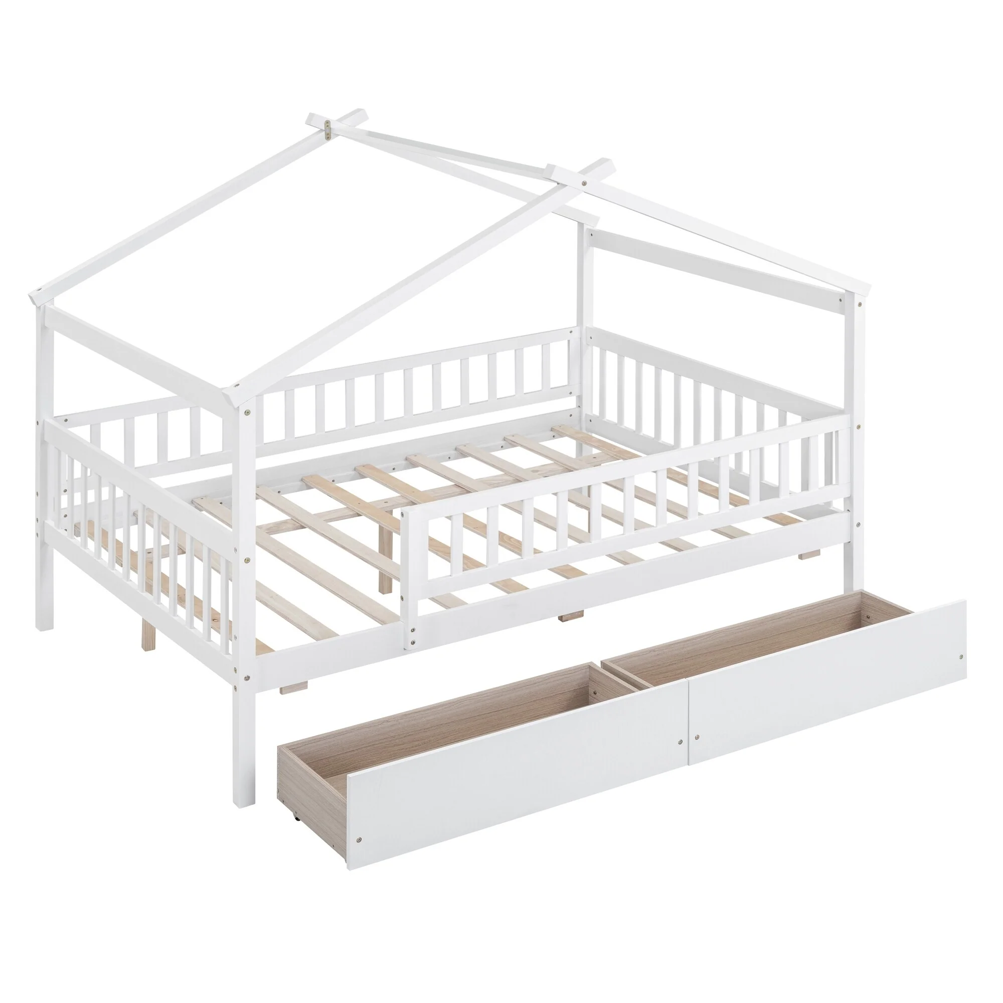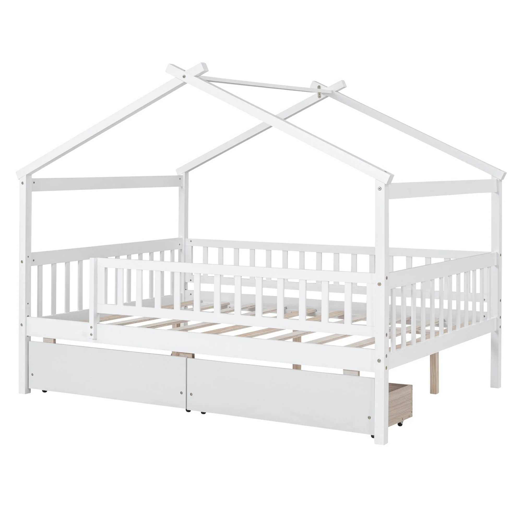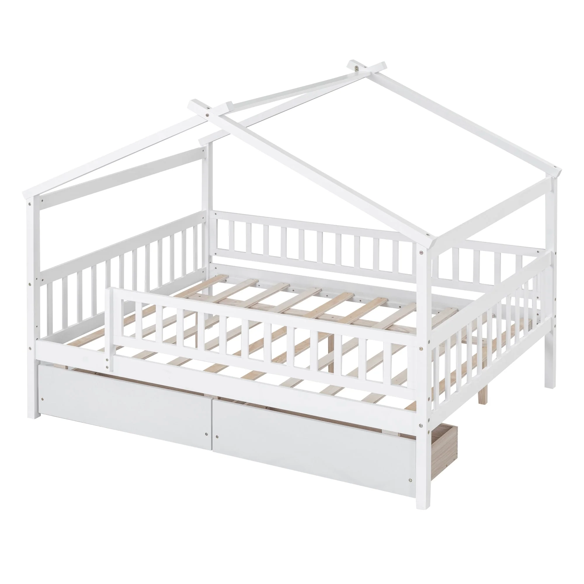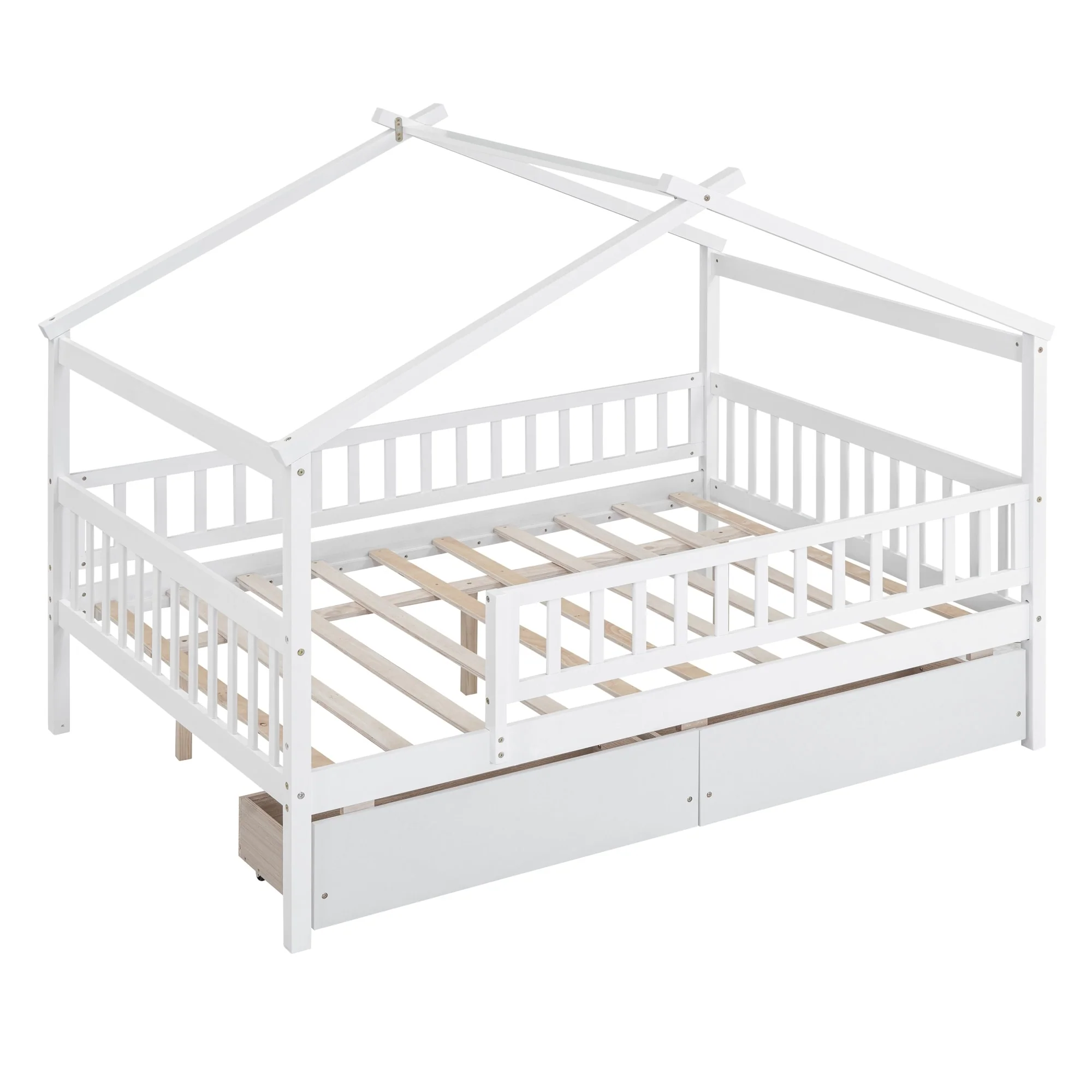 This Full Size Wooden House Bed brings creativity and function to your child's bedroom. Designed in a charming house shape with a roof and two headboards, it provides a cozy, playful environment that encourages imagination and play. The solid pine wood and MDF construction ensures durability, while the two spacious storage drawers beneath the bed offer ample storage for clothes, toys, and other essentials. The bed features a sturdy slat system that eliminates the need for a box spring, making it a practical and stylish addition to any child's room. The low height also makes it easy for young children to climb in and out of bed safely.