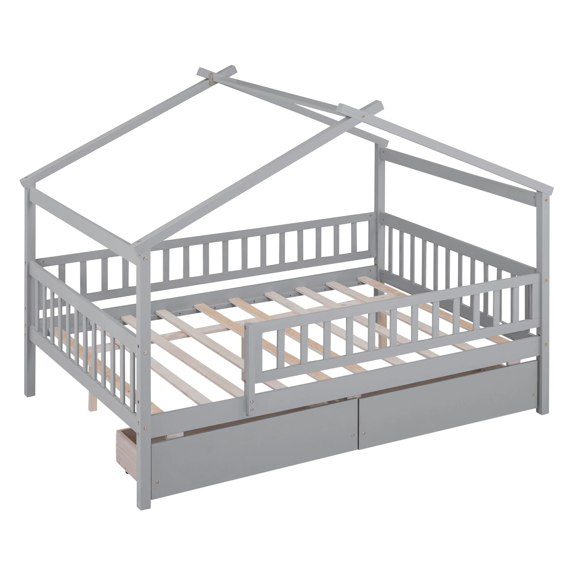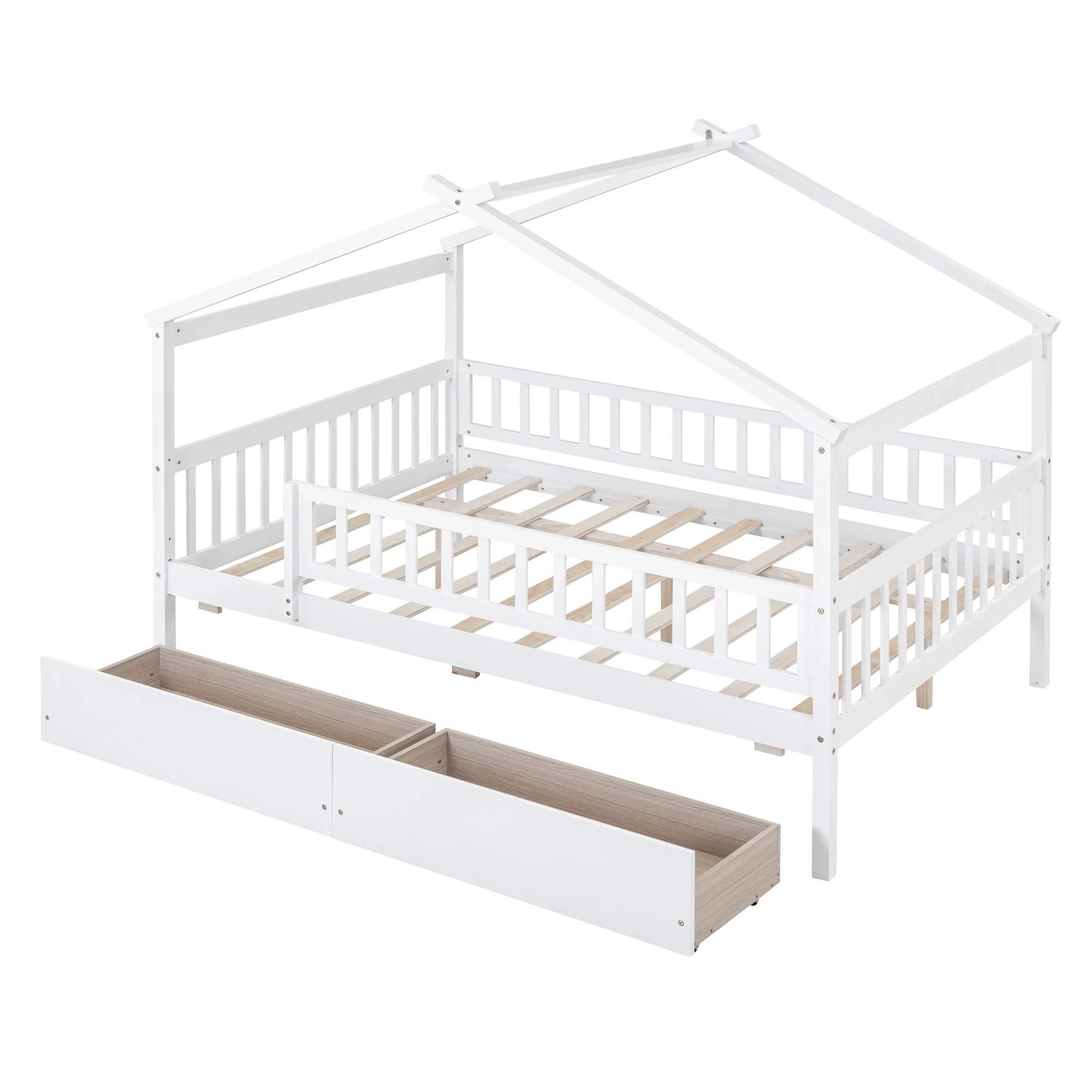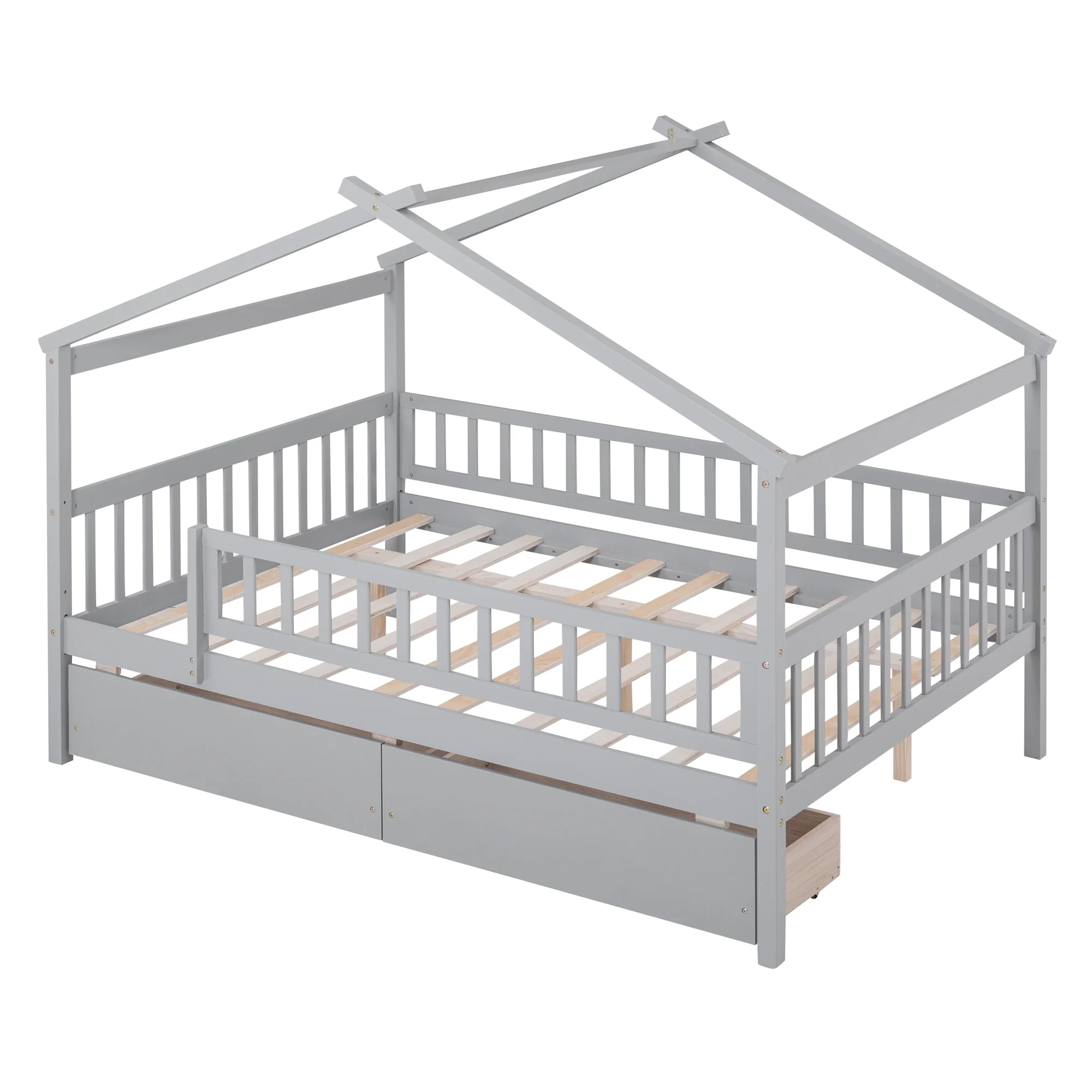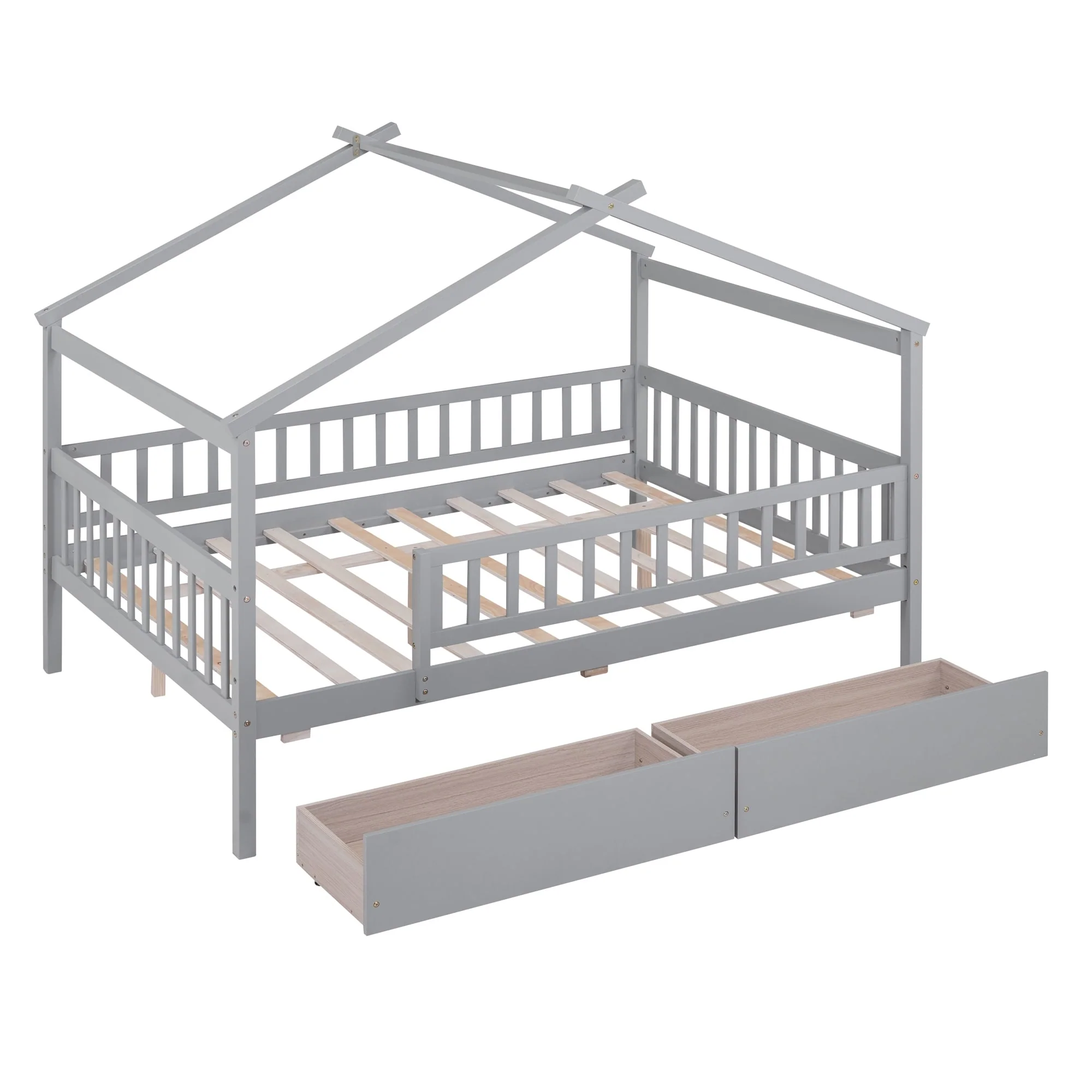 This Full Size Wooden House Bed brings creativity and function to your child's bedroom. Designed in a charming house shape with a roof and two headboards, it provides a cozy, playful environment that encourages imagination and play. The solid pine wood and MDF construction ensures durability, while the two spacious storage drawers beneath the bed offer ample storage for clothes, toys, and other essentials. The bed features a sturdy slat system that eliminates the need for a box spring, making it a practical and stylish addition to any child's room. The low height also makes it easy for young children to climb in and out of bed safely.