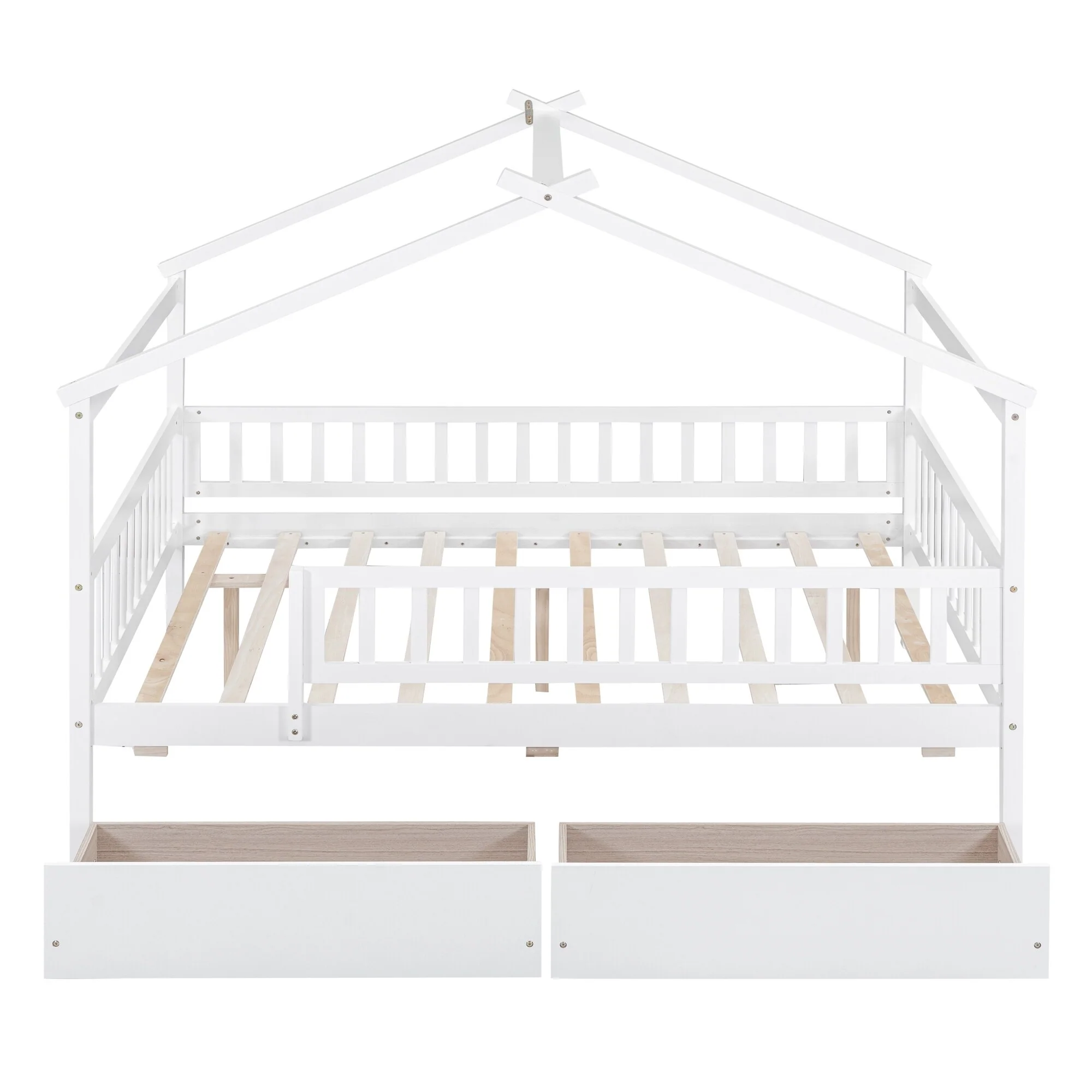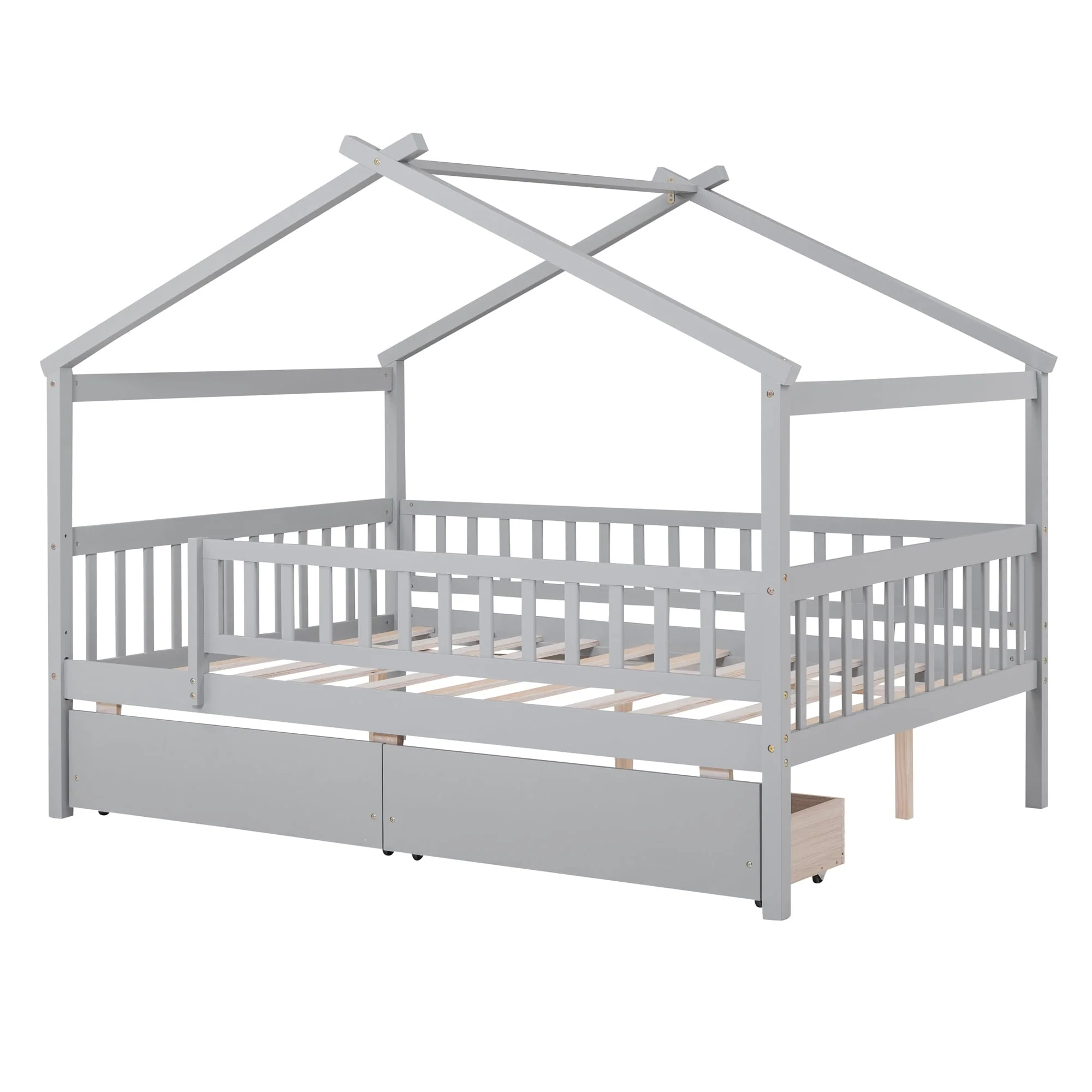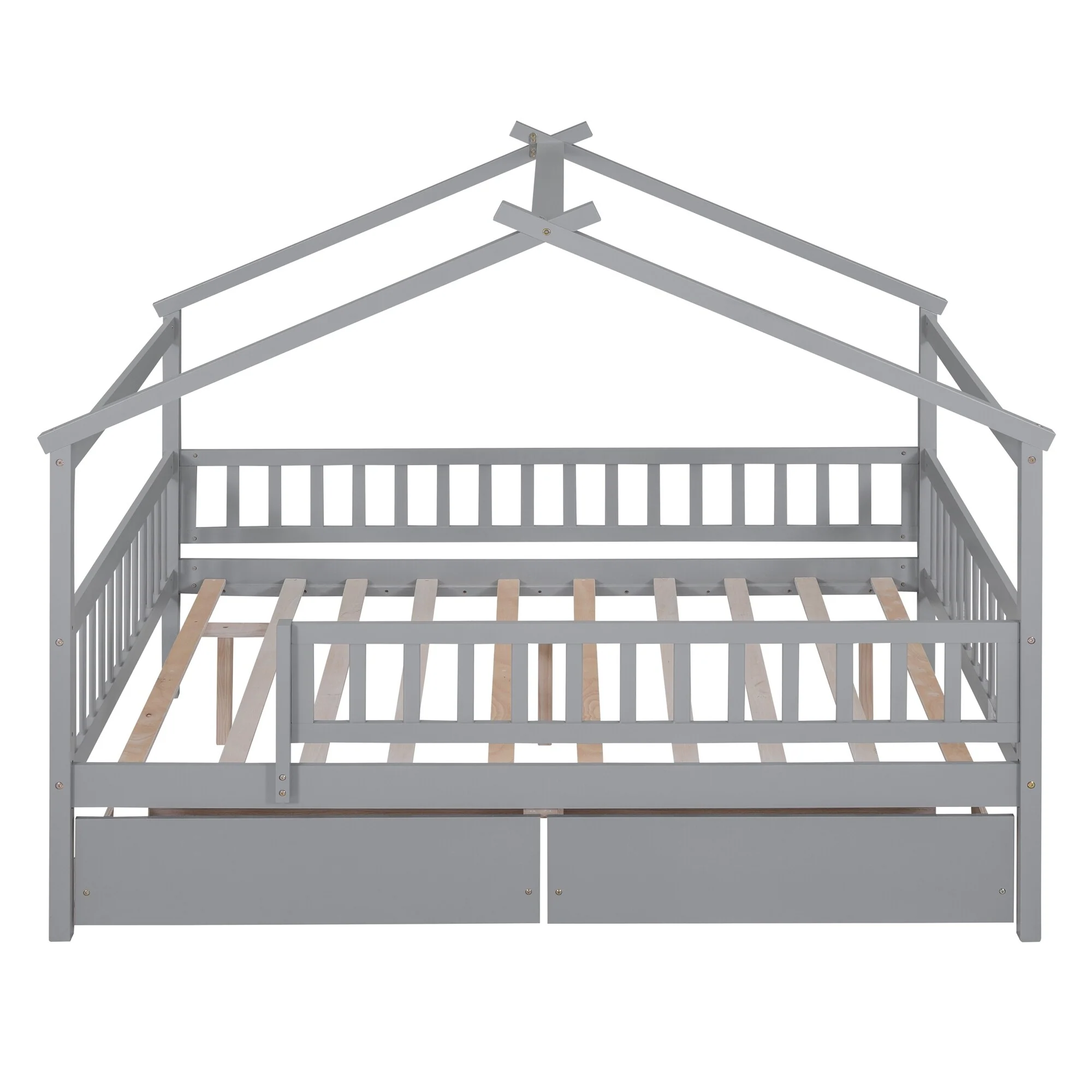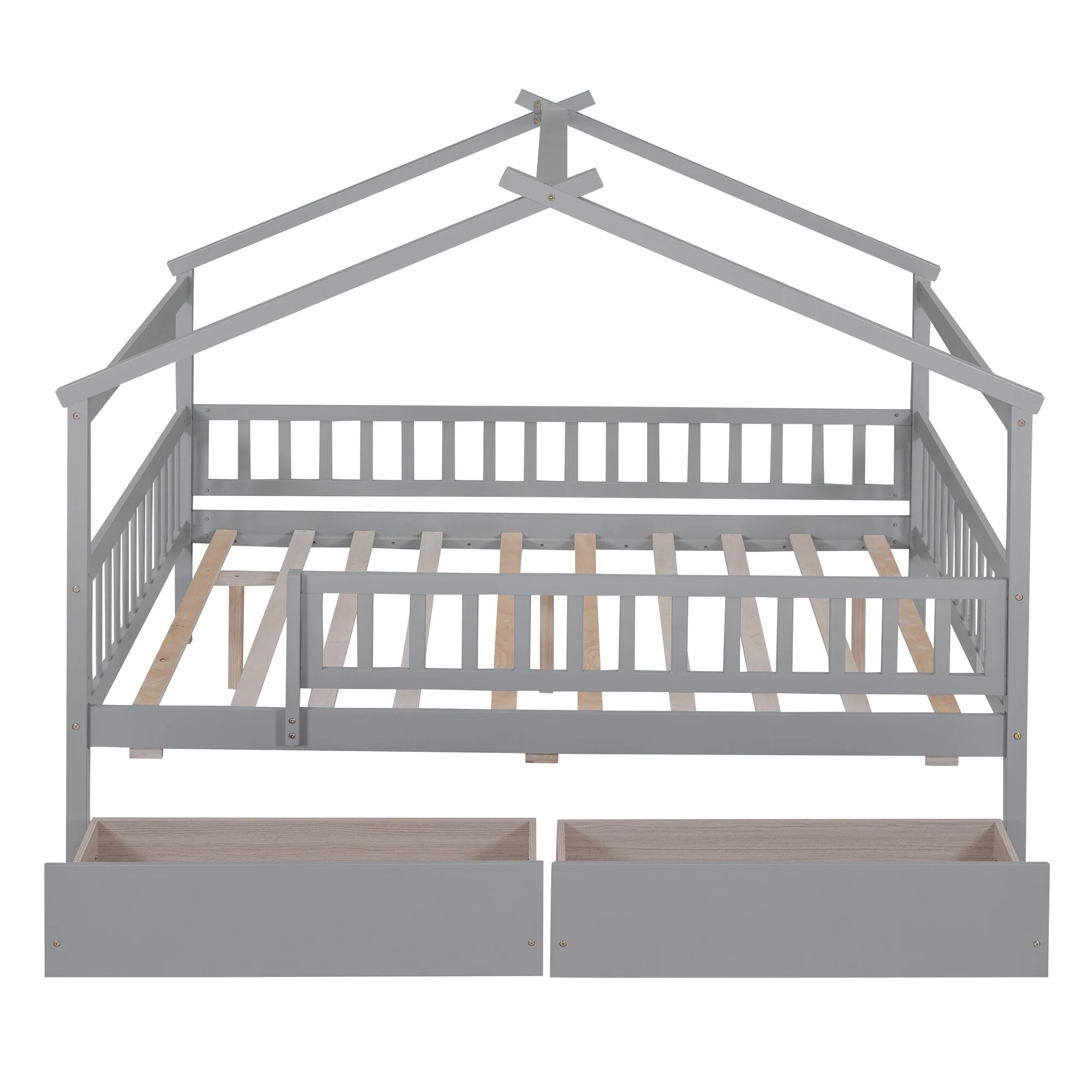 This Full Size Wooden House Bed brings creativity and function to your child's bedroom. Designed in a charming house shape with a roof and two headboards, it provides a cozy, playful environment that encourages imagination and play. The solid pine wood and MDF construction ensures durability, while the two spacious storage drawers beneath the bed offer ample storage for clothes, toys, and other essentials. The bed features a sturdy slat system that eliminates the need for a box spring, making it a practical and stylish addition to any child's room. The low height also makes it easy for young children to climb in and out of bed safely.