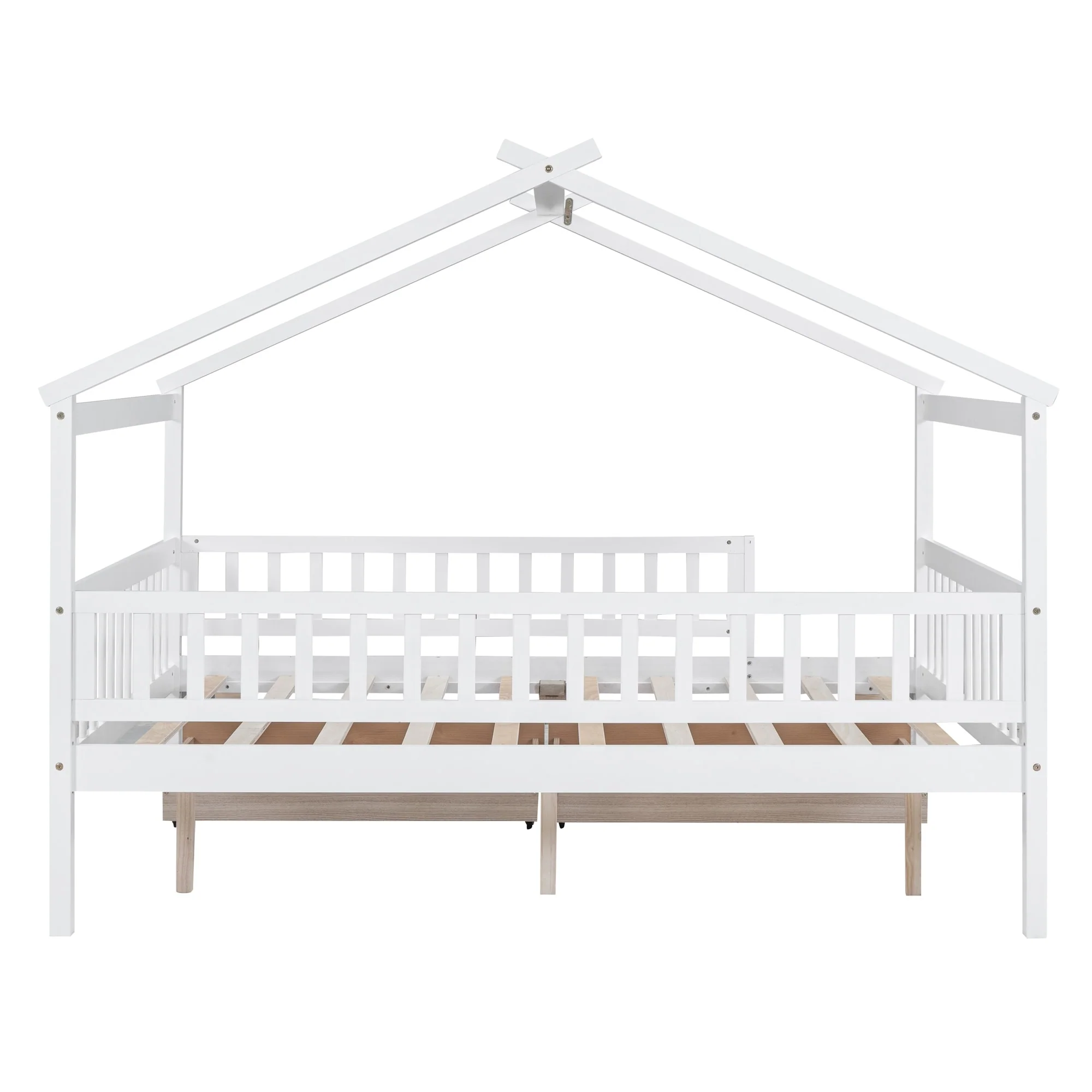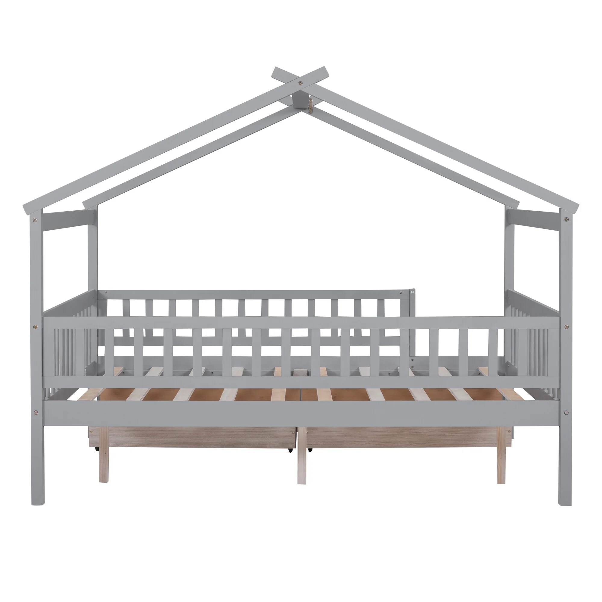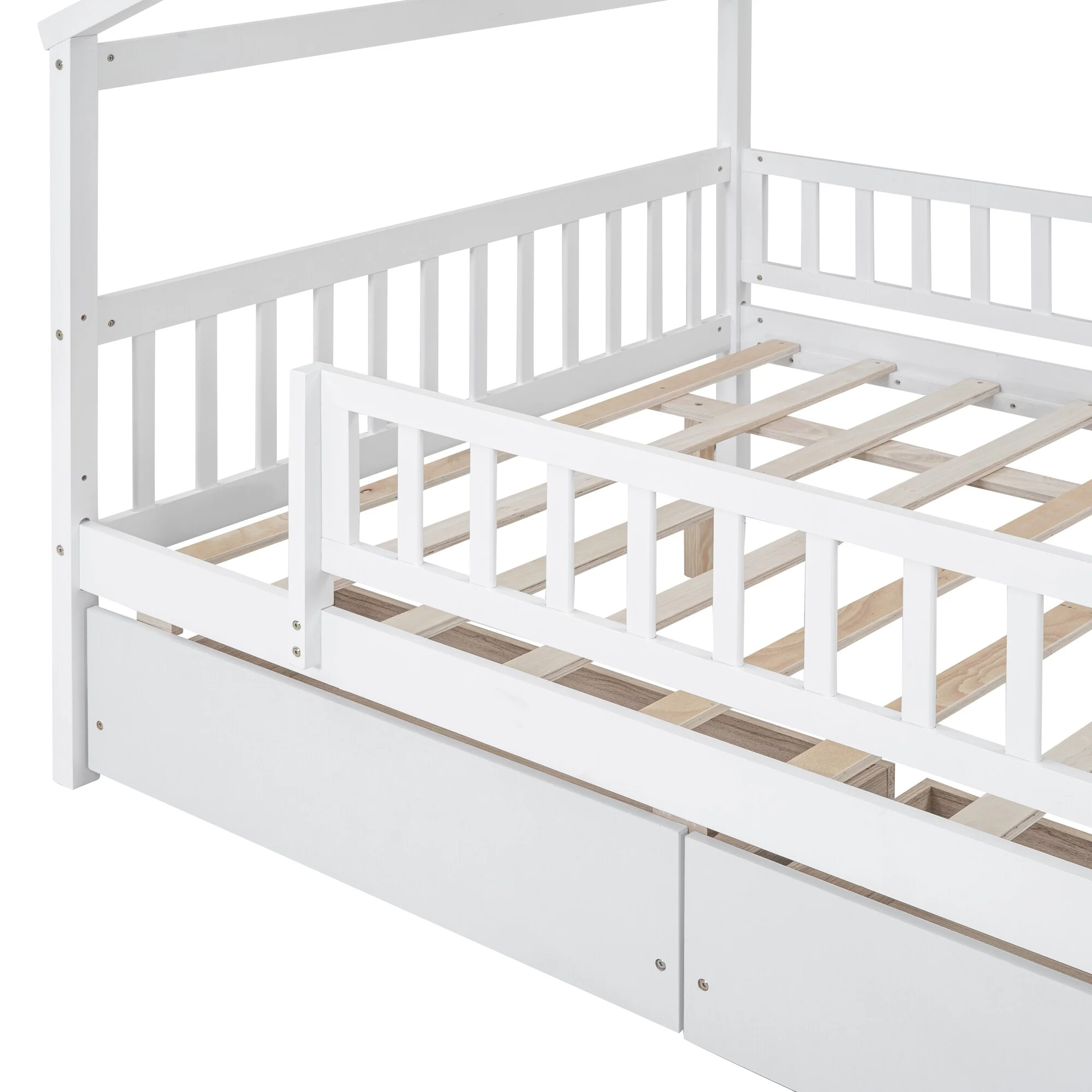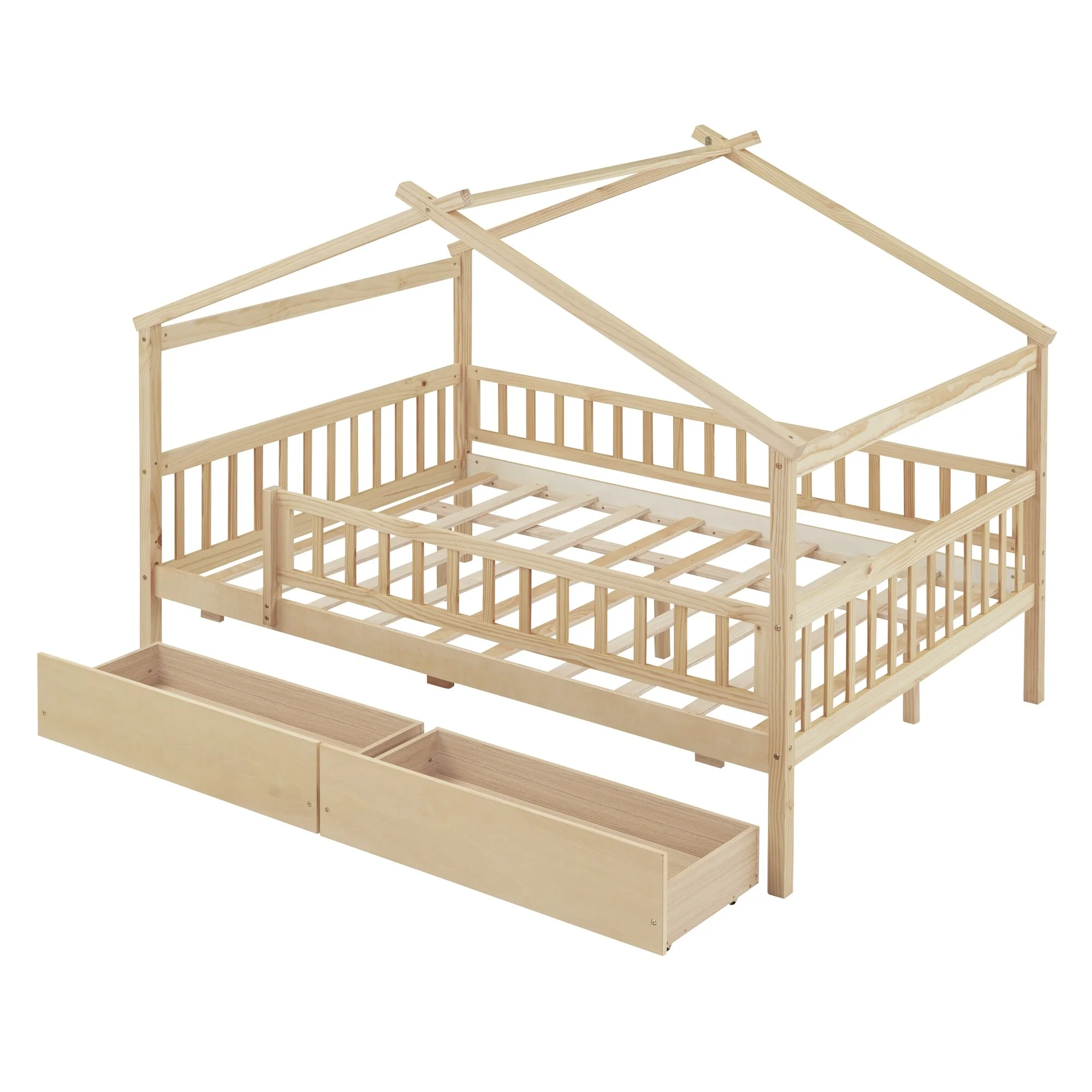This Full Size Wooden House Bed brings creativity and function to your child's bedroom. Designed in a charming house shape with a roof and two headboards, it provides a cozy, playful environment that encourages imagination and play. The solid pine wood and MDF construction ensures durability, while the two spacious storage drawers beneath the bed offer ample storage for clothes, toys, and other essentials. The bed features a sturdy slat system that eliminates the need for a box spring, making it a practical and stylish addition to any child's room. The low height also makes it easy for young children to climb in and out of bed safely.