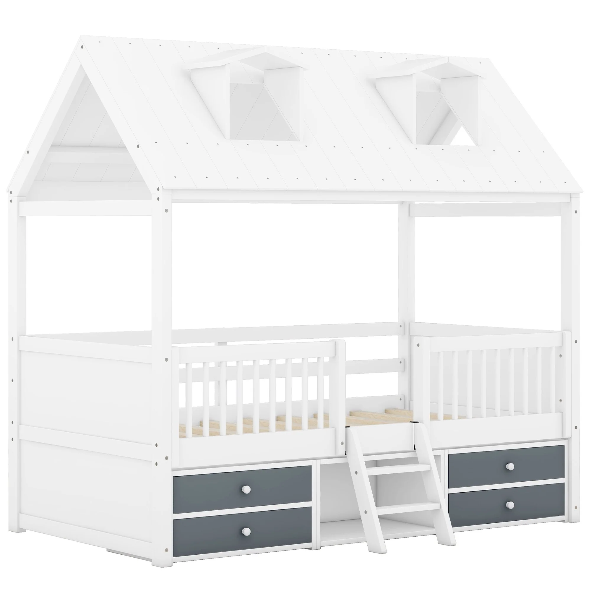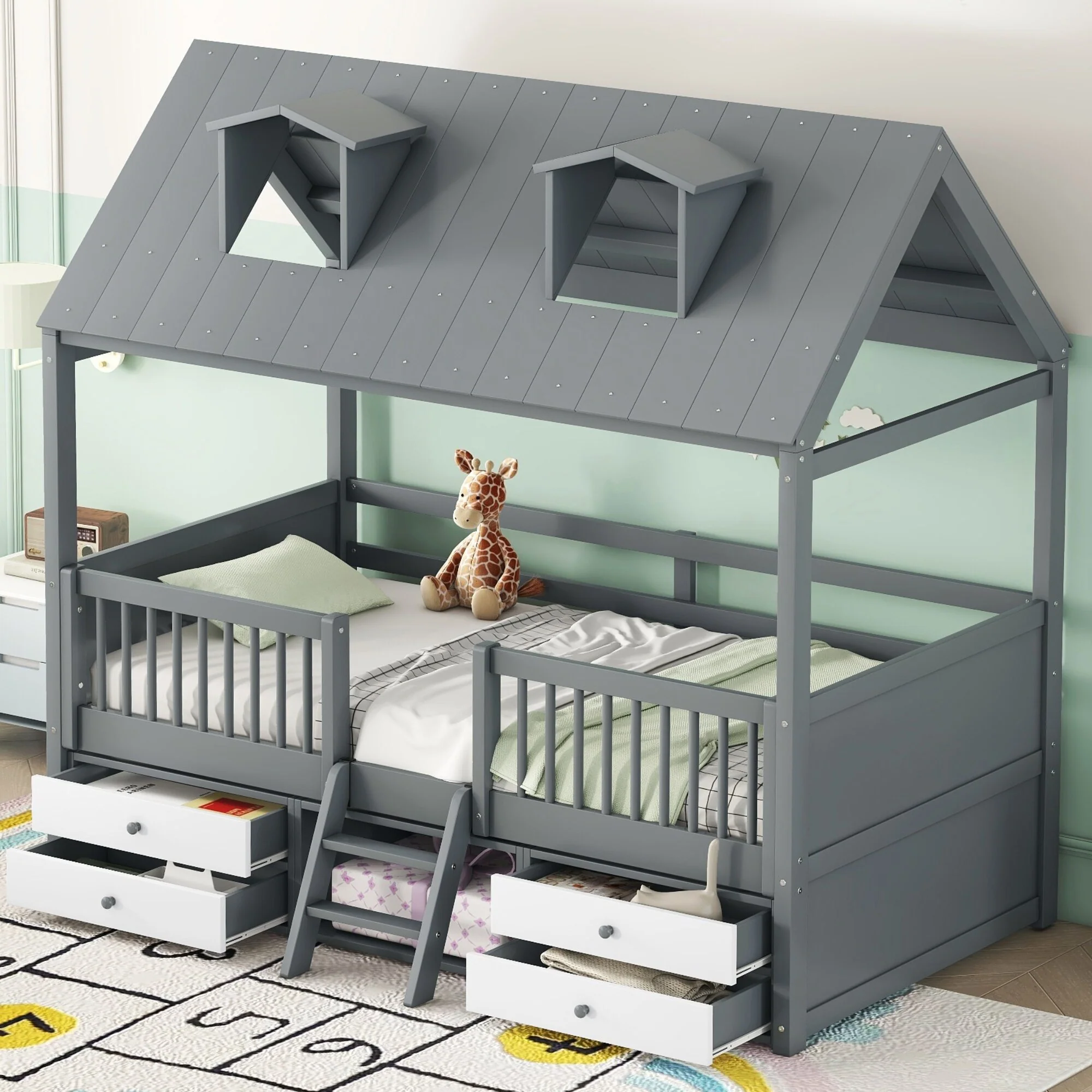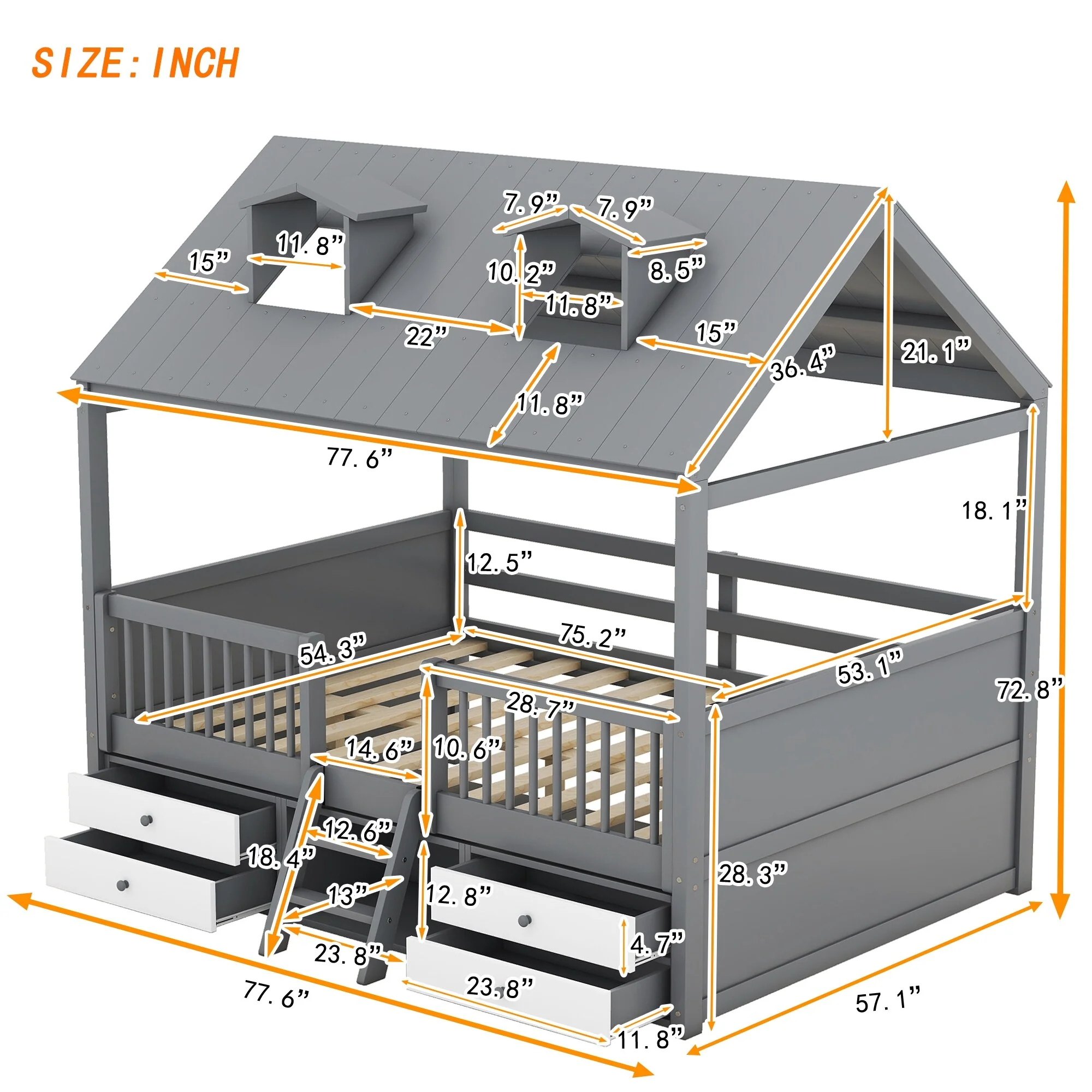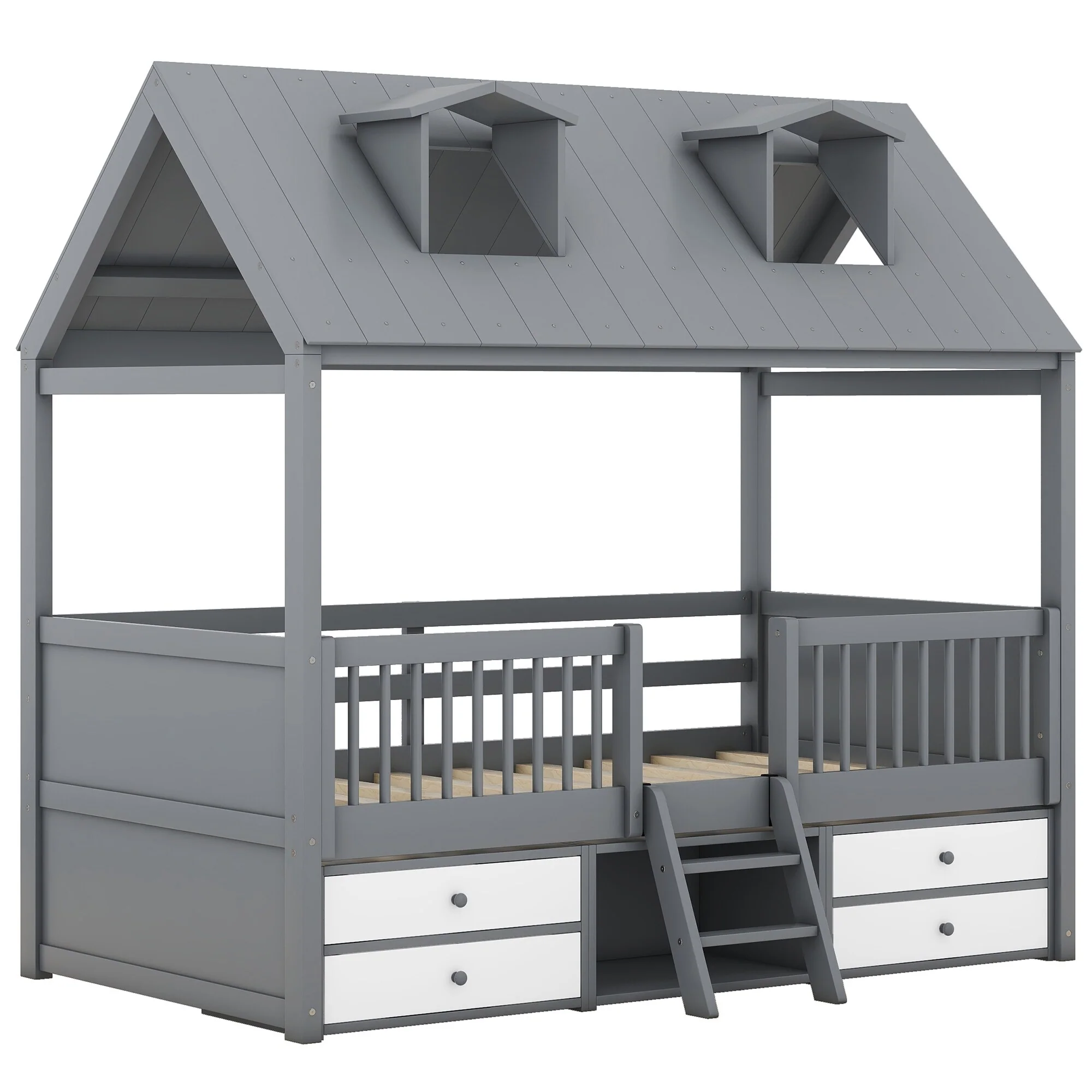 Designed with creativity and practicality in mind, this Twin Size Wood House Bed Frame offers a fun and functional space for your child. Featuring skylights in the roof, the bed lets in natural light and creates a magical setting for daytime play or bedtime relaxation. The sturdy wooden frame includes a fence for added charm and safety, while a ladder provides easy access to the sleeping area. Four built-in drawers and shelves offer ample storage space for toys, books, and other bedroom essentials, making this bed both a playful retreat and an organizational solution. With a durable construction of pine wood and MDF, this bed is built to last.