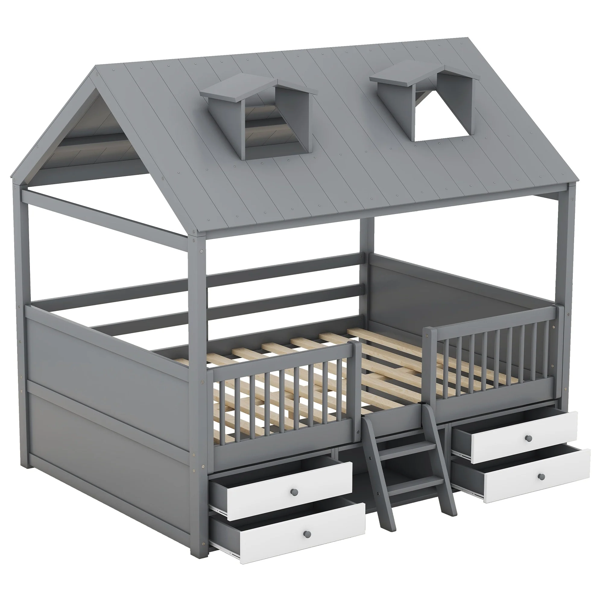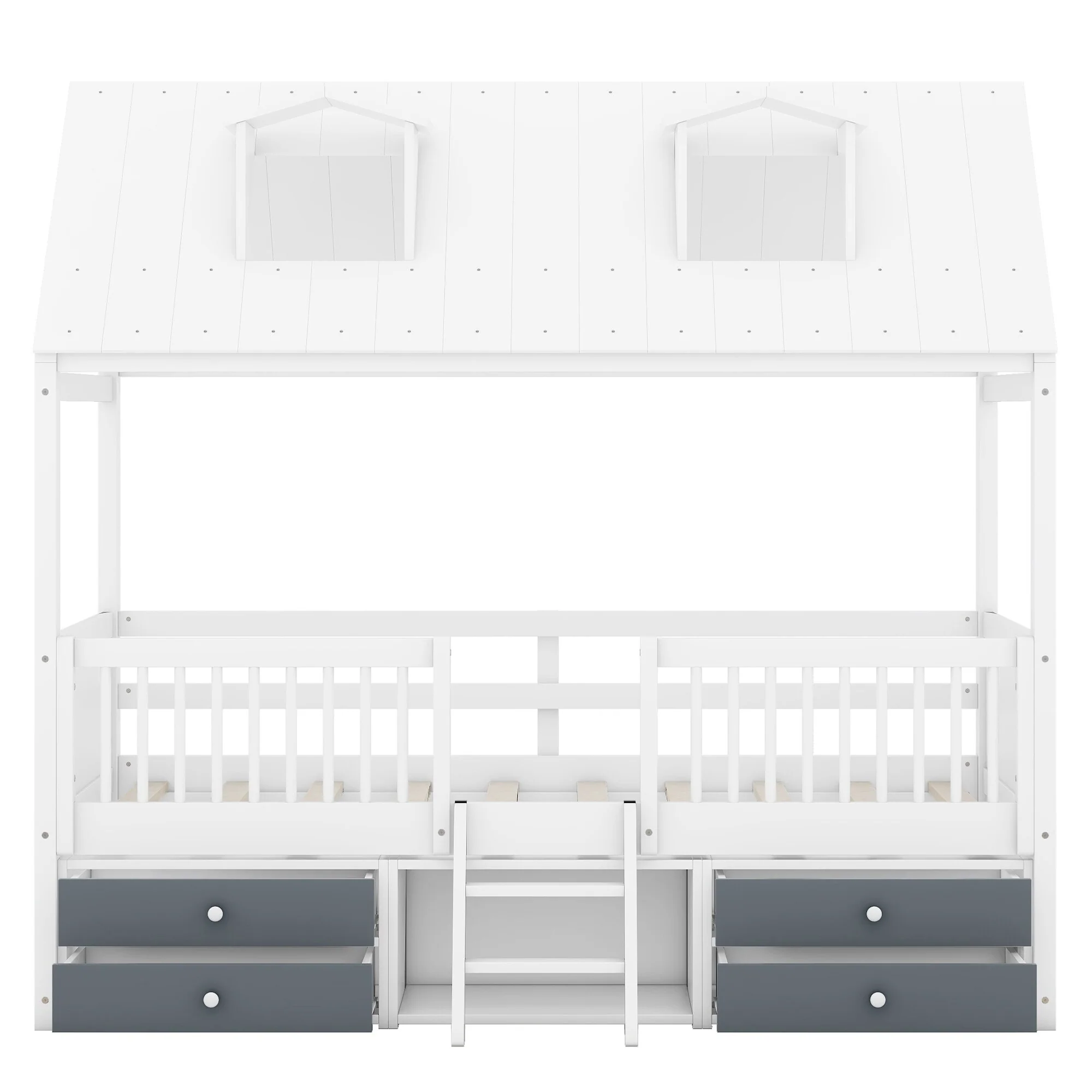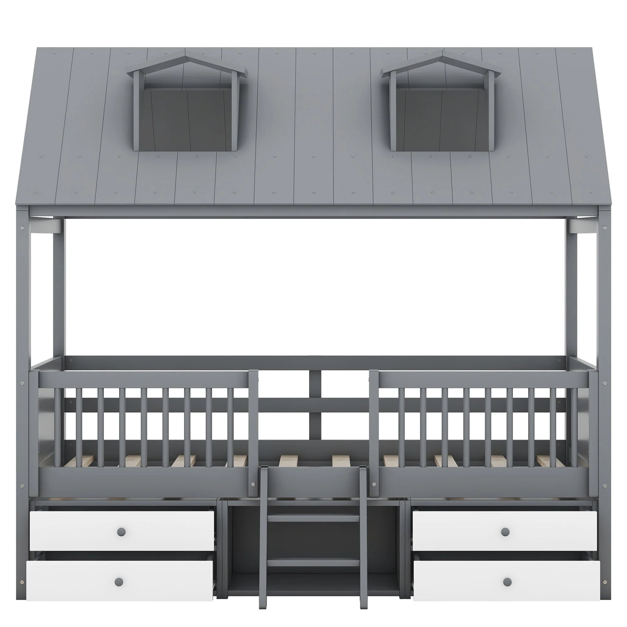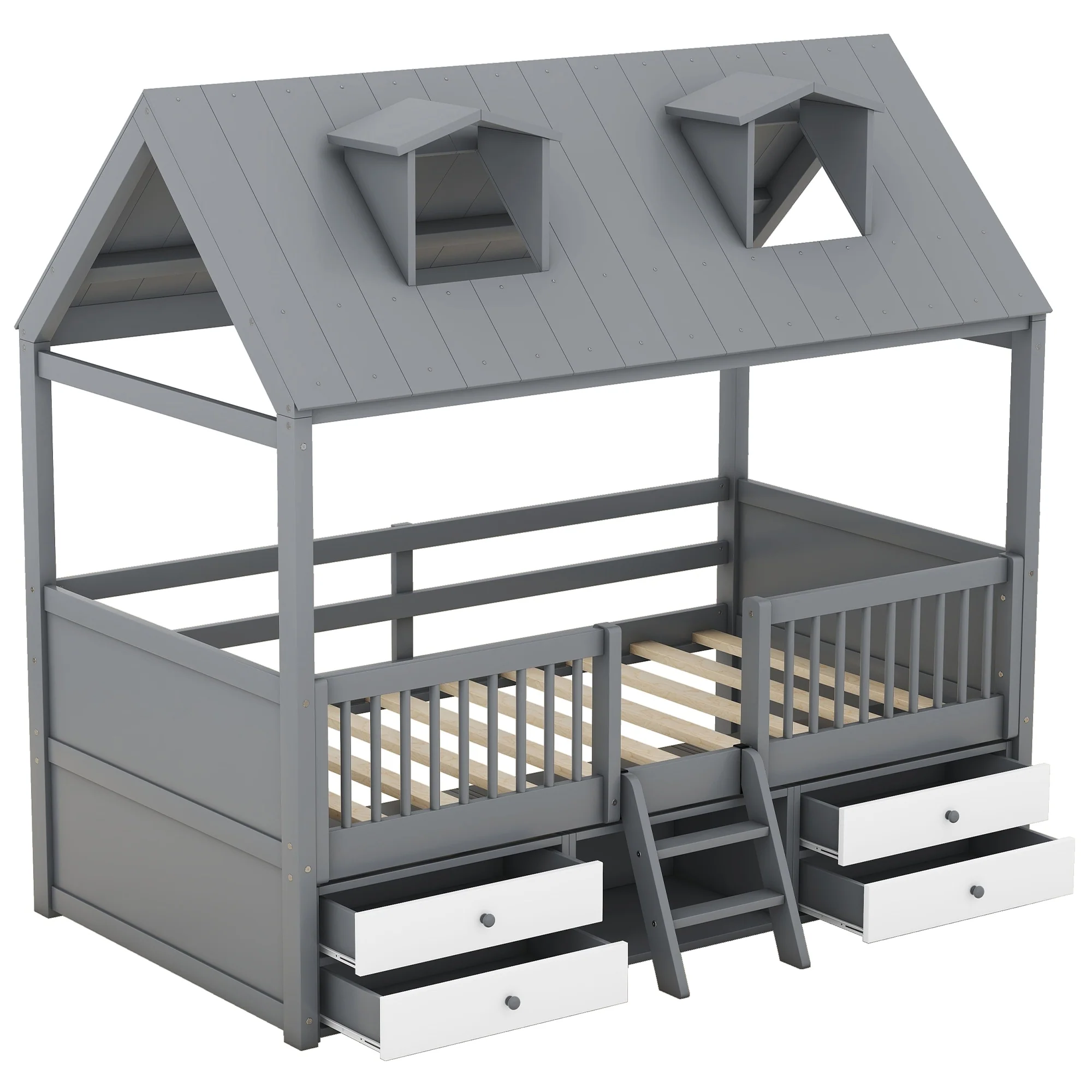 Designed with creativity and practicality in mind, this Twin Size Wood House Bed Frame offers a fun and functional space for your child. Featuring skylights in the roof, the bed lets in natural light and creates a magical setting for daytime play or bedtime relaxation. The sturdy wooden frame includes a fence for added charm and safety, while a ladder provides easy access to the sleeping area. Four built-in drawers and shelves offer ample storage space for toys, books, and other bedroom essentials, making this bed both a playful retreat and an organizational solution. With a durable construction of pine wood and MDF, this bed is built to last.