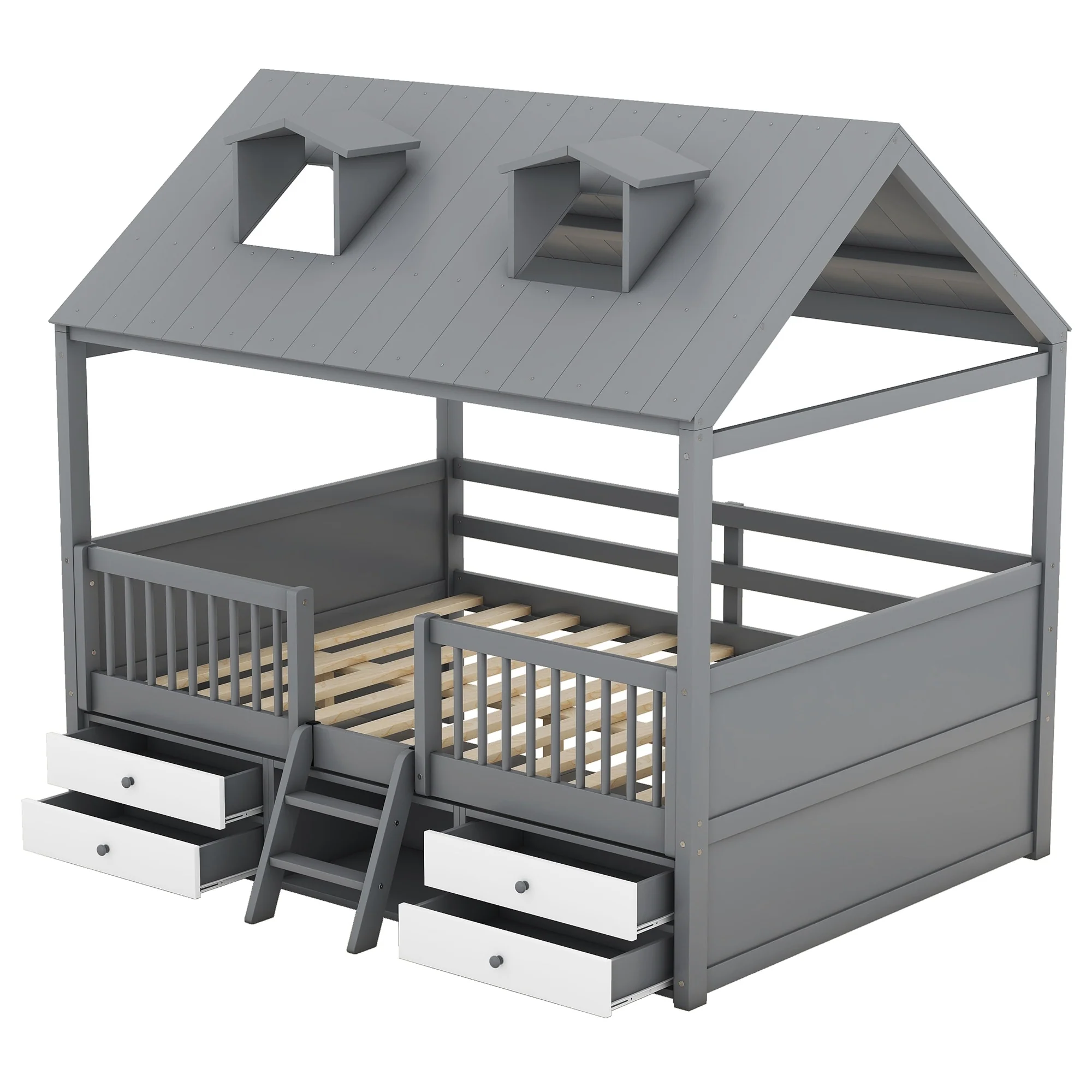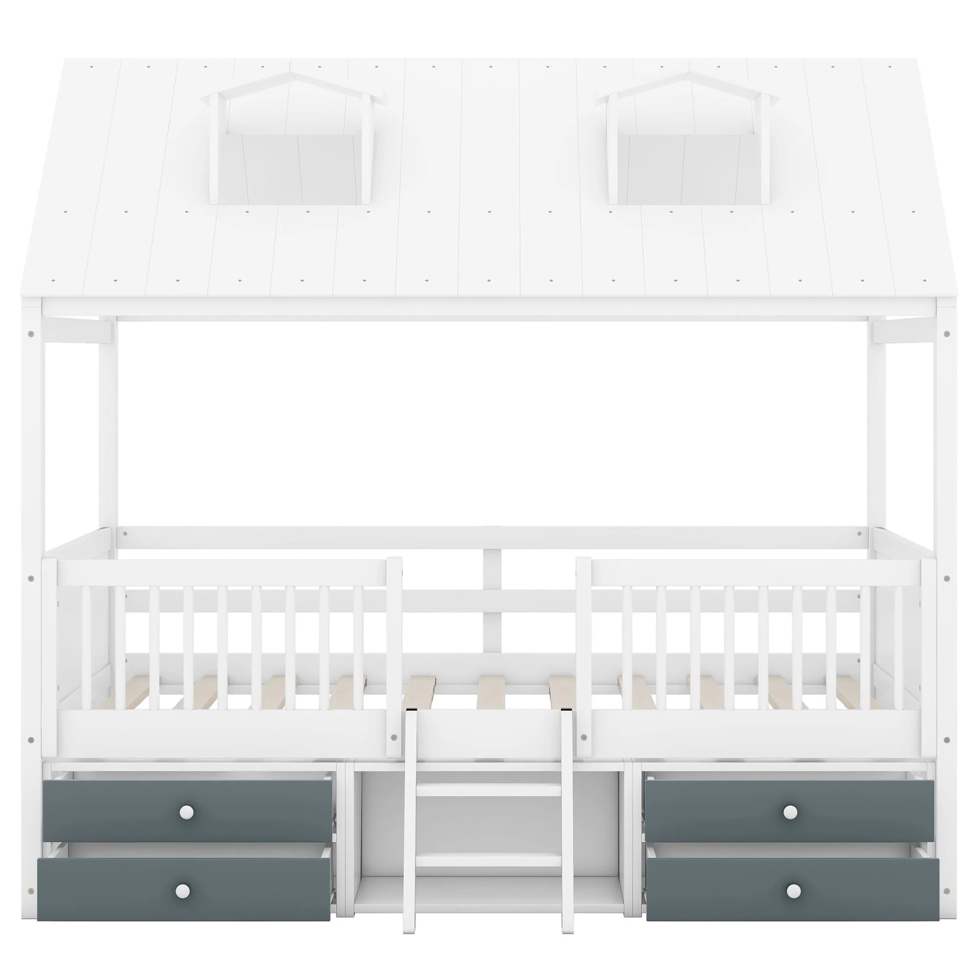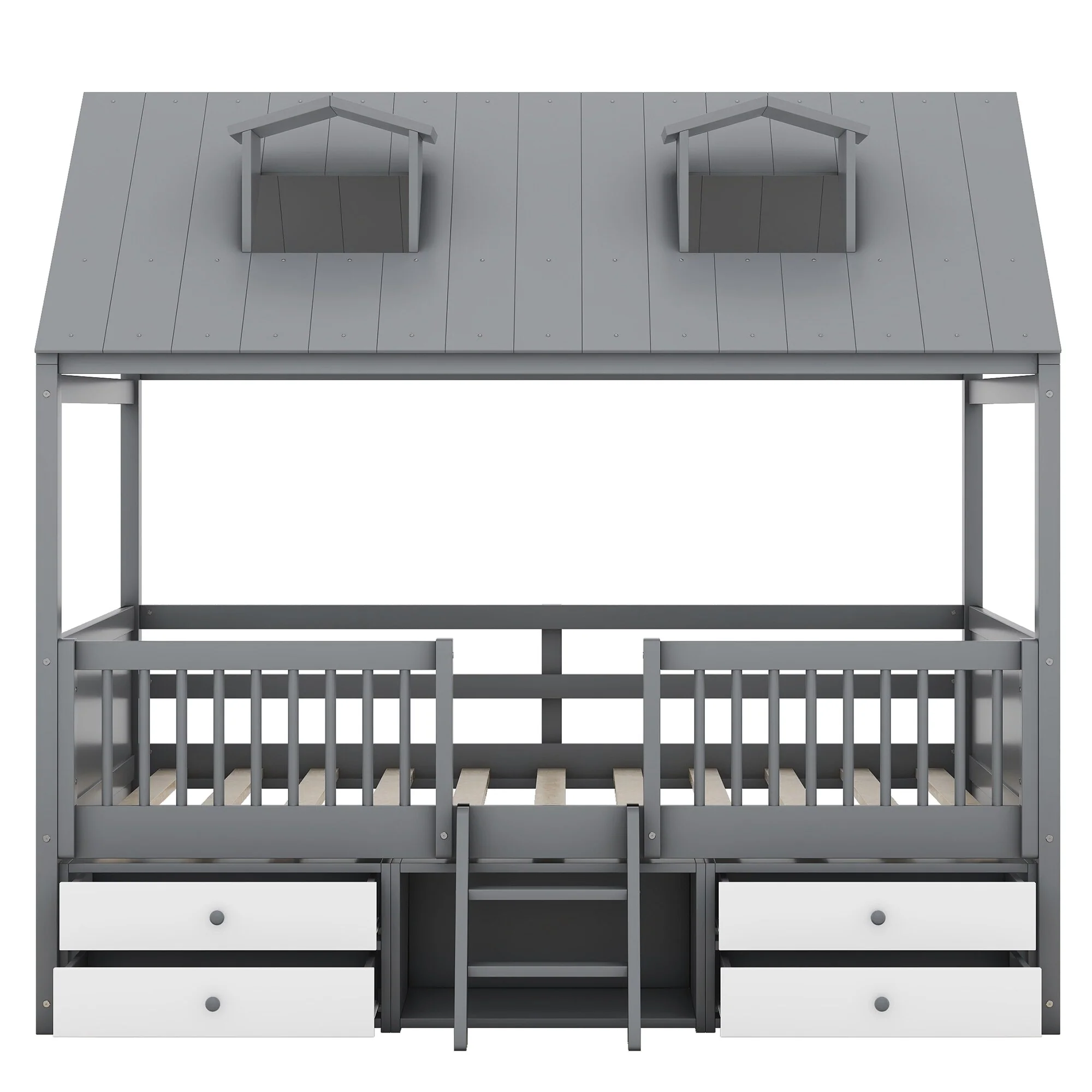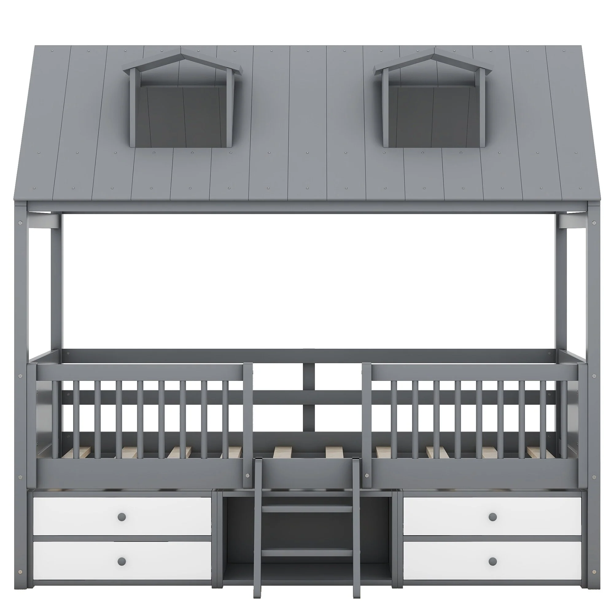 Designed with creativity and practicality in mind, this Twin Size Wood House Bed Frame offers a fun and functional space for your child. Featuring skylights in the roof, the bed lets in natural light and creates a magical setting for daytime play or bedtime relaxation. The sturdy wooden frame includes a fence for added charm and safety, while a ladder provides easy access to the sleeping area. Four built-in drawers and shelves offer ample storage space for toys, books, and other bedroom essentials, making this bed both a playful retreat and an organizational solution. With a durable construction of pine wood and MDF, this bed is built to last.