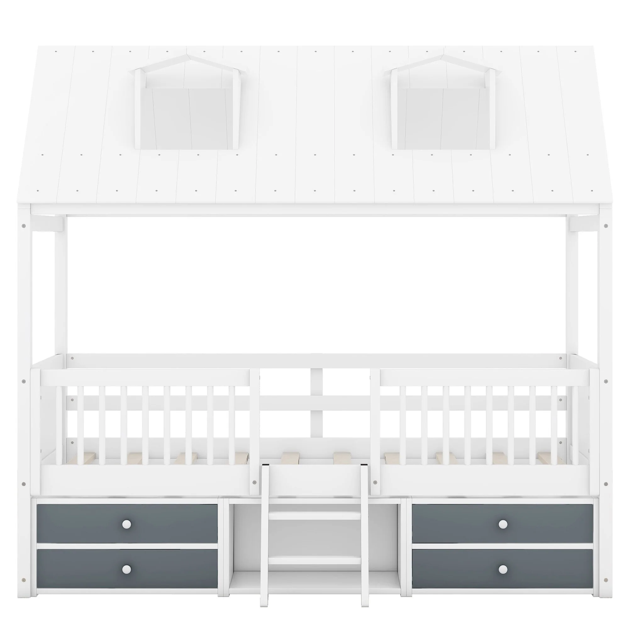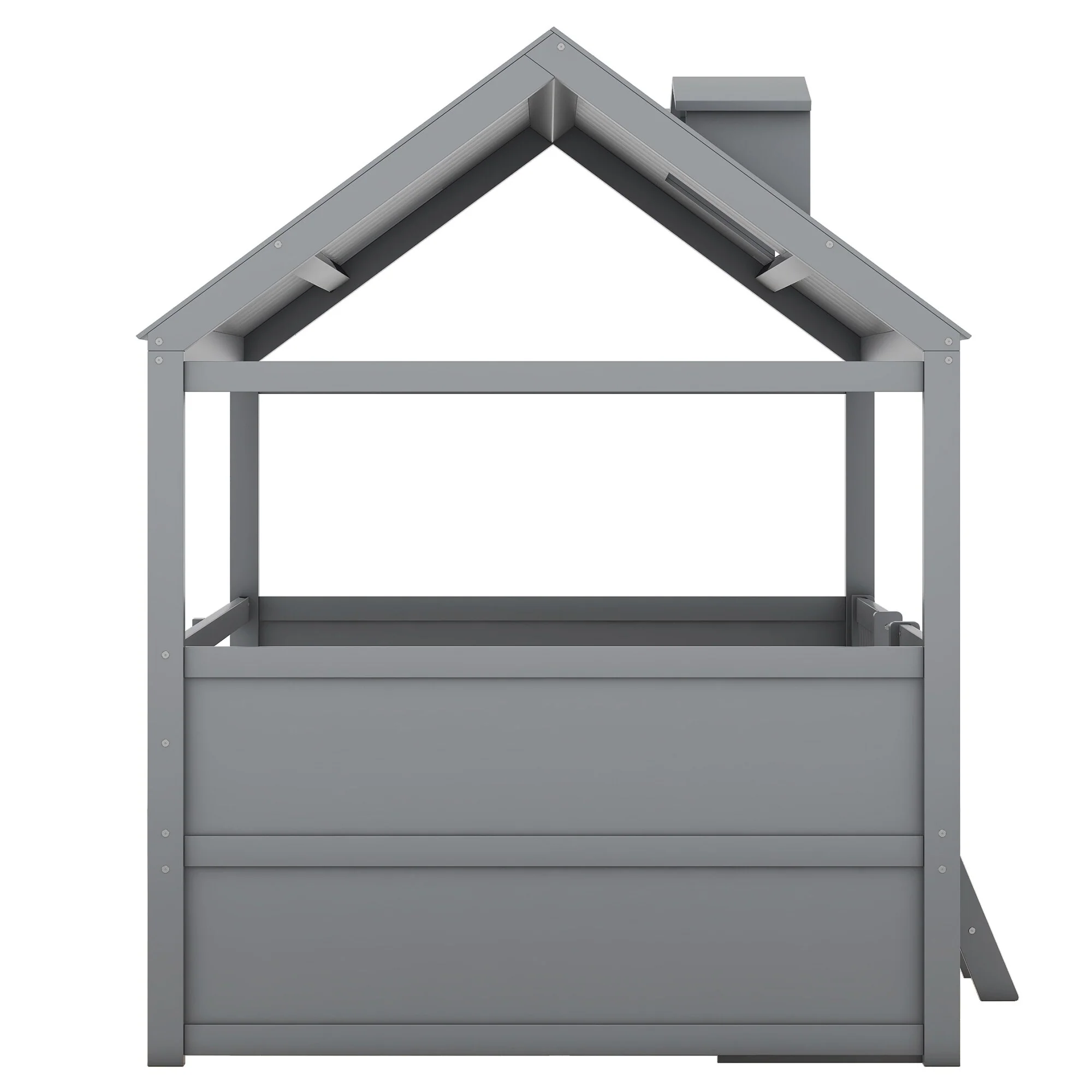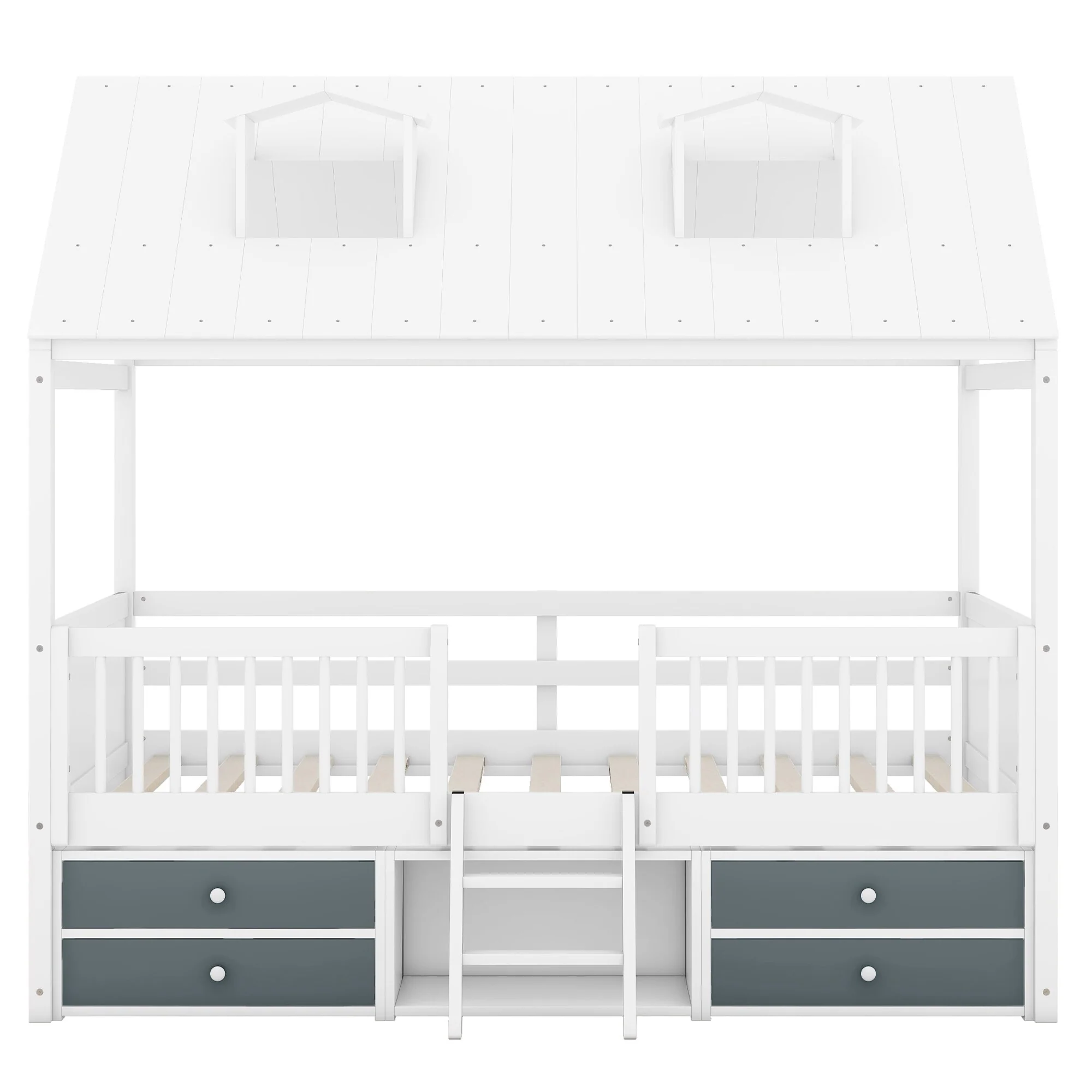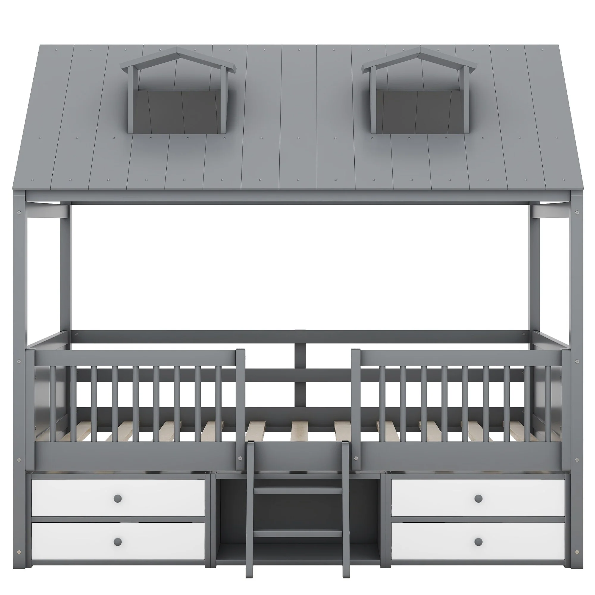 Designed with creativity and practicality in mind, this Twin Size Wood House Bed Frame offers a fun and functional space for your child. Featuring skylights in the roof, the bed lets in natural light and creates a magical setting for daytime play or bedtime relaxation. The sturdy wooden frame includes a fence for added charm and safety, while a ladder provides easy access to the sleeping area. Four built-in drawers and shelves offer ample storage space for toys, books, and other bedroom essentials, making this bed both a playful retreat and an organizational solution. With a durable construction of pine wood and MDF, this bed is built to last.
