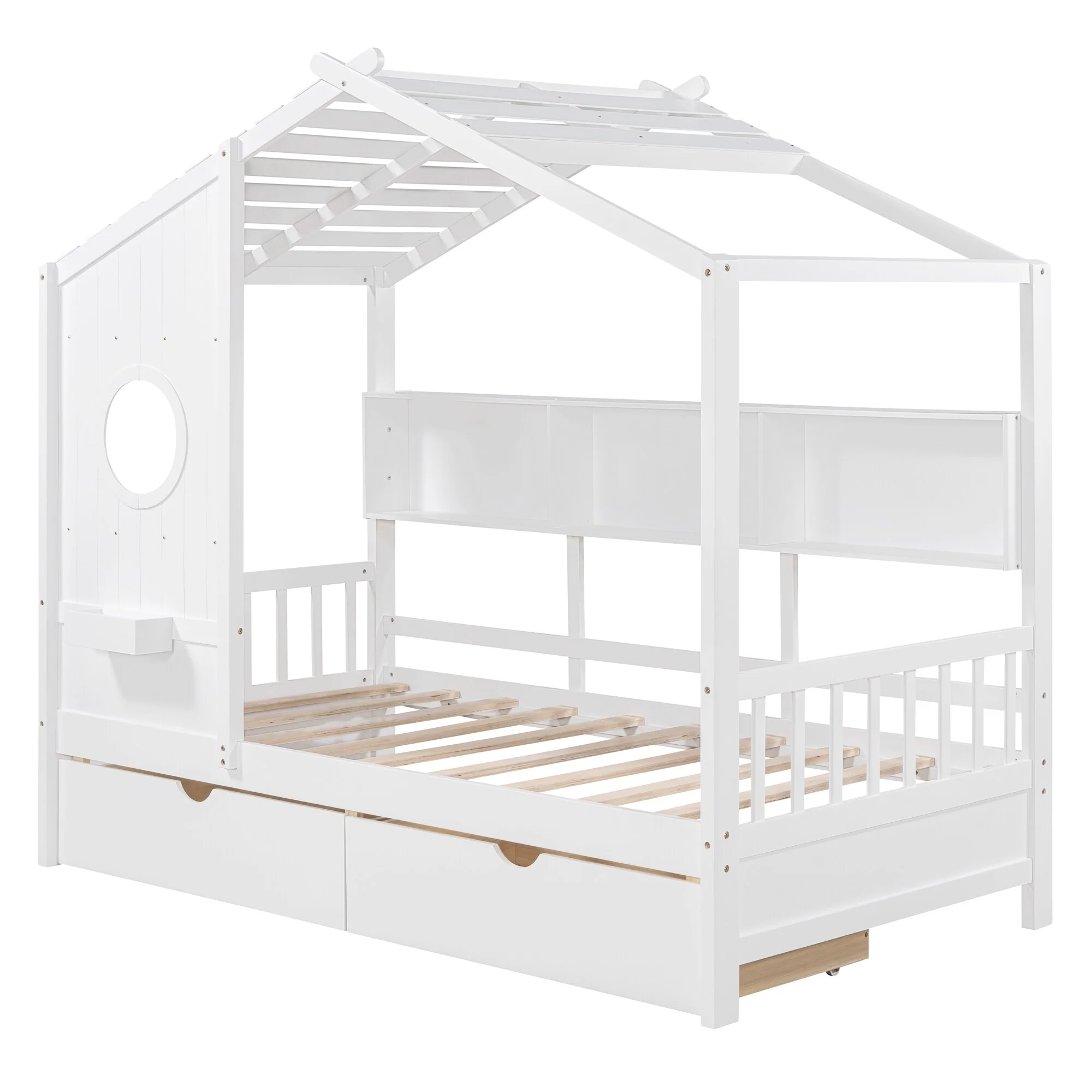 Featuring roof, this bed doubles as a semi-enclosed play place perfect for kids to study, watch TV or explore their imaginations.There is a shelf on the back of this bed, which can be used to store decoration, clocks, books and small things. This bed looks like a tiny house thanks to the pitched roof. This design is very childlike and can cater to childlike preferences.The contemporary style and neutral finish blend smoothly with any color scheme, allowing this design to shine! With roof and a sturdy pine frame, this bed offers a safe space for your kids to get a good night's sleep.