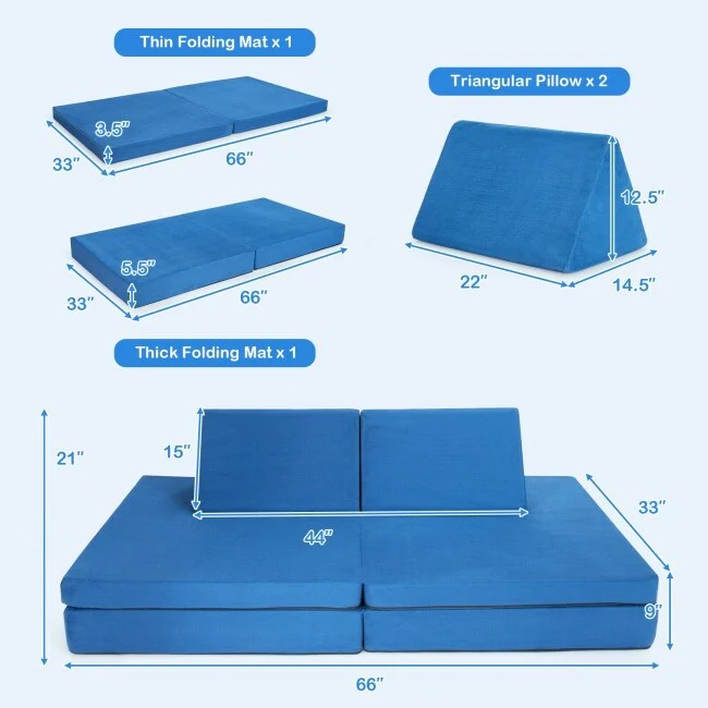 ● 4-Piece Convertible Sofa and Play Set: This 4-piece kids' playroom furniture includes 2 folding mats and 2 triangular pillows, which can be used separately or combined. Toddlers or teens can convert the sofa into a playhouse, rocket ship, tunnel, bed, 2 chairs, and more to meet various needs for playing, climbing, watching TV, or just relaxing.