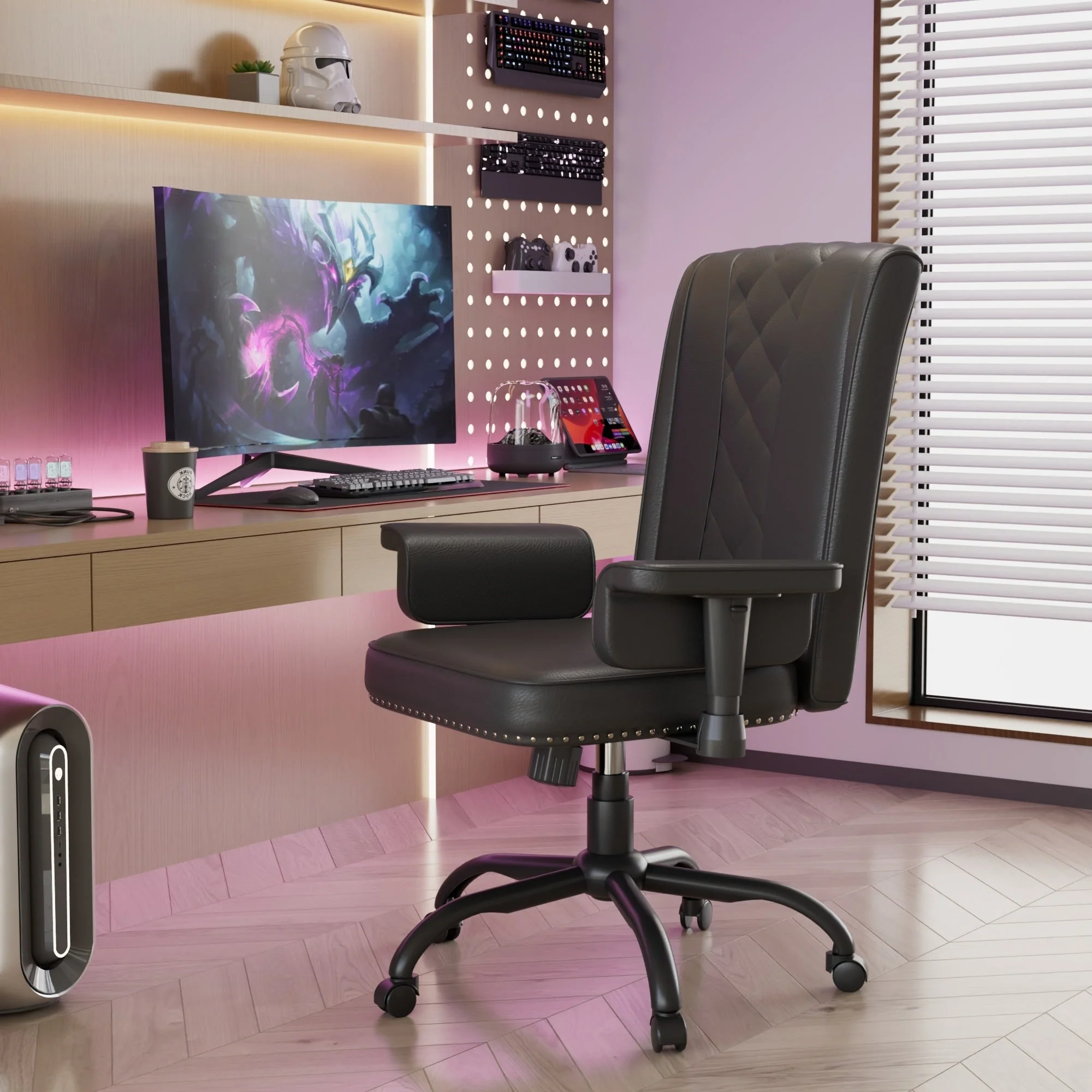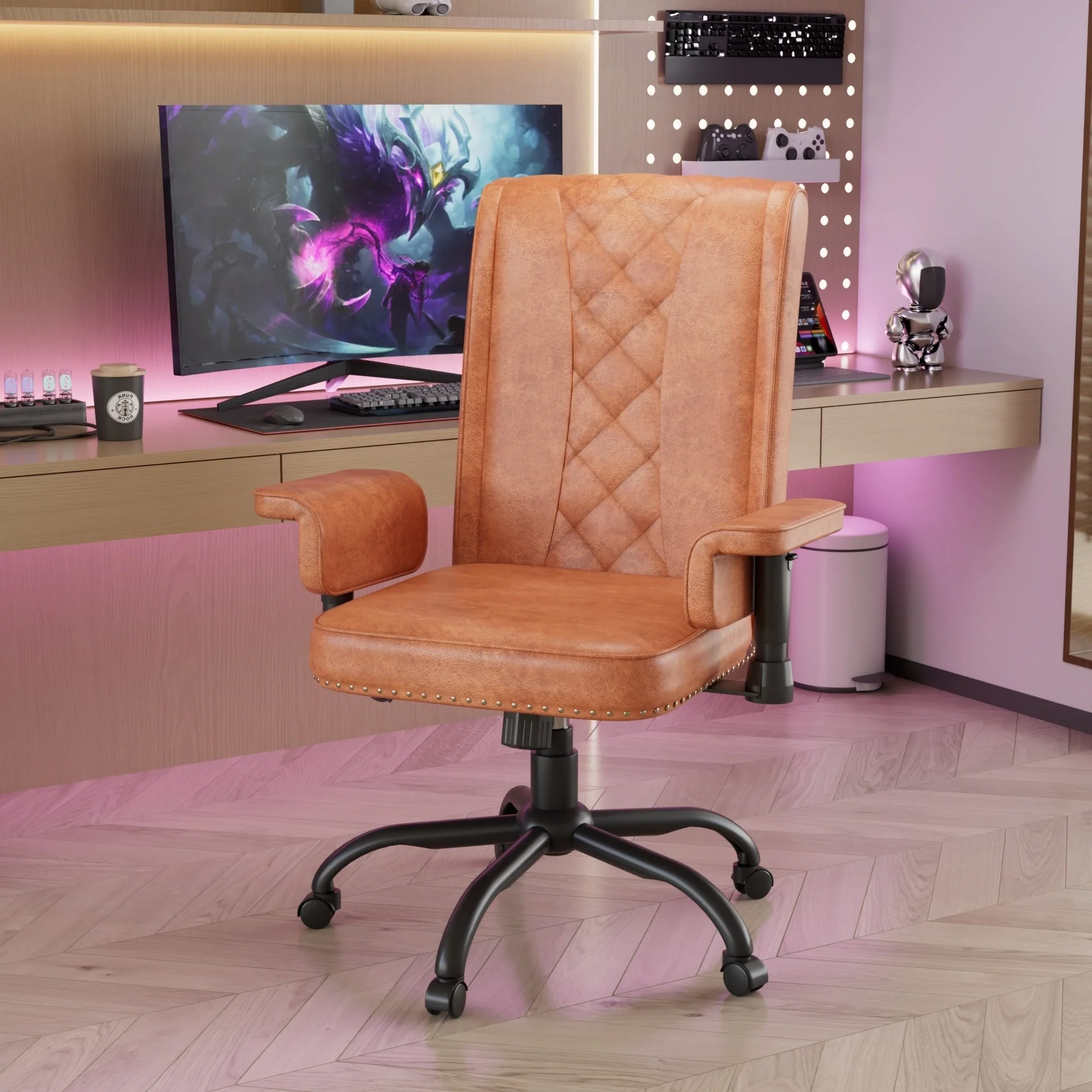 【Durable Base】The iron base of this upholstered computer chair is strong and stable enough to hold up 250 lbs. While sliding the chair, you will feel it quiet and zero noise.