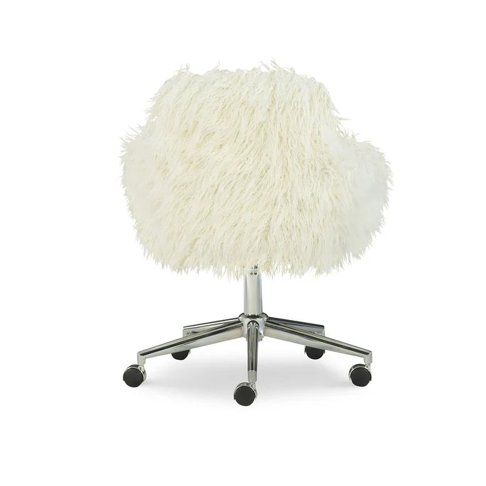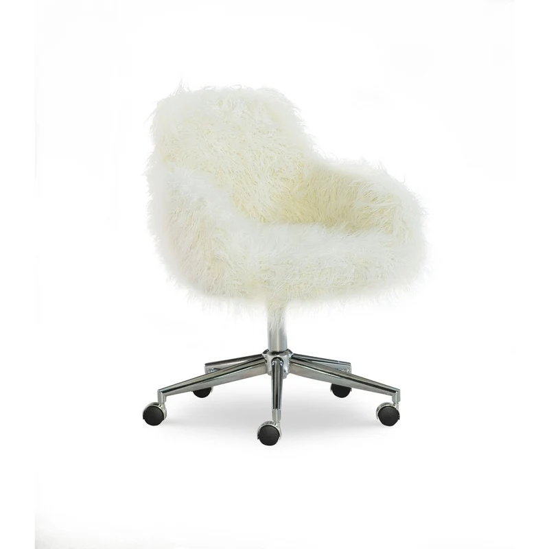 The Amber Office Chair adds a touch of fun and style to any workspace. The chair features a stunning off-white faux-fur that is upholstered to the seat and back. Completed with a chrome base and rolling casters that allow for easy movement around your workspace. The adjustable lift seat allows the chair to work with a variety of table heights and settings.