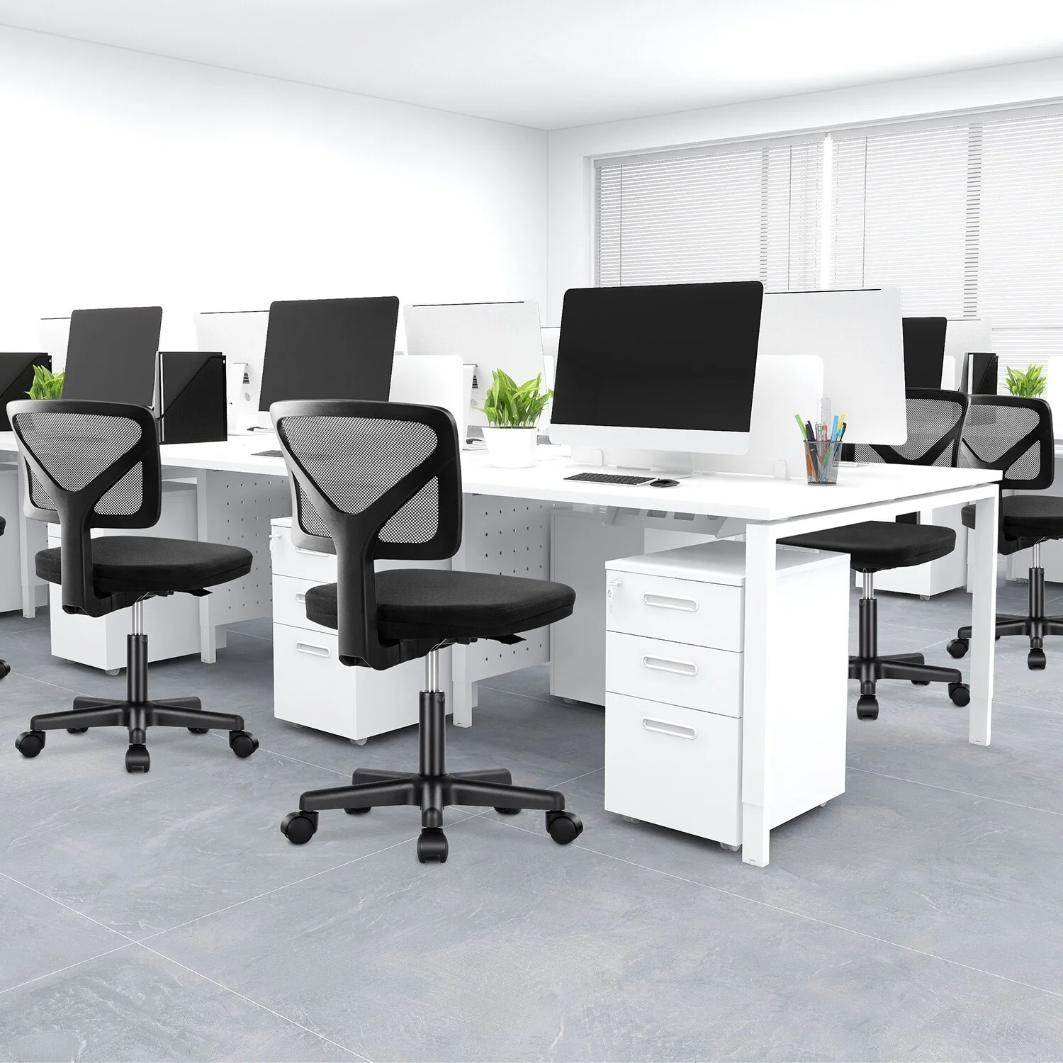 This rolling armless office chair features a high-density foam cushion with mesh fabric, providing a comfortable, breathable seating experience. The mesh design ensures air circulation, keeping you cool even during long periods of sitting. Perfect forsmall spaces, this compact chair is also height-adjustable for added versatility.