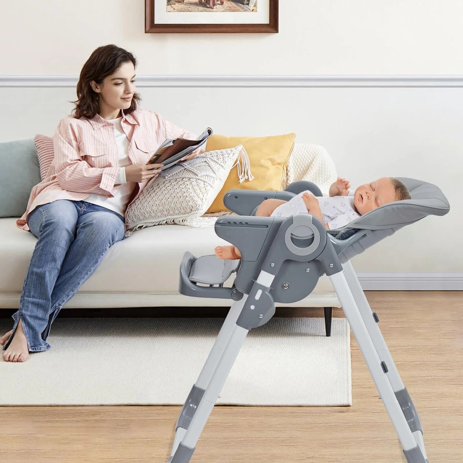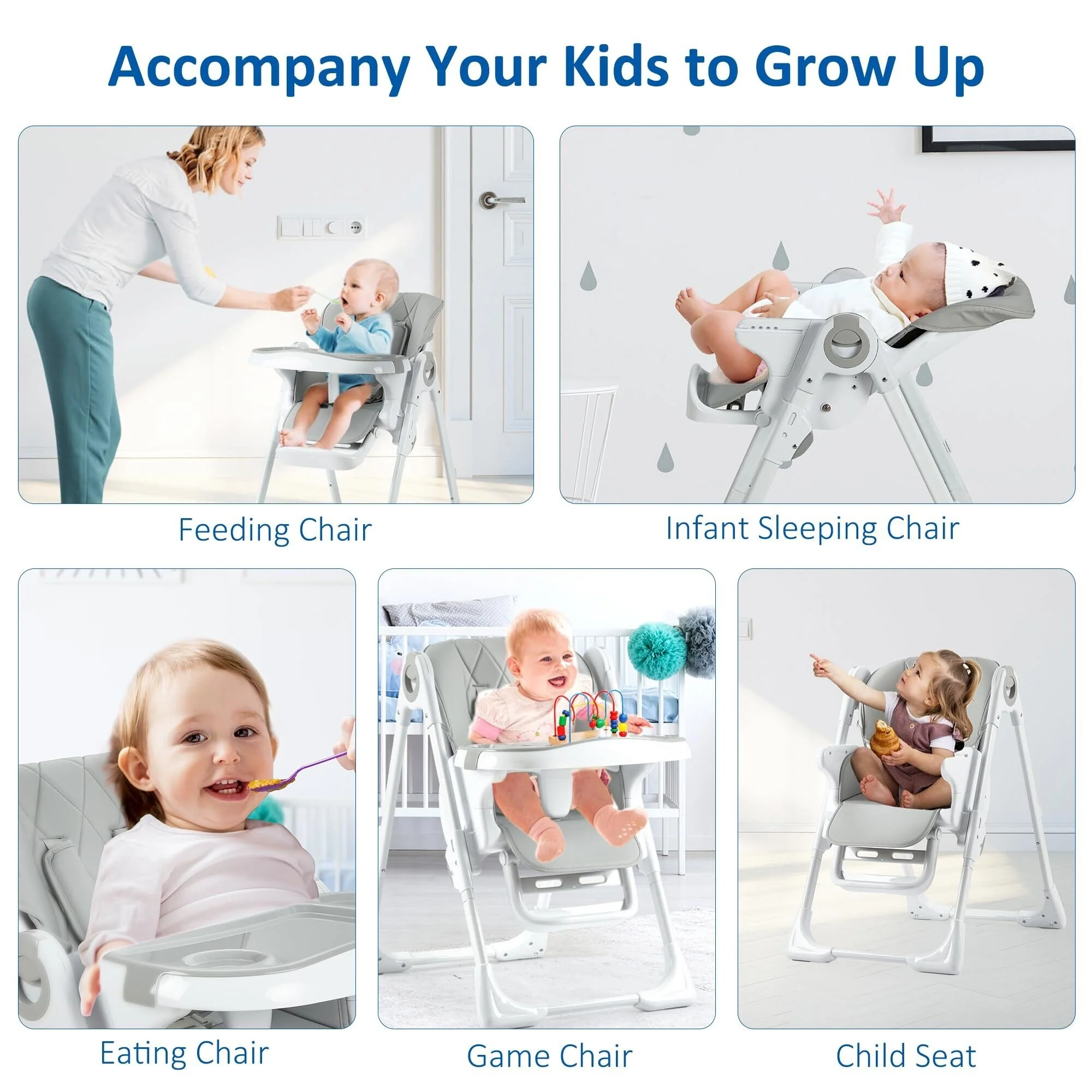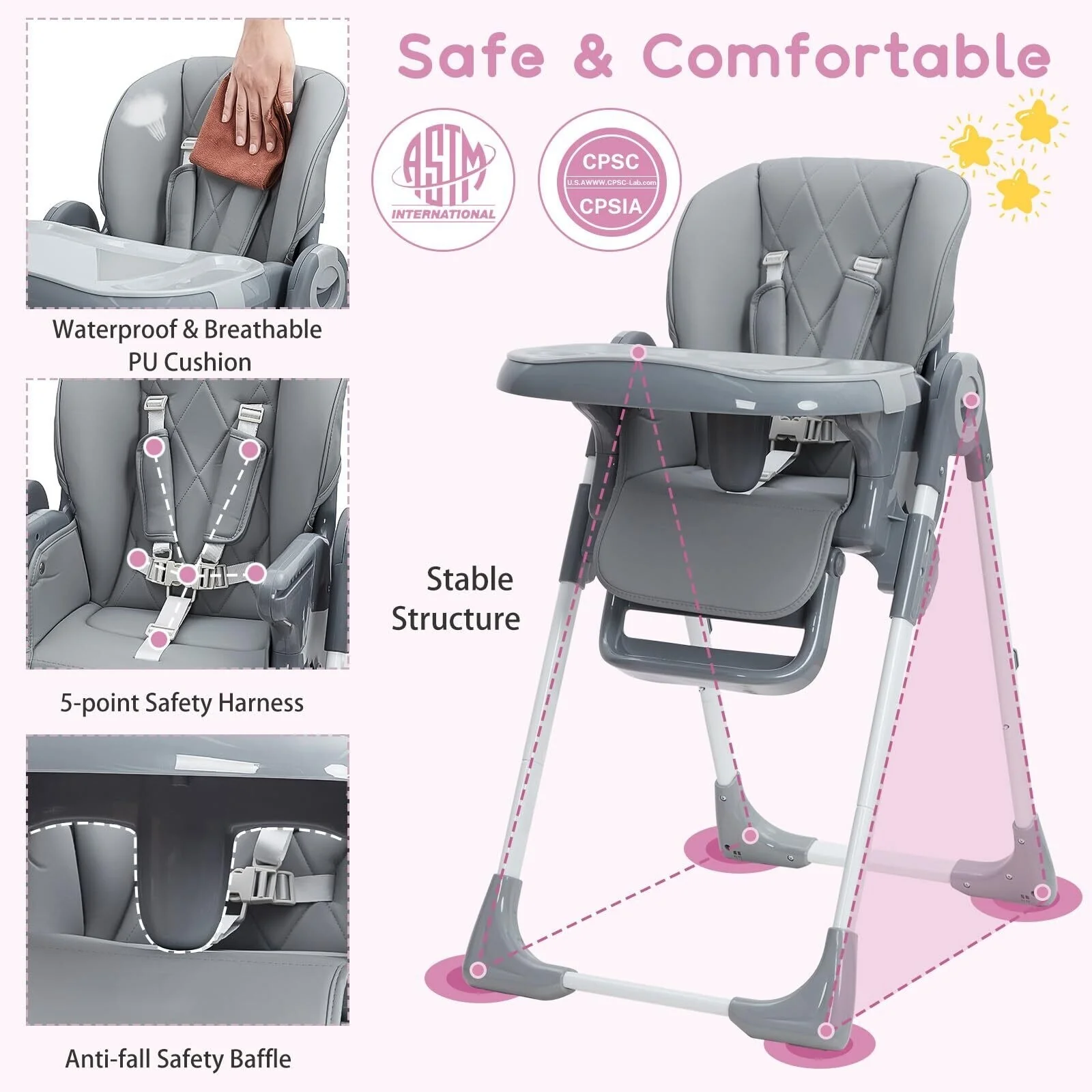 【Upgrade Material for Maximum Safety】This high chair is designed with a sturdy aluminum alloy support frame for excellent stability. It also comes with a 5-point harness and soft seat to ensure your baby's safety and comfort.