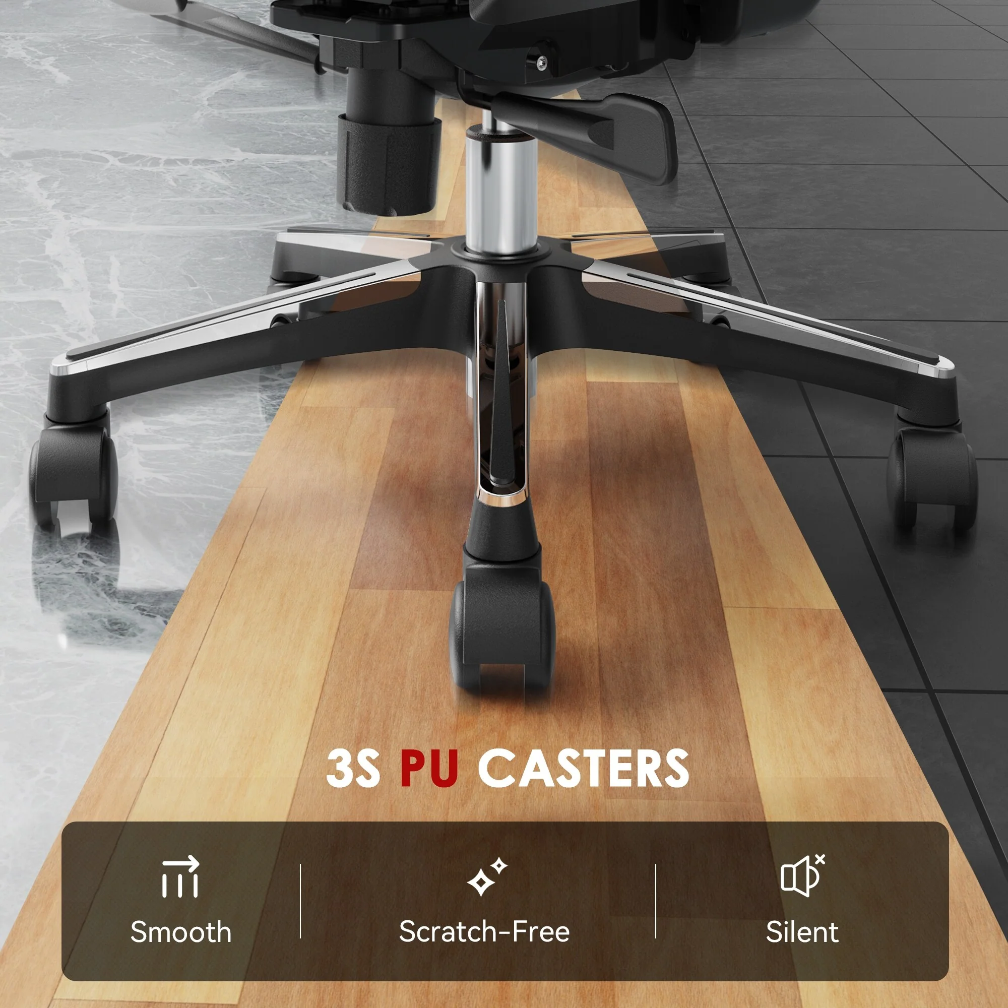 This office chair is aesthetic ergonomic chair comes with breathable mesh backrest, wide thick soft memory foam seat cushion, 3D adjustable armrests and big proper S-curve adjustable lumbar support. With hidden retractable footrest and 155° maximum TILT, you can gently pull footrest out and turn the chair into a lunch break bed. The task chairs can accurately decompose pressure, scientifically protect lumbar spine, neck, arm, leg and hip. 5 star heavy duty chair base with 360 degree swivel PU mute rolling wheels go smoothly on wood floor or carpet, this high back home office task chair goes well in sliding.
