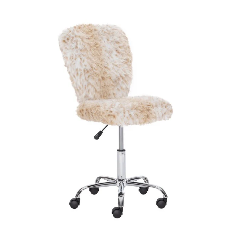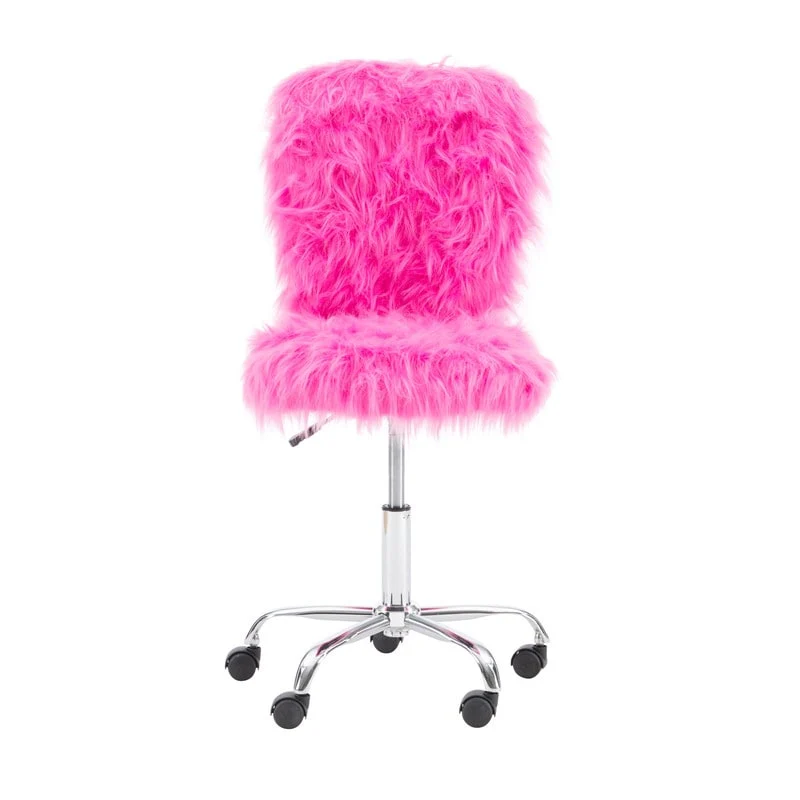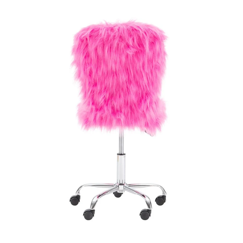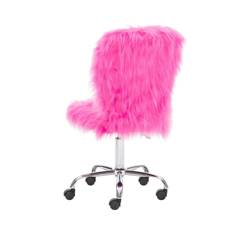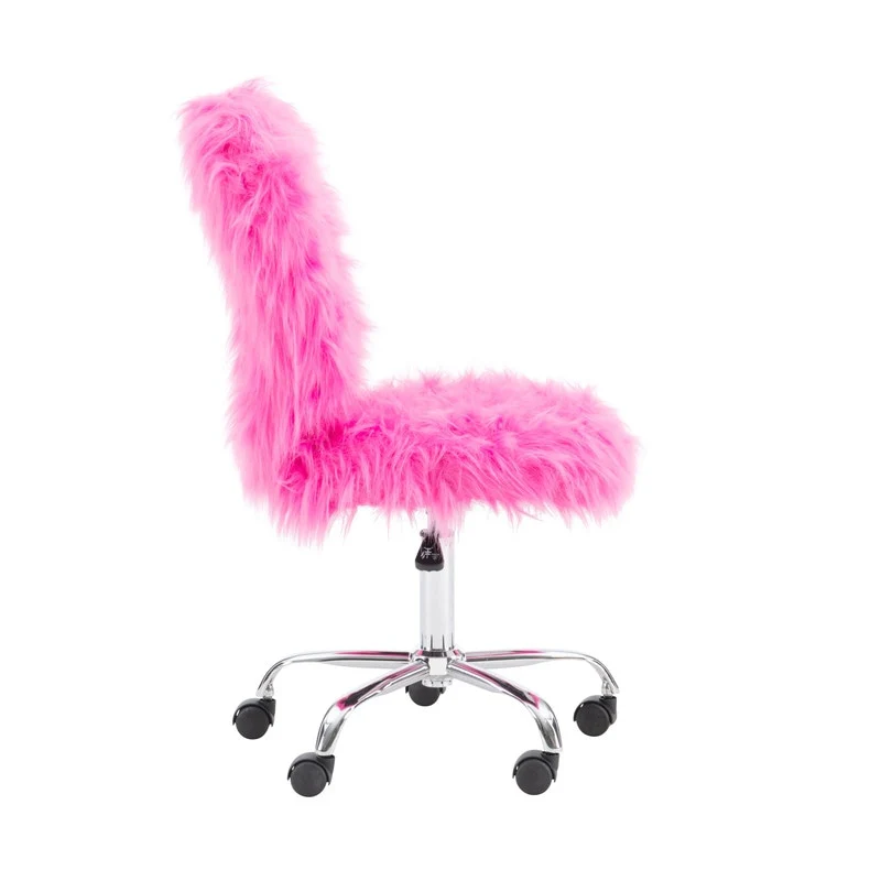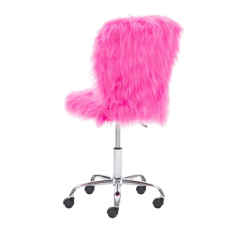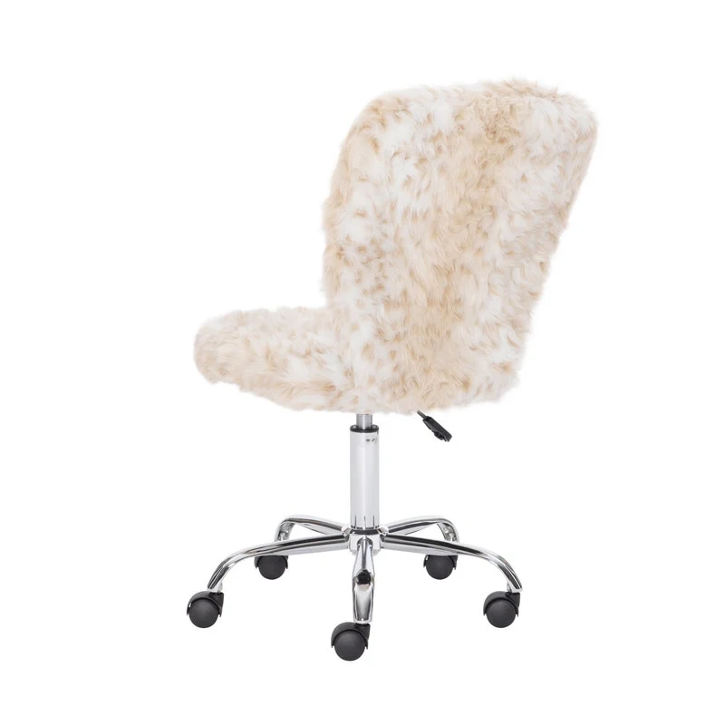Add a touch of glam to your workspace with the Clara Faux Fur Armless Office Chair by Cara. This chair features soft faux fur upholstery and a sleek silver chrome base, providing both style and comfort. With easy roll casters and a gas lift adjustable seat, you can customize your workspace to fit your needs. Available in off-white, pink, blush, and snow leopard.