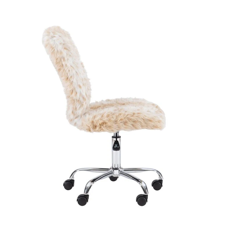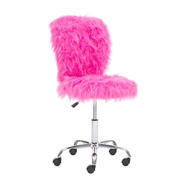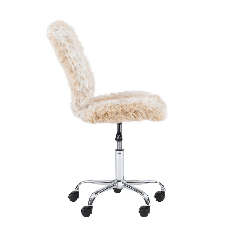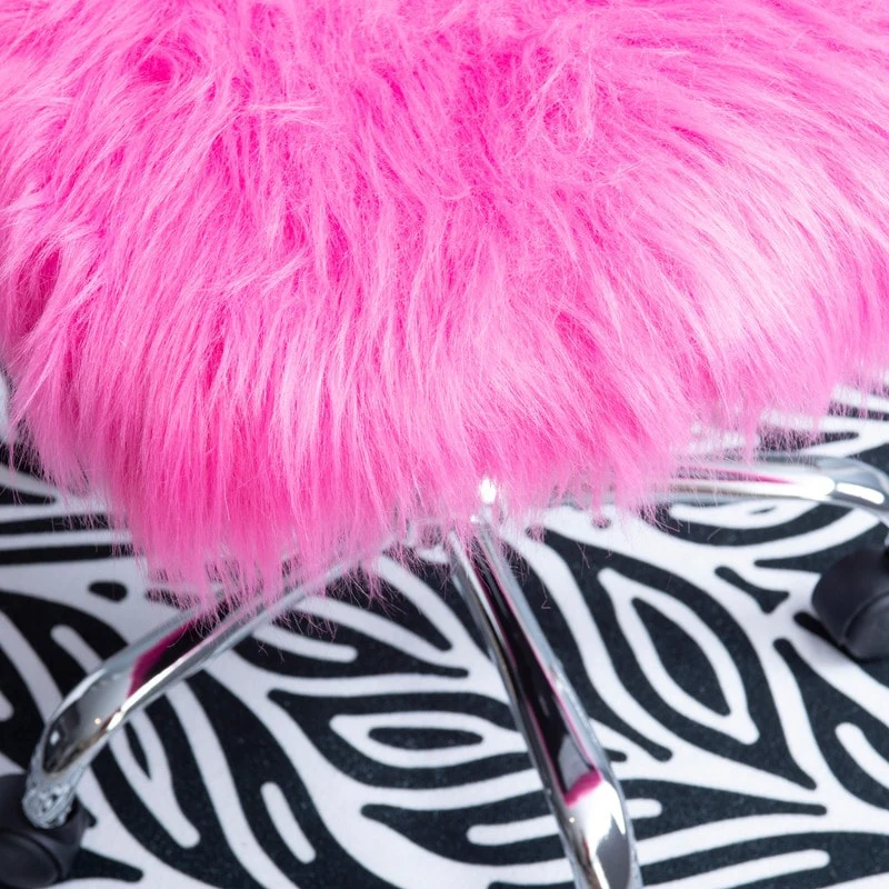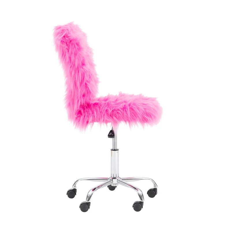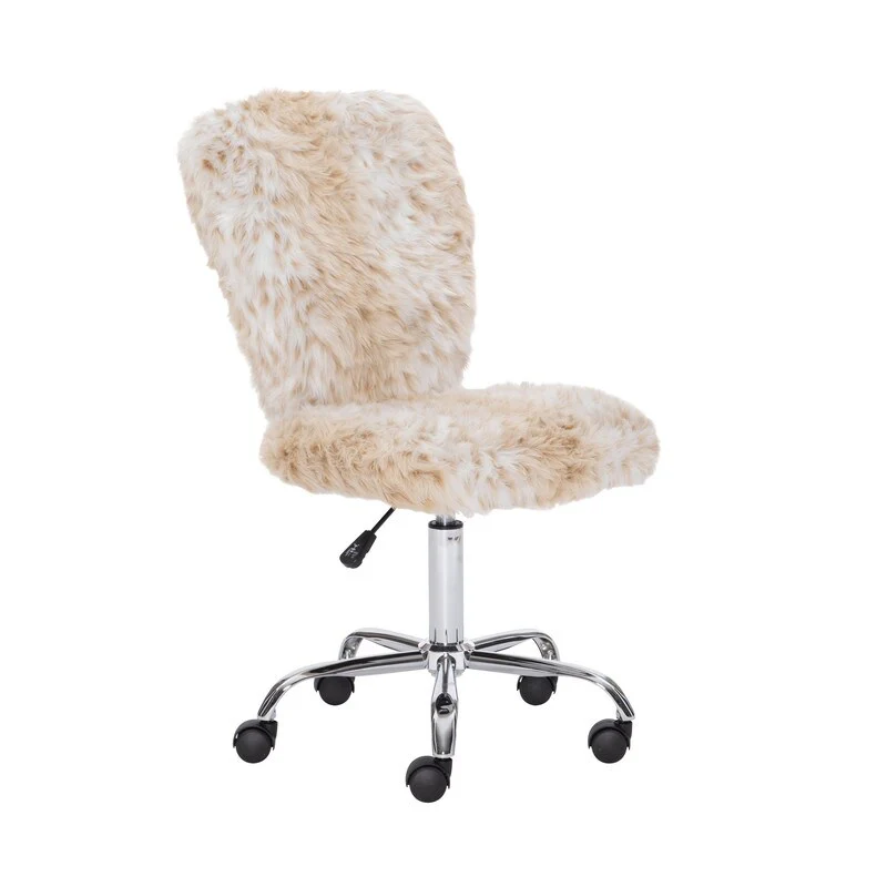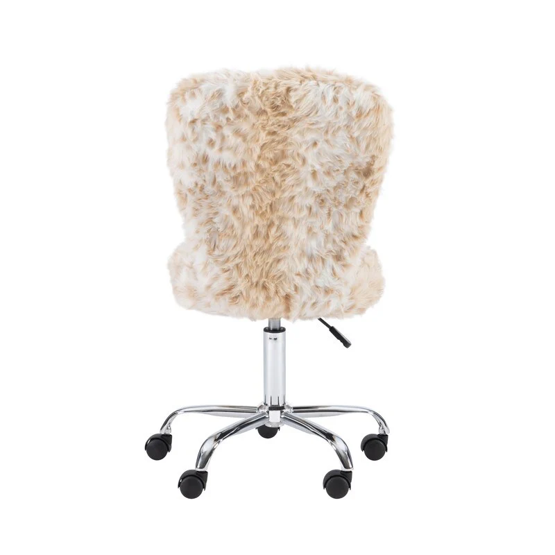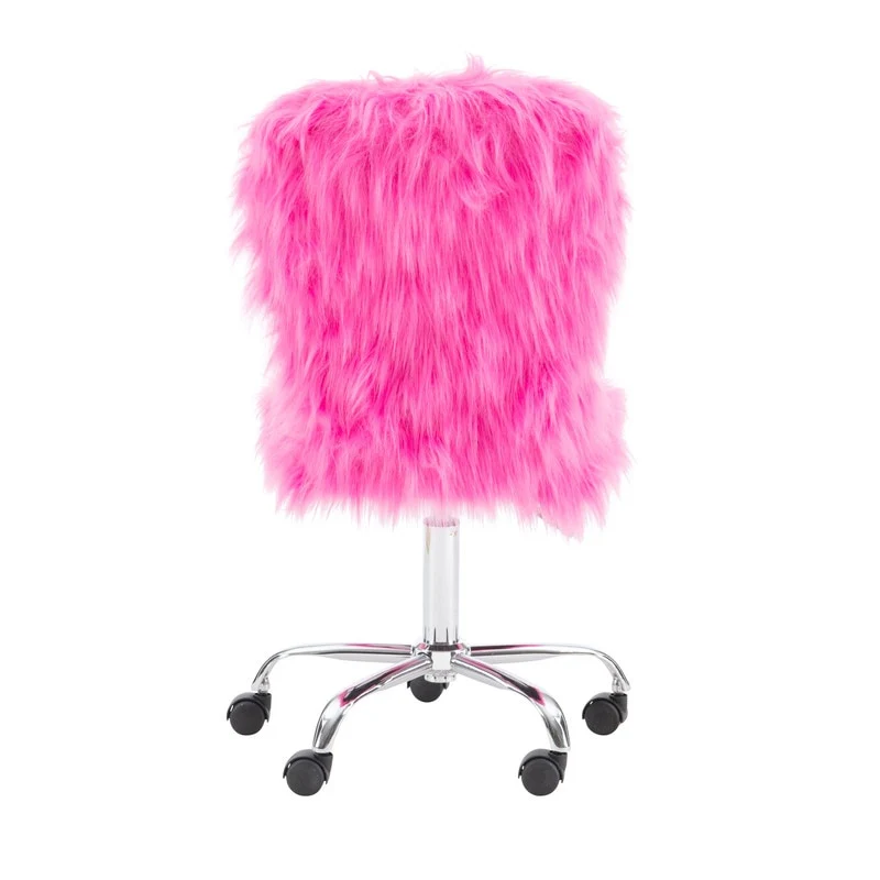 Add a touch of glam to your workspace with the Clara Faux Fur Armless Office Chair by Cara. This chair features soft faux fur upholstery and a sleek silver chrome base, providing both style and comfort. With easy roll casters and a gas lift adjustable seat, you can customize your workspace to fit your needs. Available in off-white, pink, blush, and snow leopard.