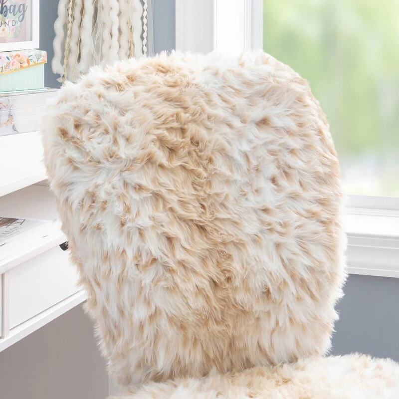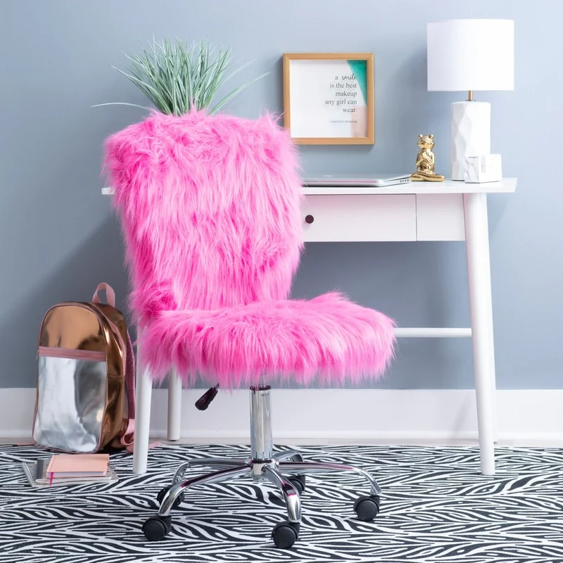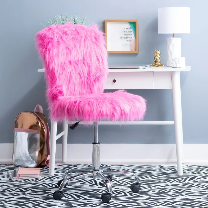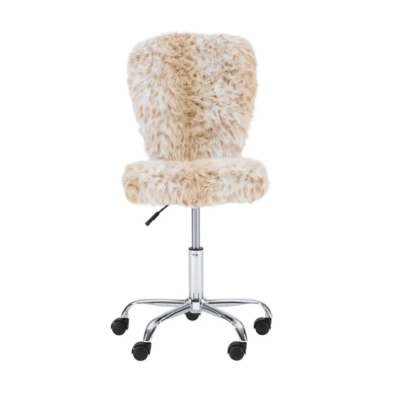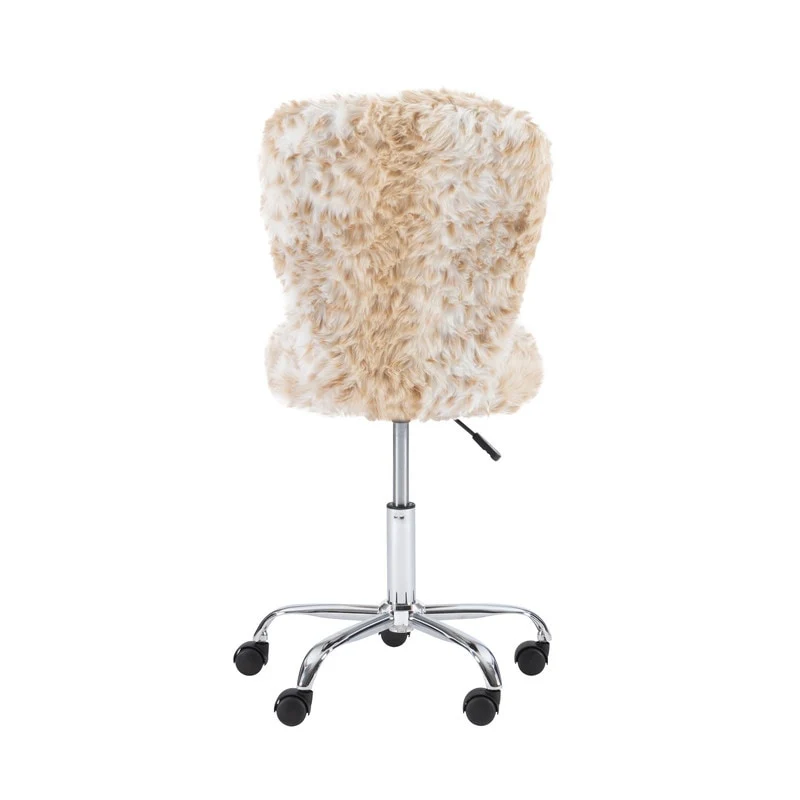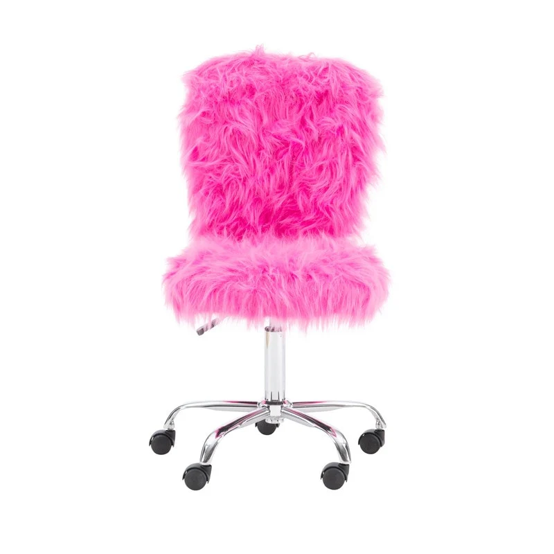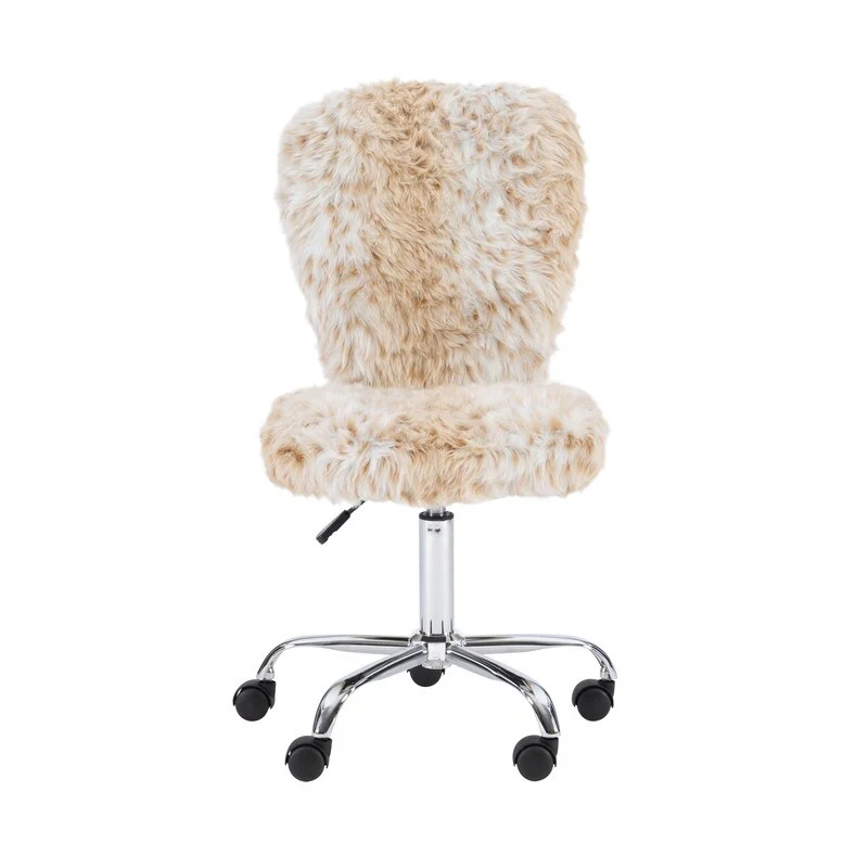Add a touch of glam to your workspace with the Clara Faux Fur Armless Office Chair by Cara. This chair features soft faux fur upholstery and a sleek silver chrome base, providing both style and comfort. With easy roll casters and a gas lift adjustable seat, you can customize your workspace to fit your needs. Available in off-white, pink, blush, and snow leopard.